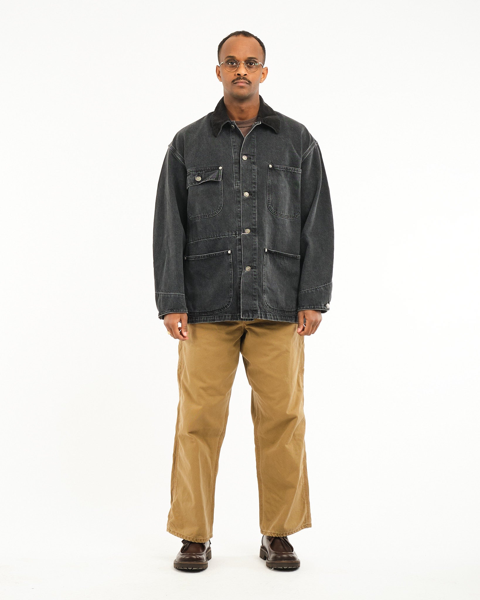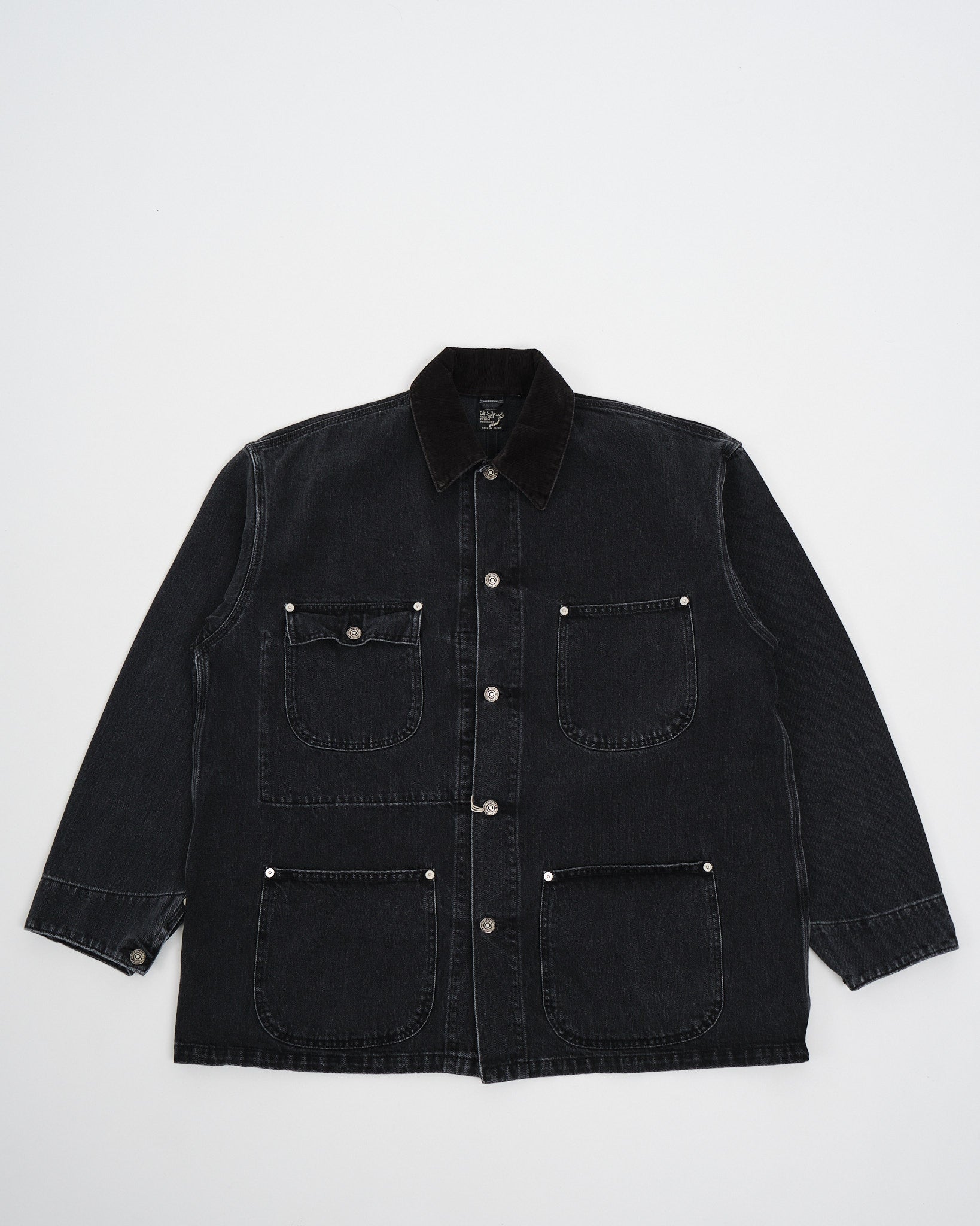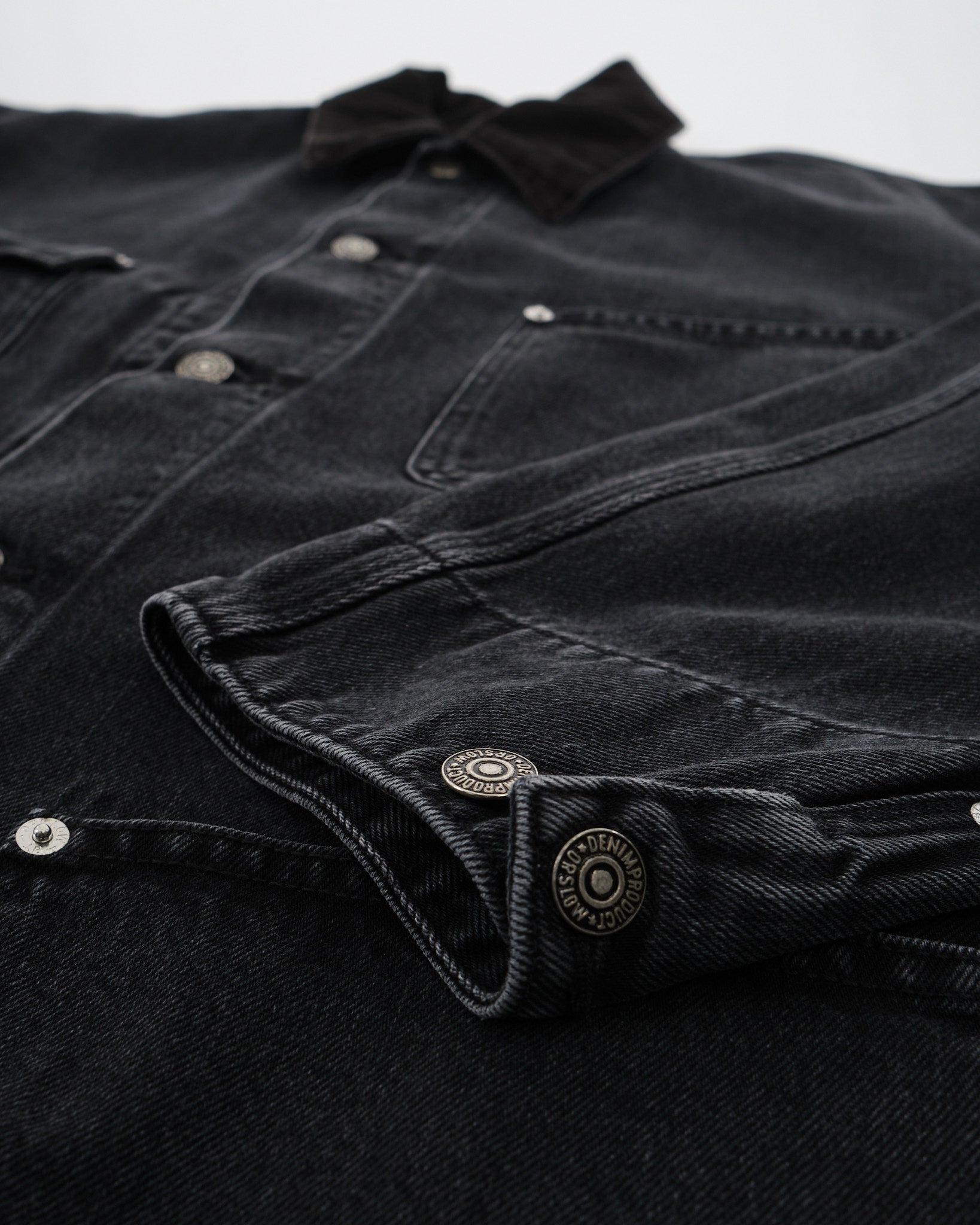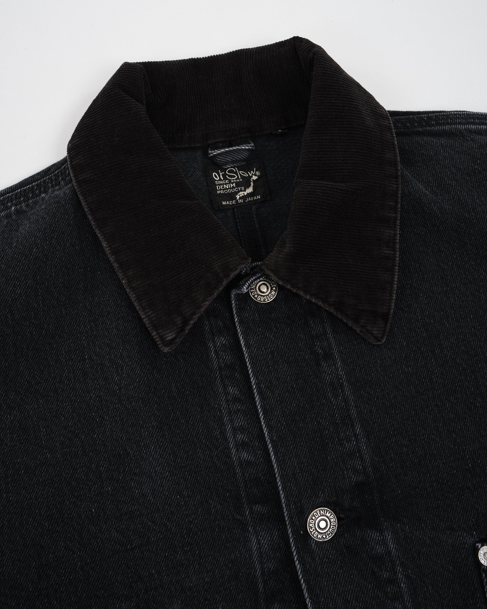 Den løstsiddende arbejdsdragt i sort denim stone (Stilkode: 01-6034-D61S) er en moderne tilgang til den traditionelle arbejdsdragt, som har et mere afslappet og casual  fit, som om den var inspireret af 90'erne. Fremstillet af 12,5 oz  sort denim med en stenvasket finish, genskaber den udseendet af en velbrugt  denimjakke. Den har også en fløjlskrave for at give den noget tekstur og kontrast,  samt mærkede orSlow messingknapper, hvilket får den til at se ud som et originalt stykke. Denne arbejdsdragt har  et afslappet fit, som gør det nemt at have den på over andre beklædningsgenstande, og den kan bæres på forskellige måder og på  forskellige tider af året. Denne arbejdsdragt er et perfekt eksempel på orSlows opmærksomhed på detaljer  i skabelsen af højkvalitetstøj, der aldrig går af mode.