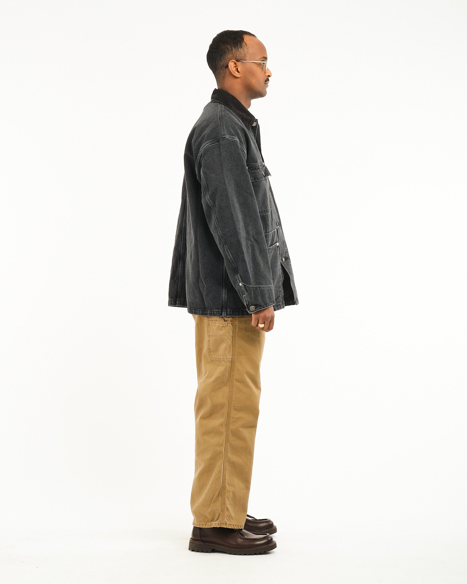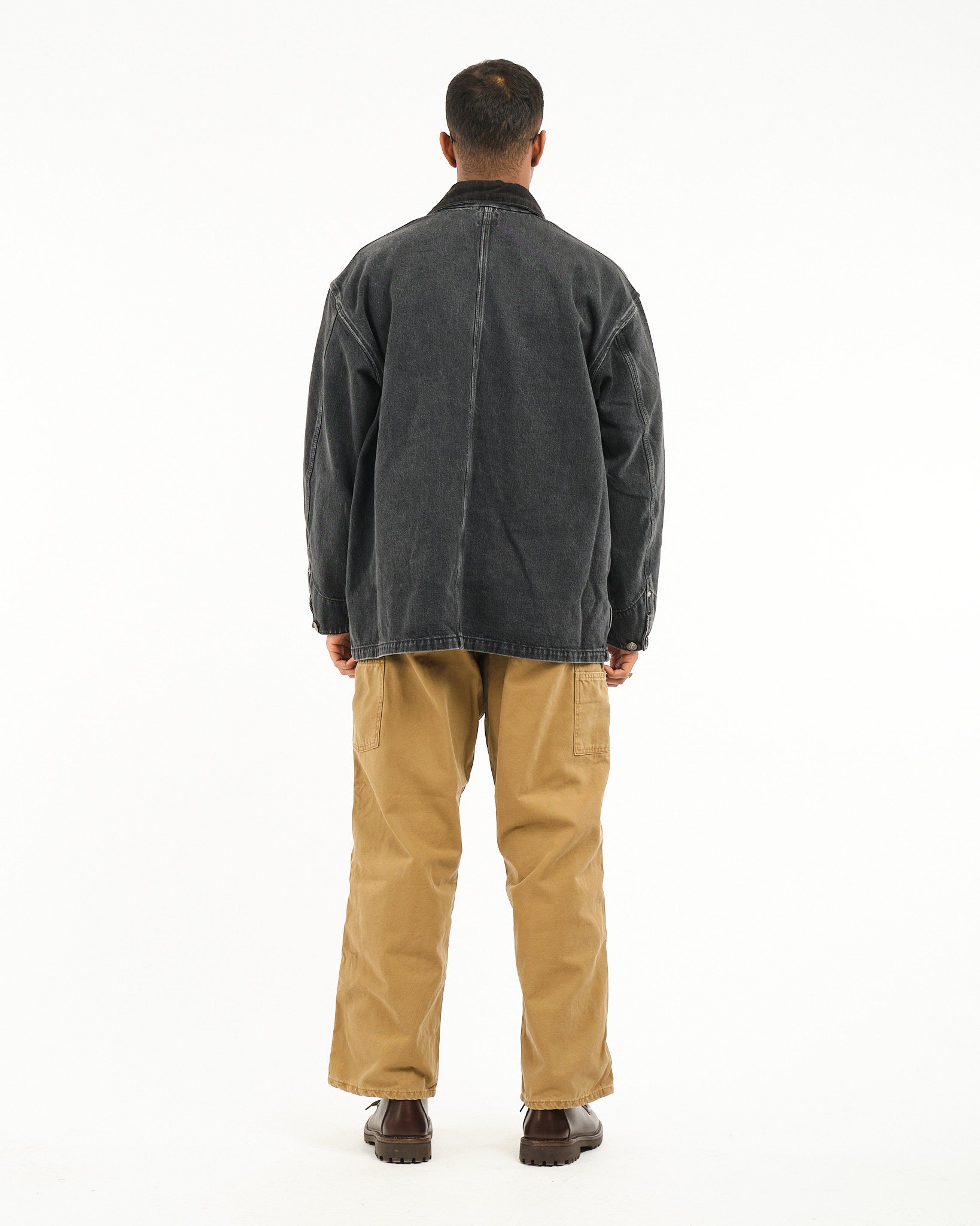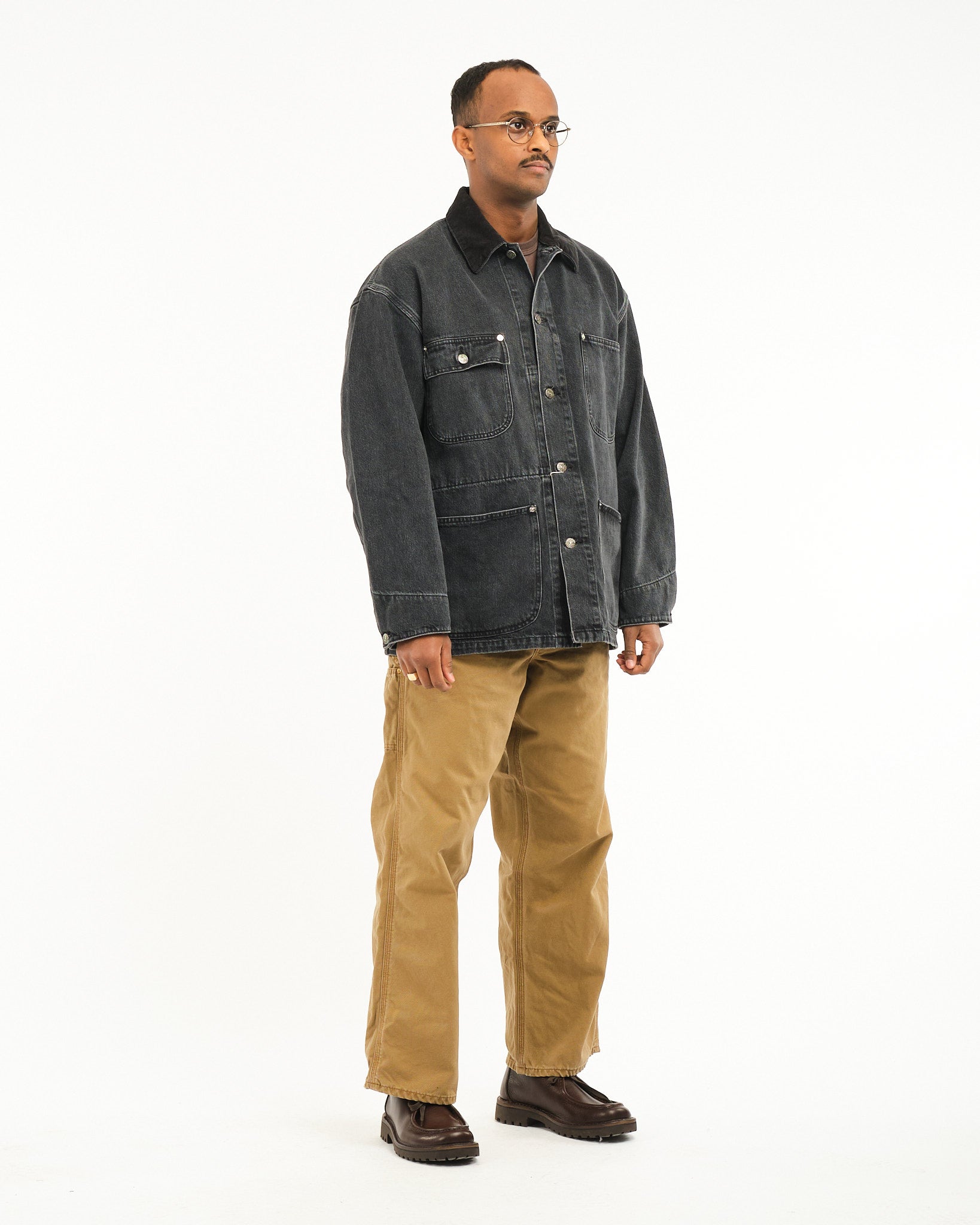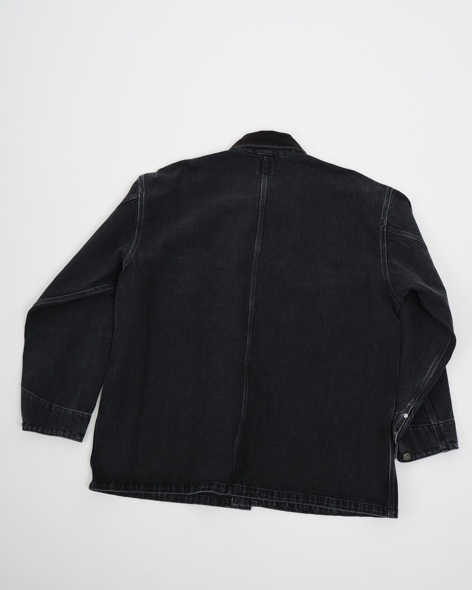 Den løstsiddende arbejdsdragt i sort denim stone (Stilkode: 01-6034-D61S) er en moderne tilgang til den traditionelle arbejdsdragt, som har et mere afslappet og casual  fit, som om den var inspireret af 90'erne. Fremstillet af 12,5 oz  sort denim med en stenvasket finish, genskaber den udseendet af en velbrugt  denimjakke. Den har også en fløjlskrave for at give den noget tekstur og kontrast,  samt mærkede orSlow messingknapper, hvilket får den til at se ud som et originalt stykke. Denne arbejdsdragt har  et afslappet fit, som gør det nemt at have den på over andre beklædningsgenstande, og den kan bæres på forskellige måder og på  forskellige tider af året. Denne arbejdsdragt er et perfekt eksempel på orSlows opmærksomhed på detaljer  i skabelsen af højkvalitetstøj, der aldrig går af mode.