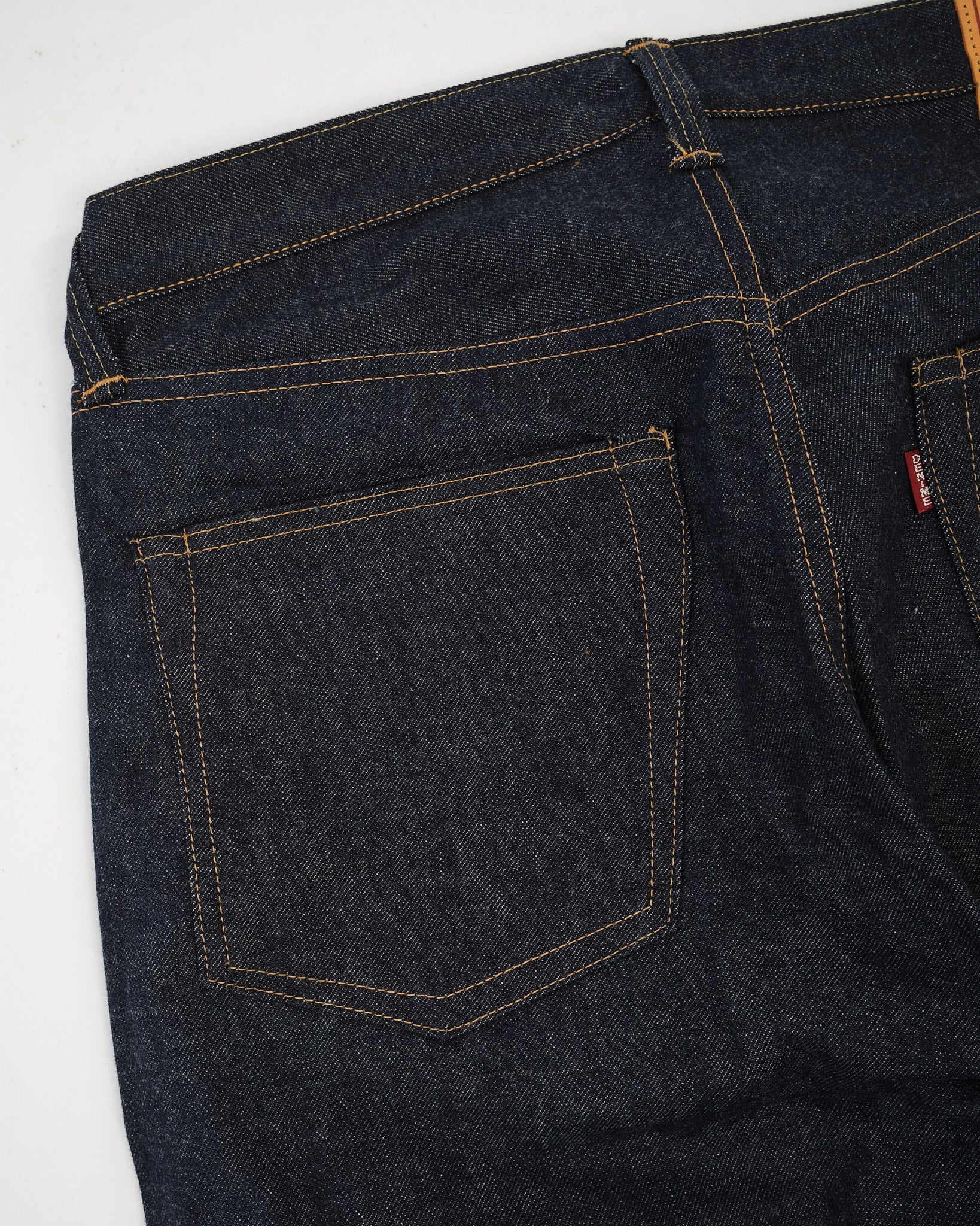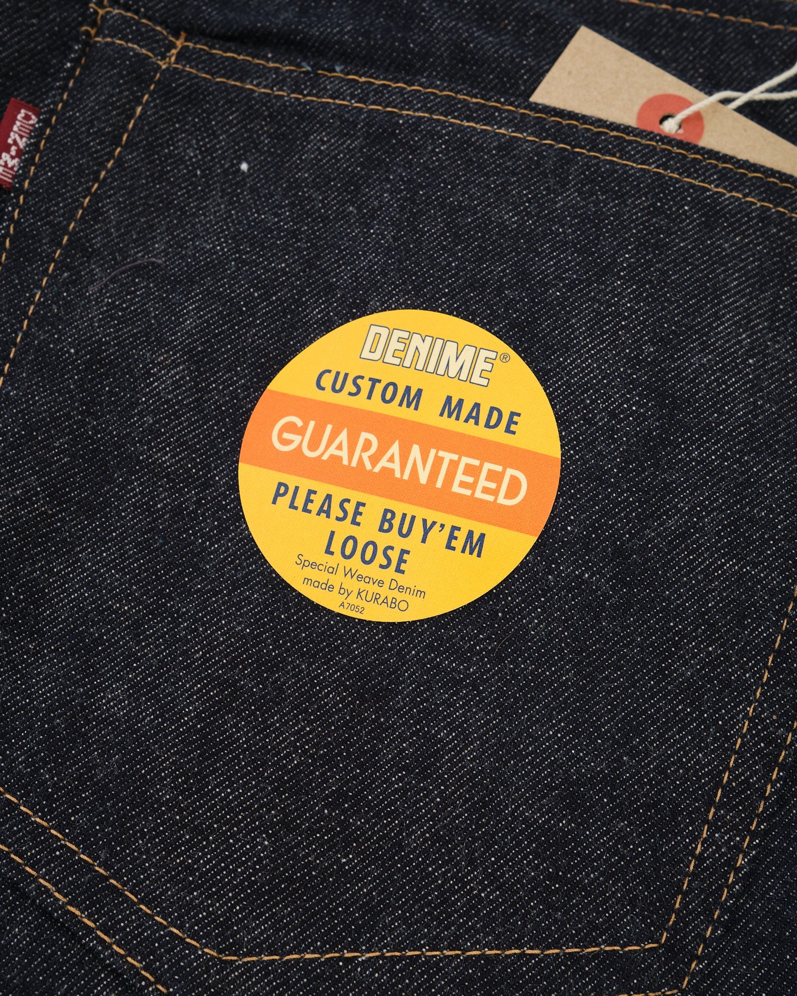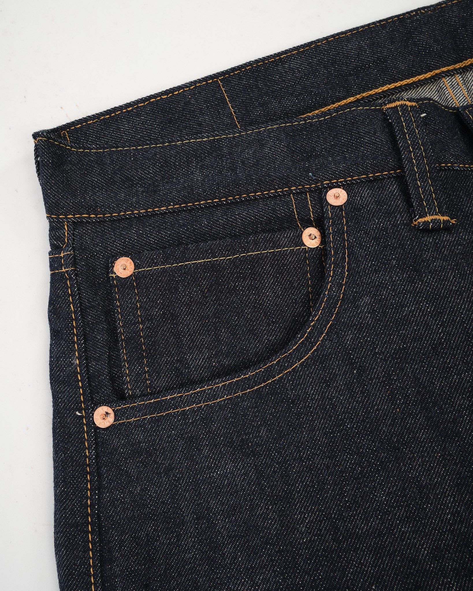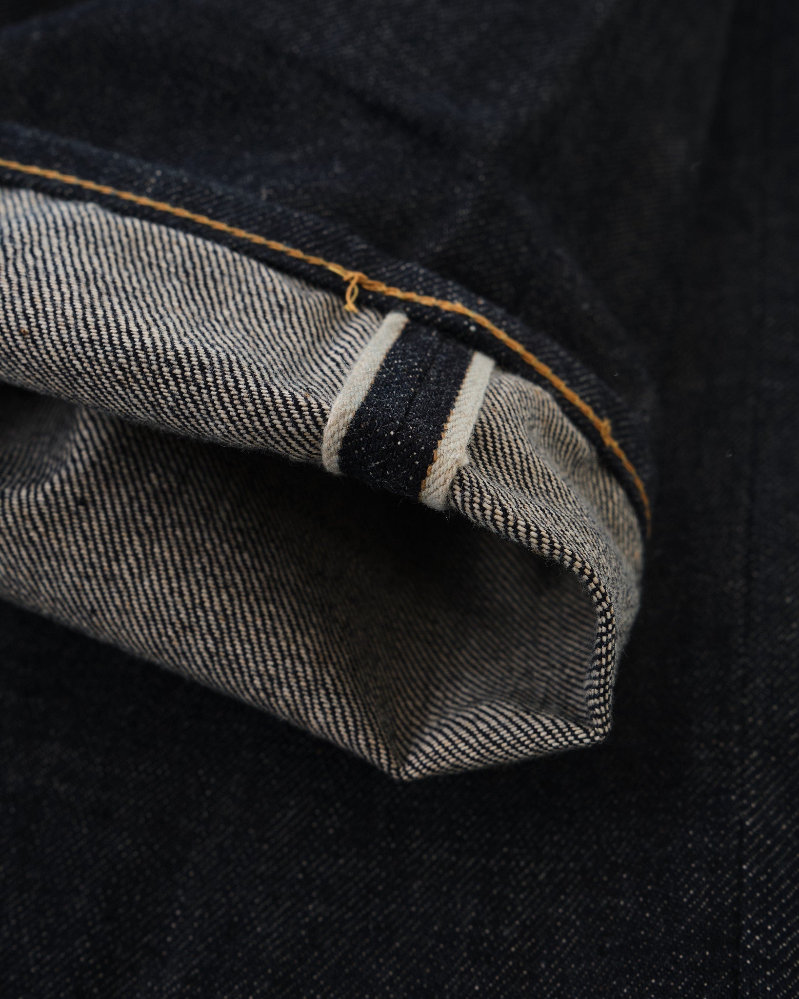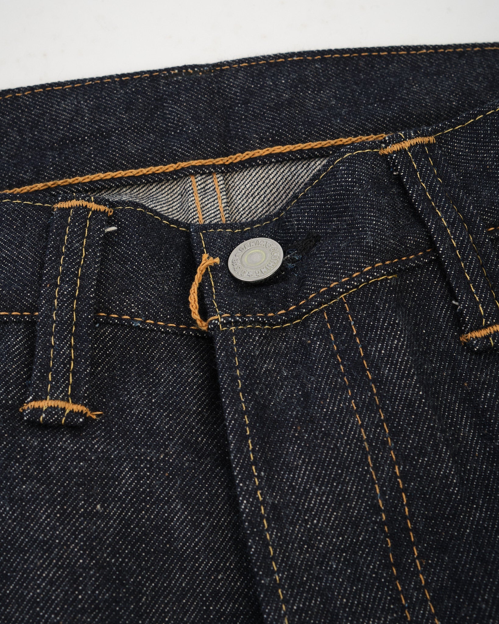 100% Bomuld Selvedge Denim: Fremstillet med førsteklasses stof fra Kurabo Denim Mills, og den kommer endda med en hvid-gyldenbrun selvedge.