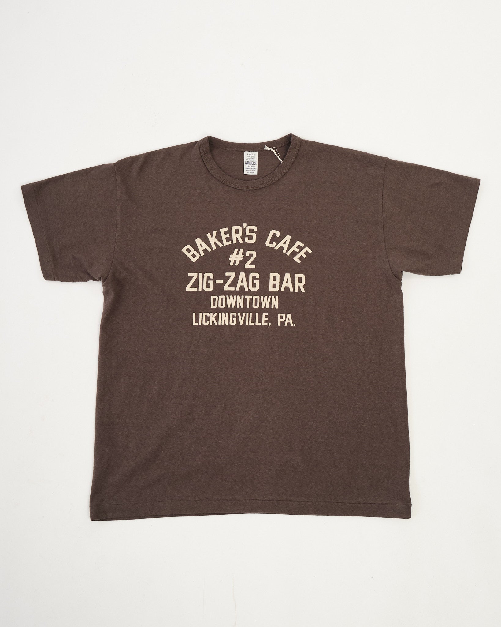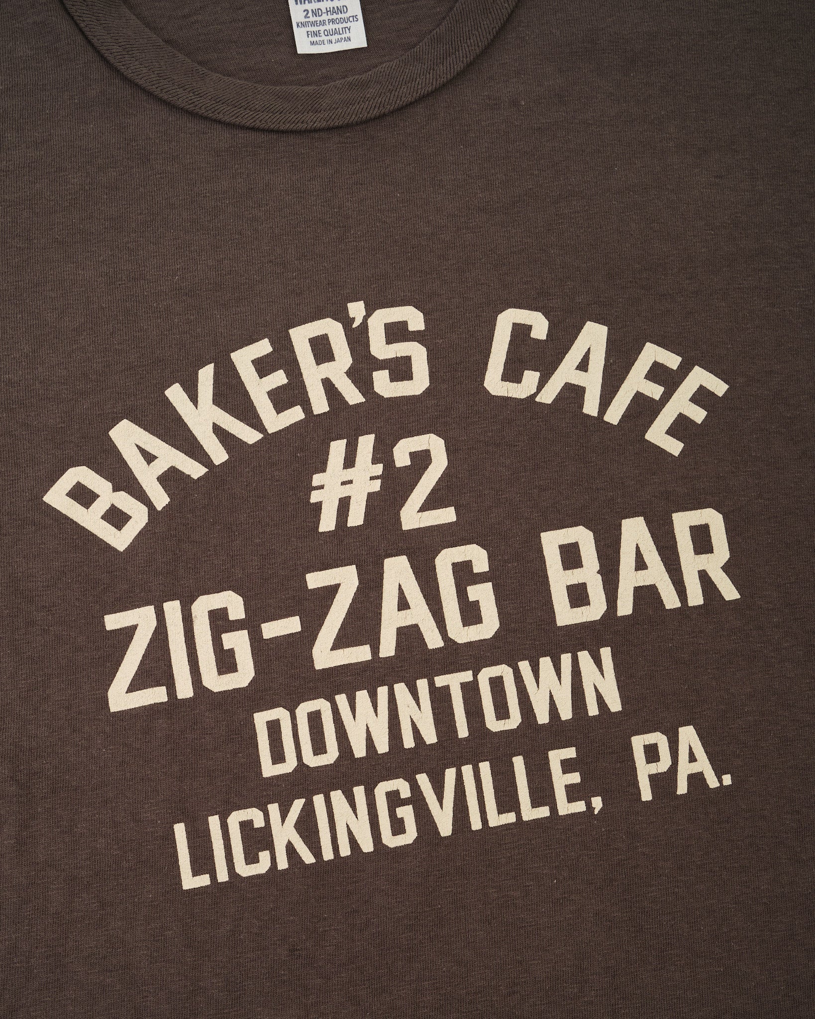 Detaljer inkluderer en moderat løs halsudskæring, en krop med en naturligt falmet tone, og et slidt “Zig-Zag Bar” print, der føles helt på sin plads på en original fra midten af århundredet. Den børstede finish bidrager til den slidte tekstur, hvilket giver T-shirten en autentisk genbrugsfornemmelse lige fra dag ét.