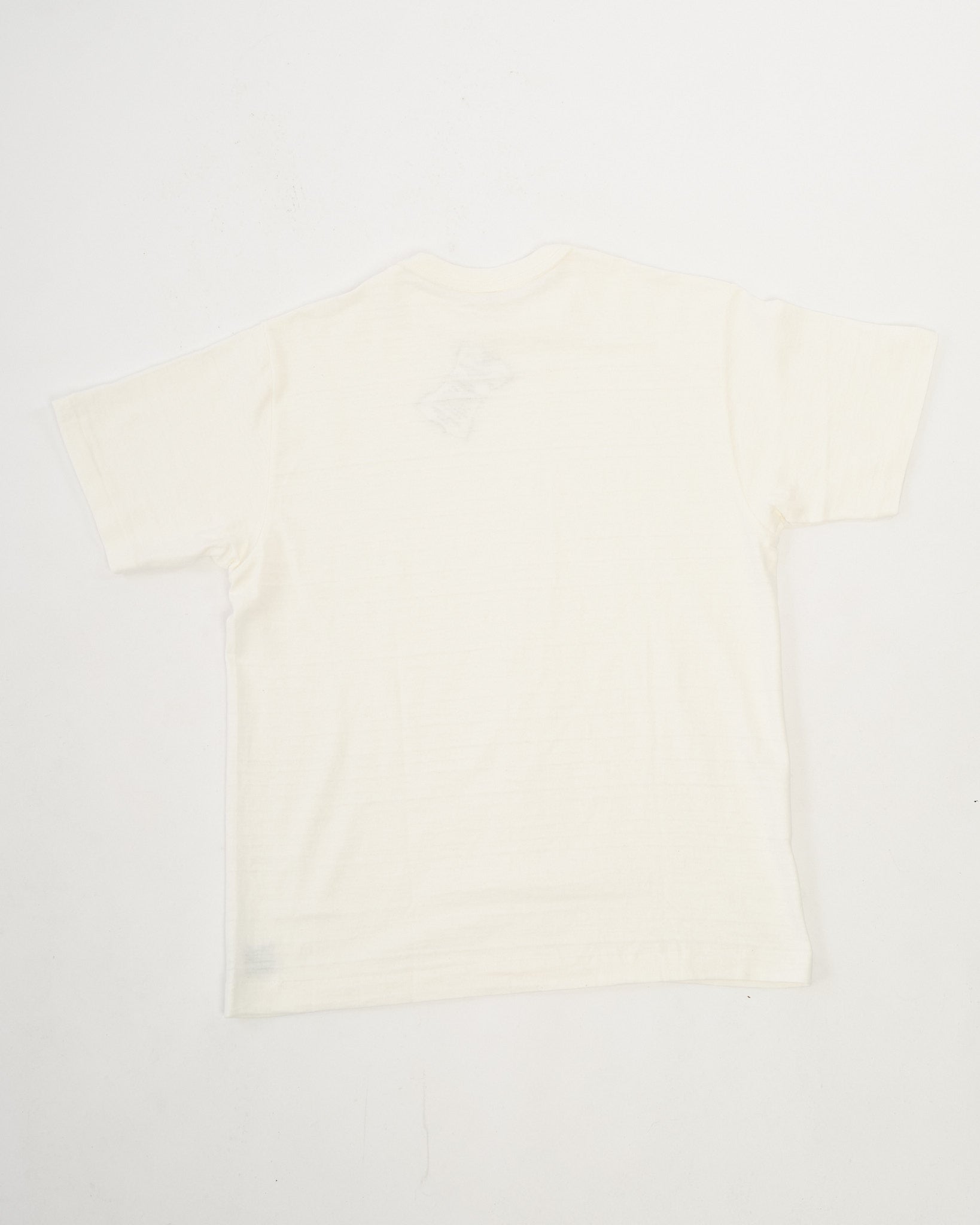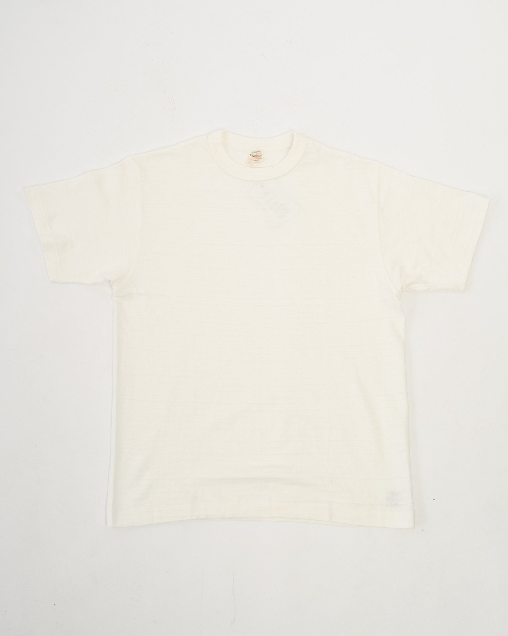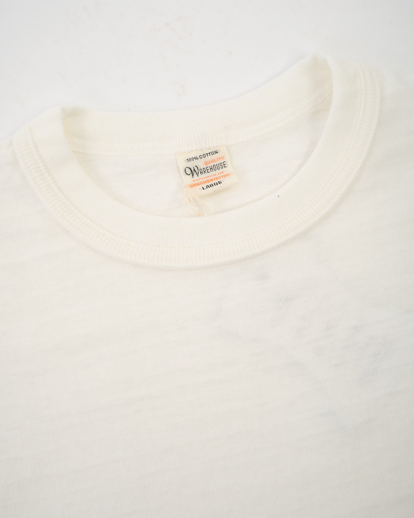 WAREHOUSE Lot 4601 T-shirten i Offwhite er en tidløs essentiel, fremstillet af premium slubet bomuld. Med sin bløde tekstur og behagelige pasform inkarnerer denne ensfarvede t-shirt vintage kvalitet og daglig alsidighed. Uanset om den bæres som et baselag eller for sig selv, leverer den både holdbarhed og klassisk stil. Et must-have grundelement for enhver garderobe.