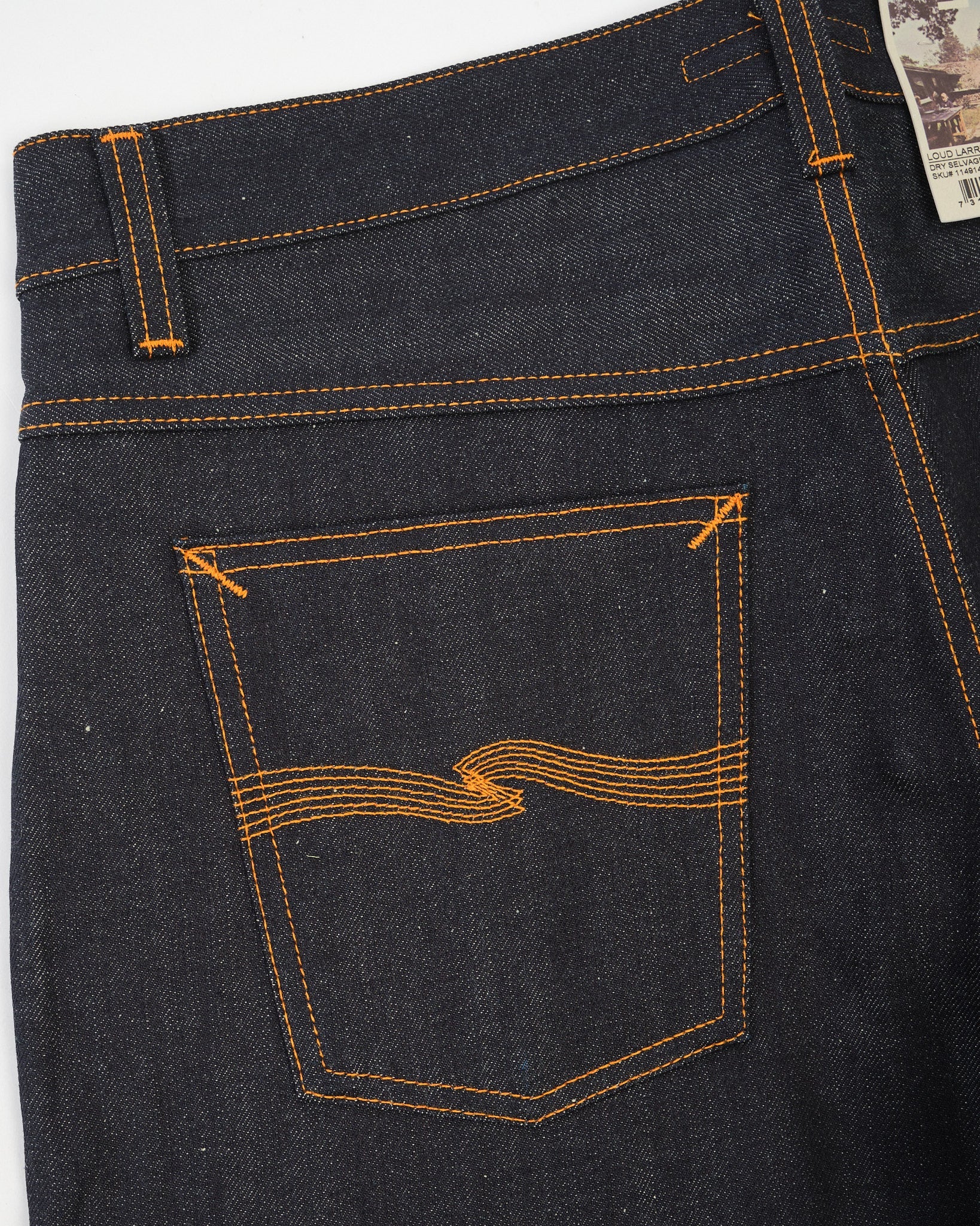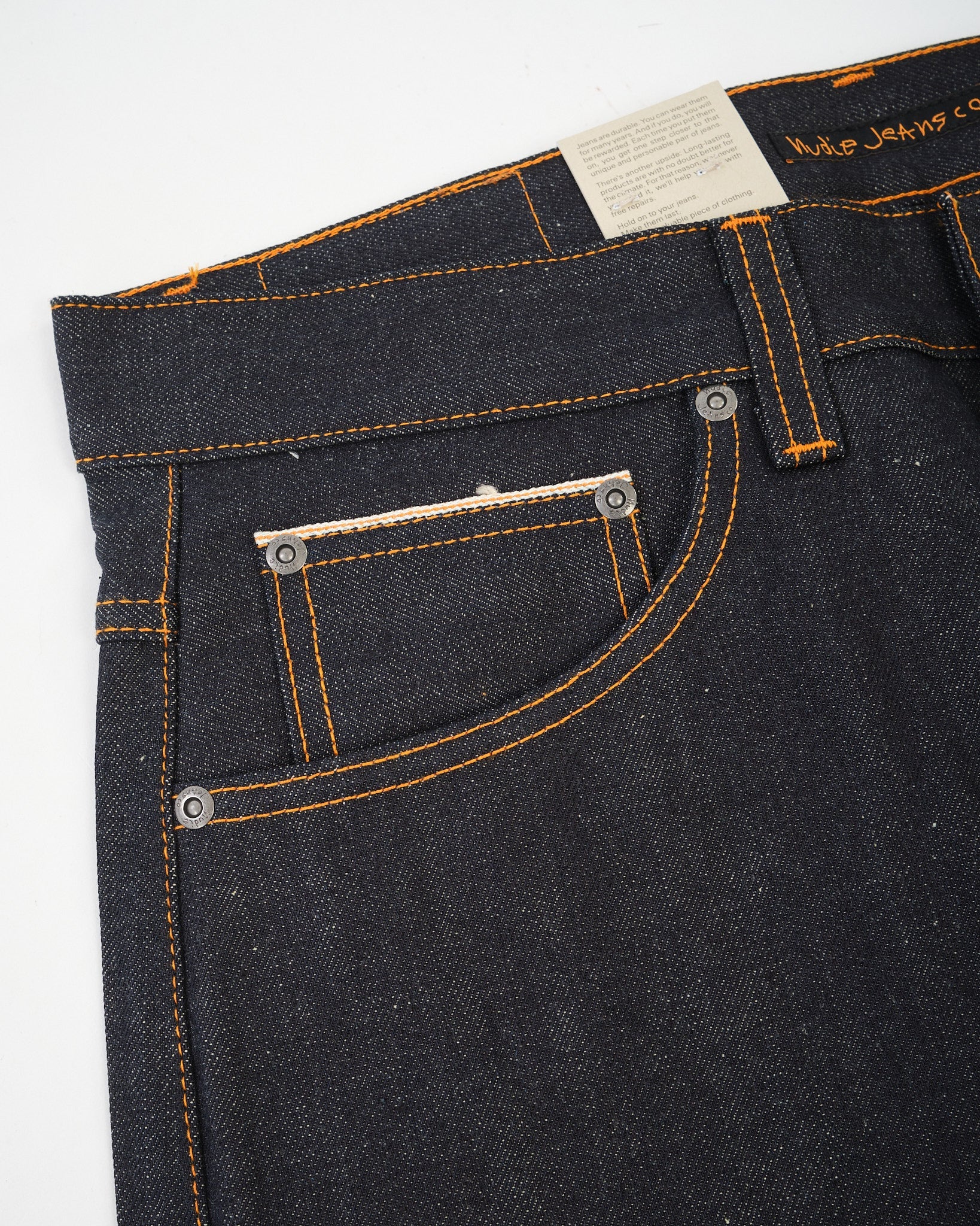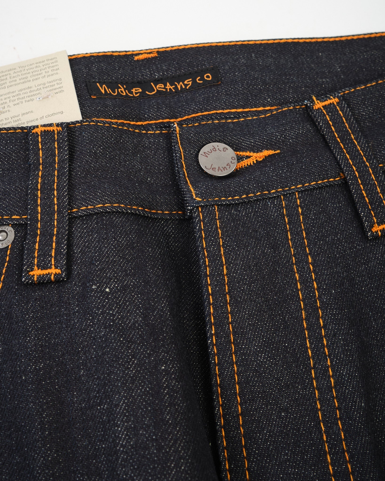 • Orange tråd på alle sømme – klassisk Nudie signatur