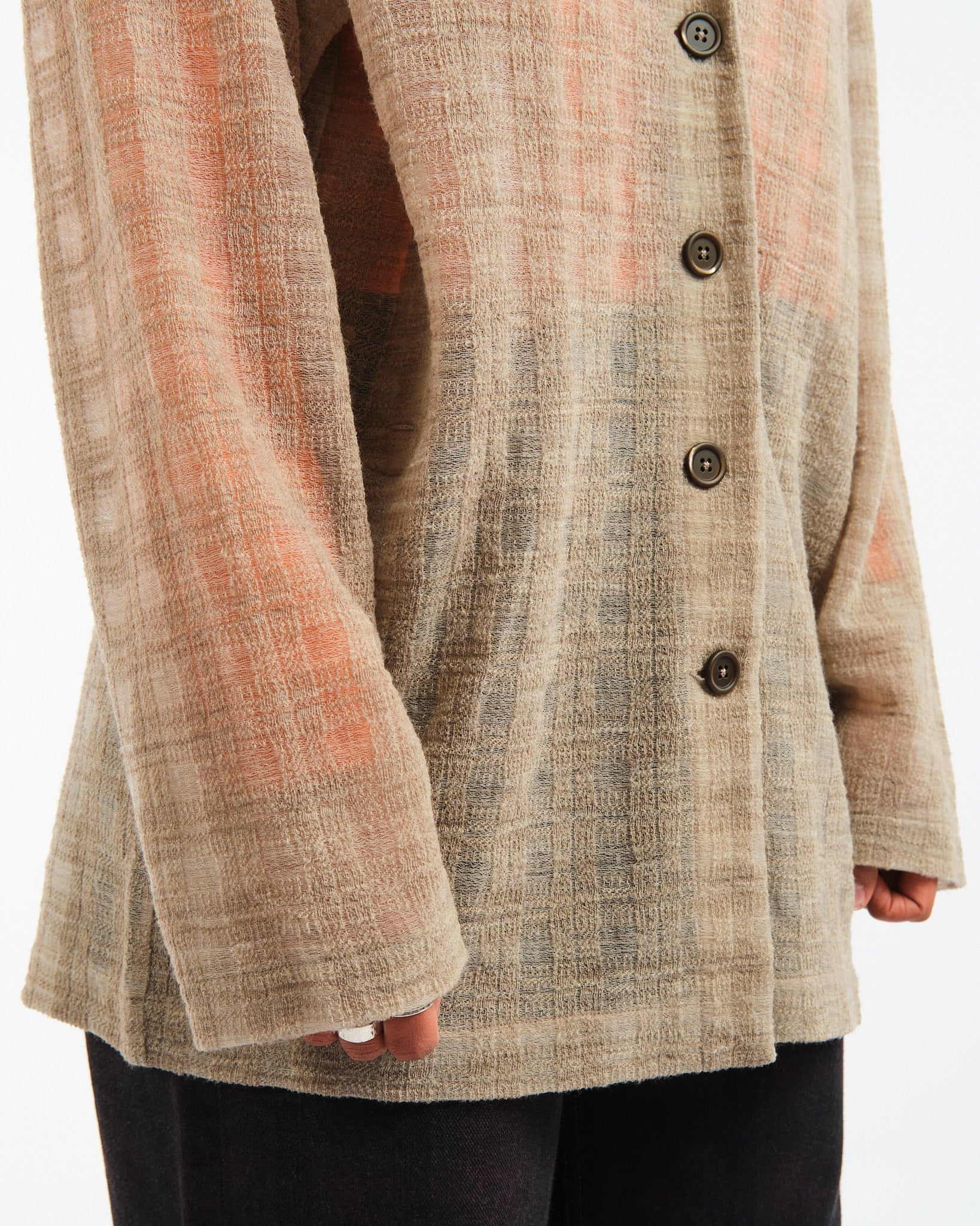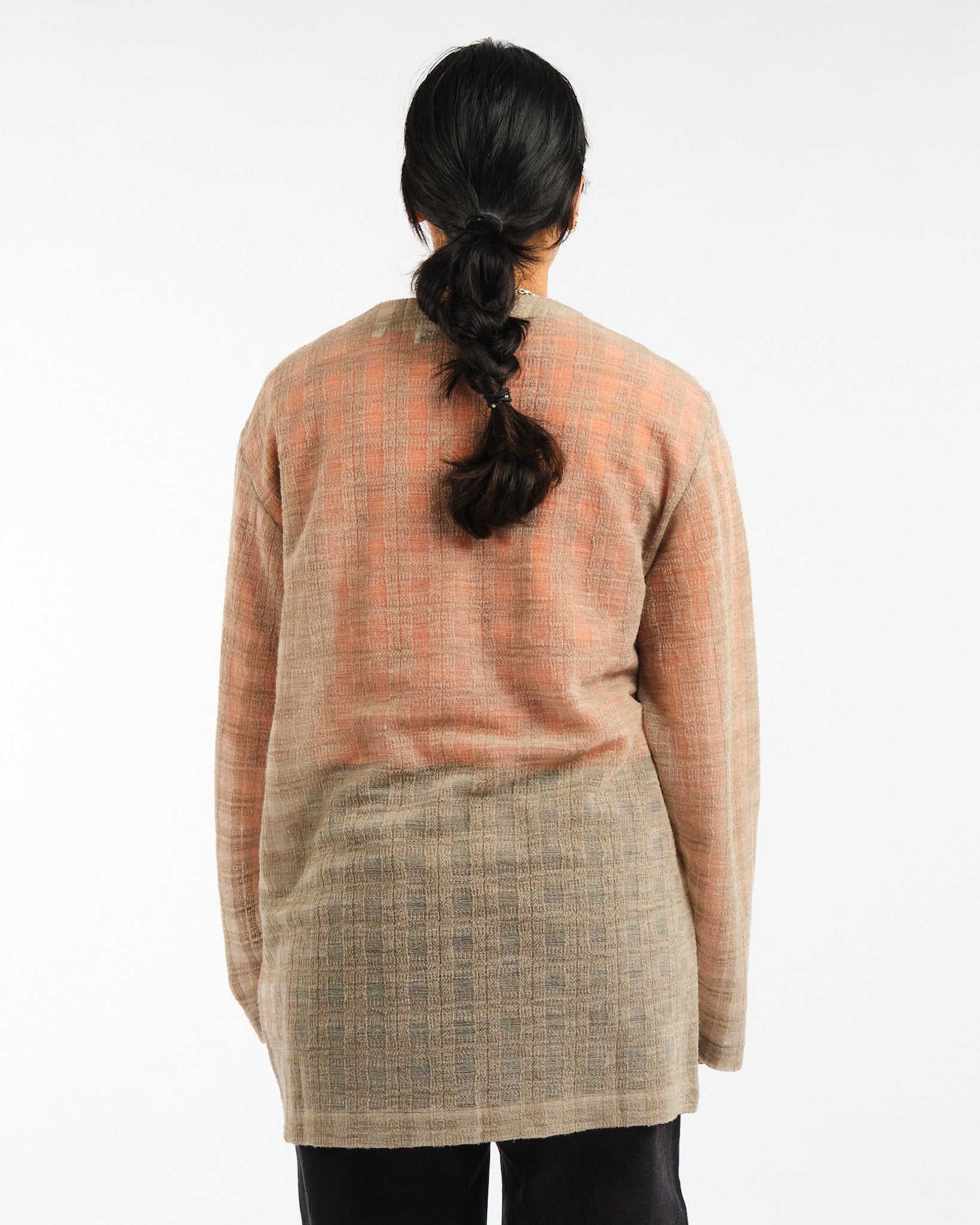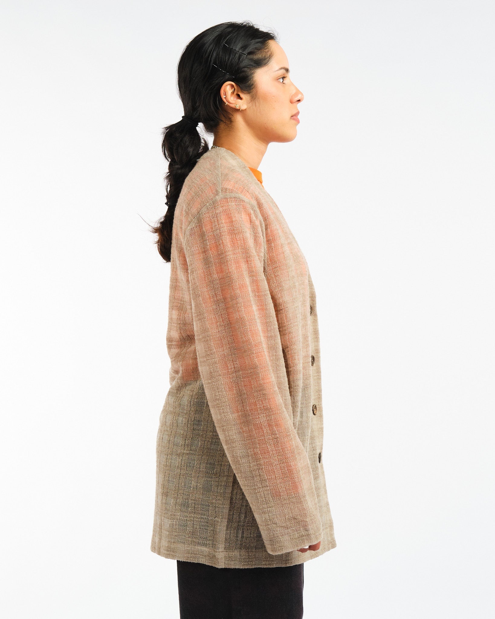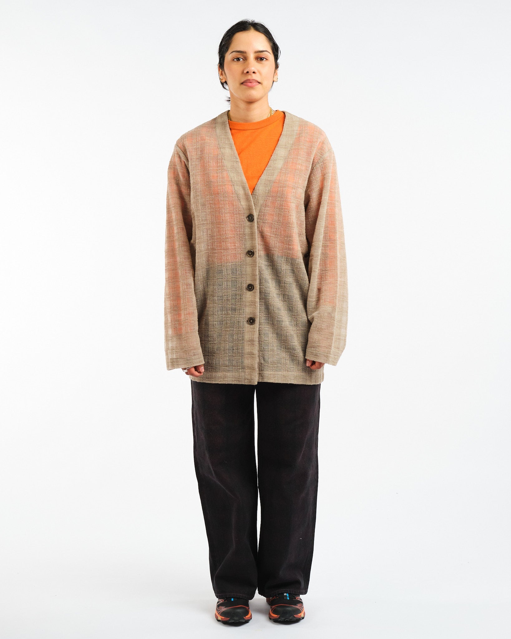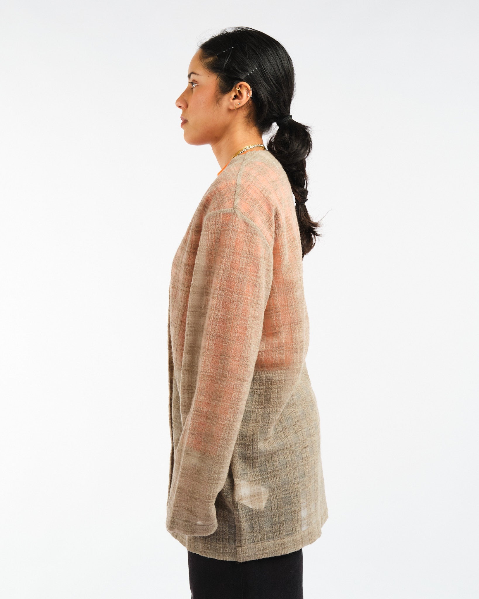 Dette beklædningsstykke er skabt med et specielt materiale, der har unikke egenskaber og er udvalgt med omhu. Når bæreren tager cardiganen på, vil den tage form efter deres skikkelse og naturligt blive slidt over tid, hvilket fuldender designprocessen.