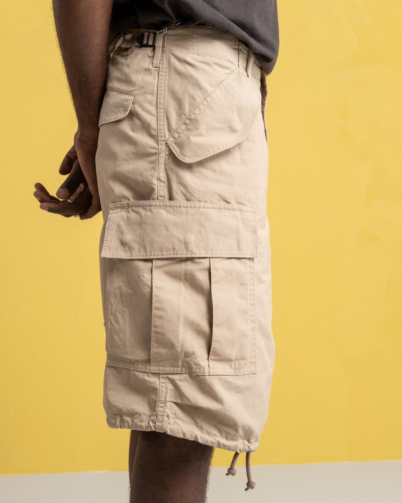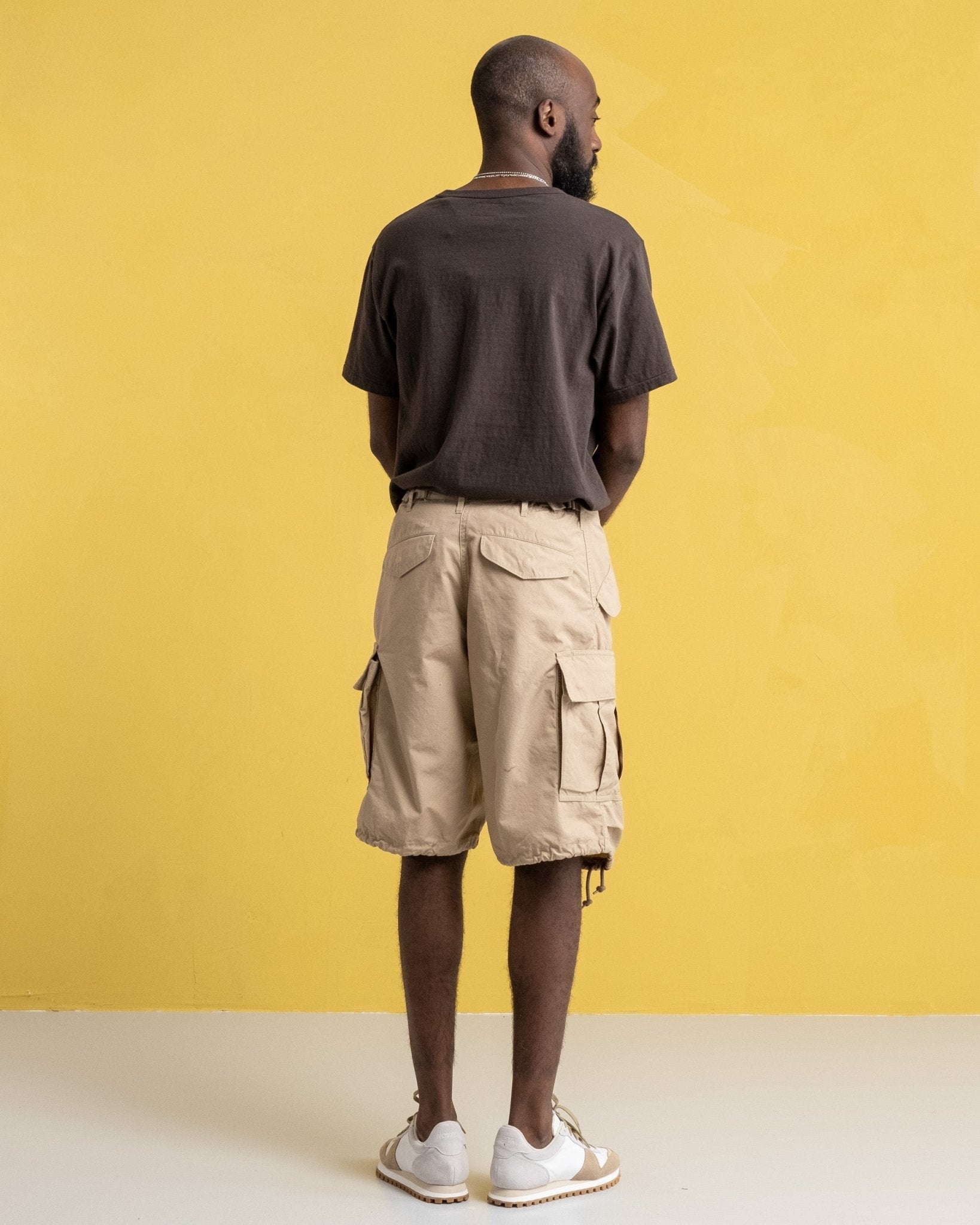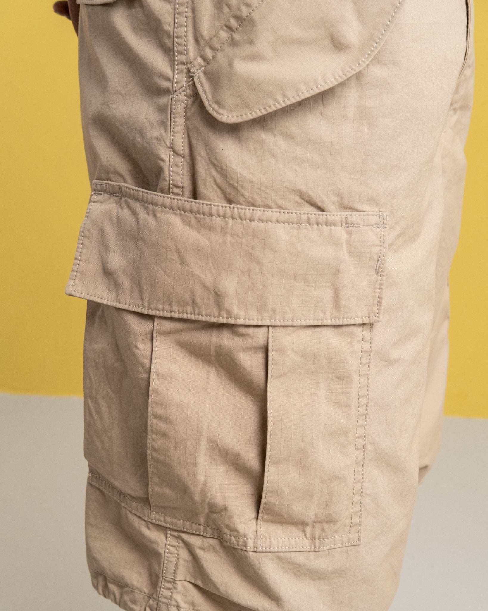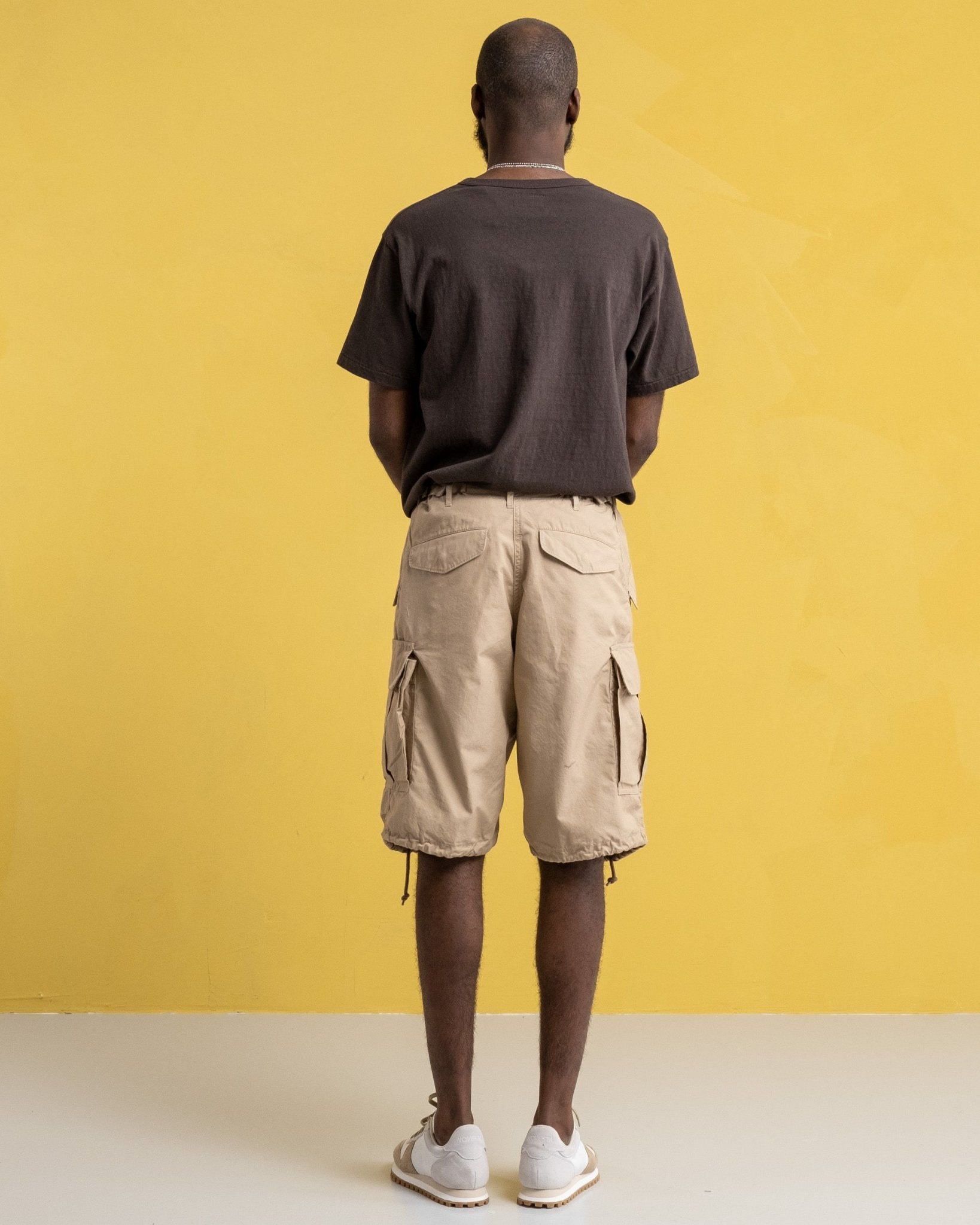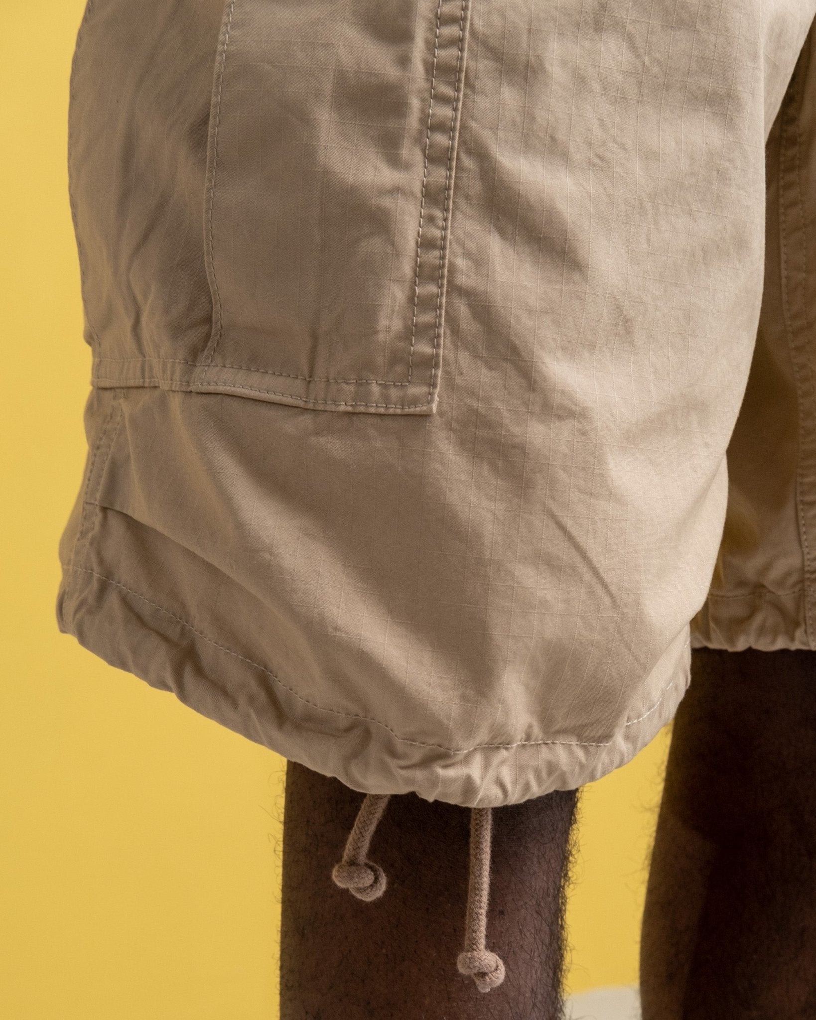 MIL 6Pocket 80/3 Ripstop Beige 20 fra Beams+. Afslappet og bred pasform cargoshorts i japansk bomuld rip-stop. Letvægt men meget holdbar! Lynlås og knaplukning med justerbar talje. Masser af lommer og et par skjulte indvendige lommer. Kanterne kan også justeres via snoretræk. Fremstillet i Kina.