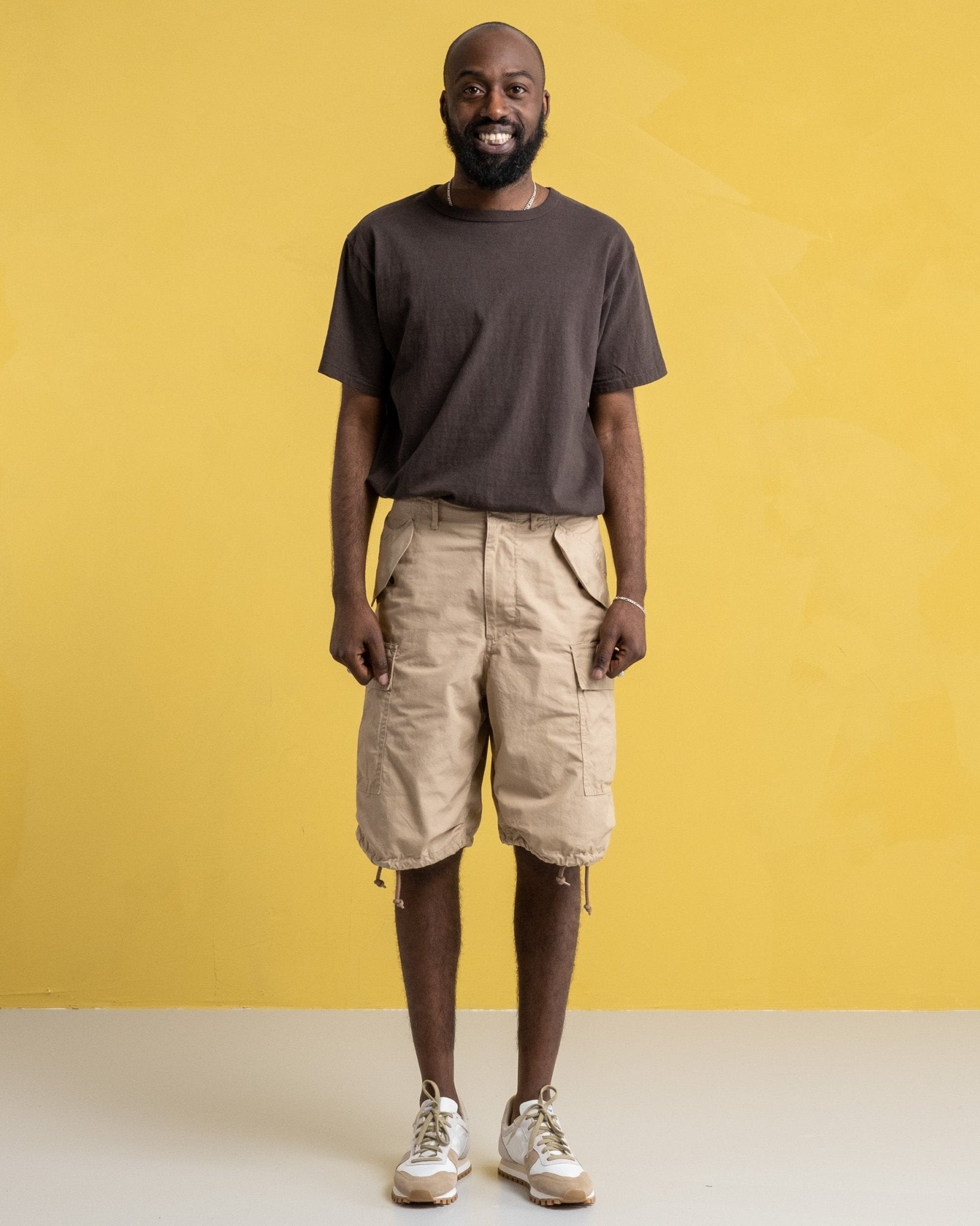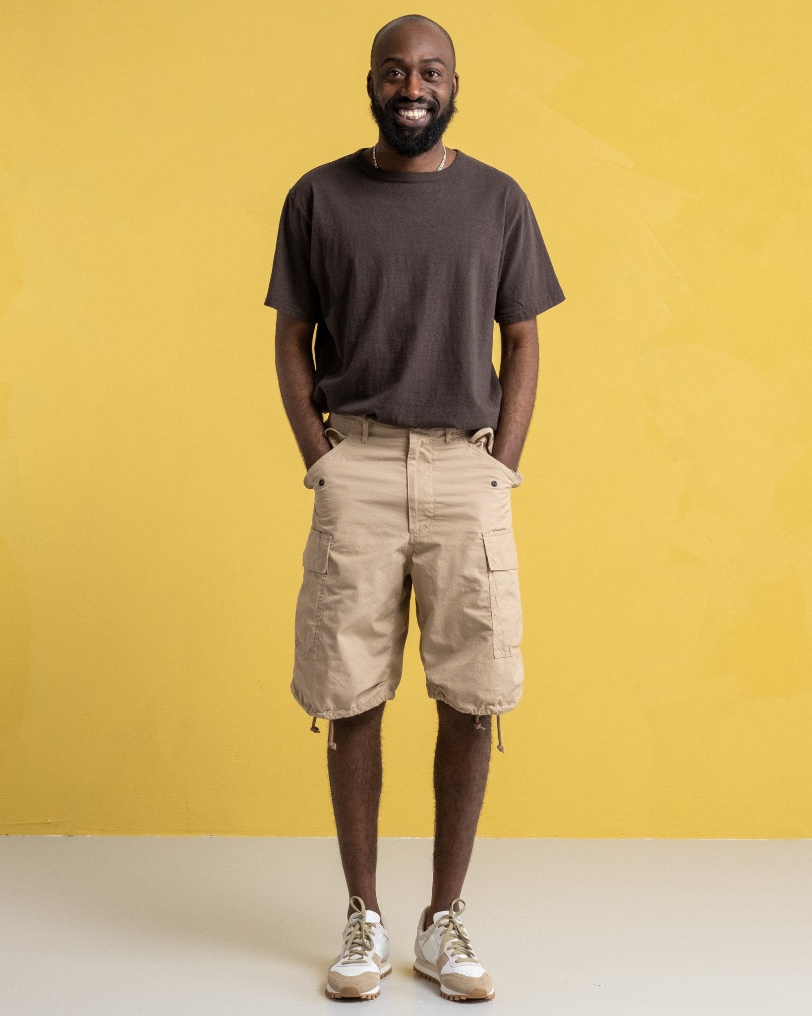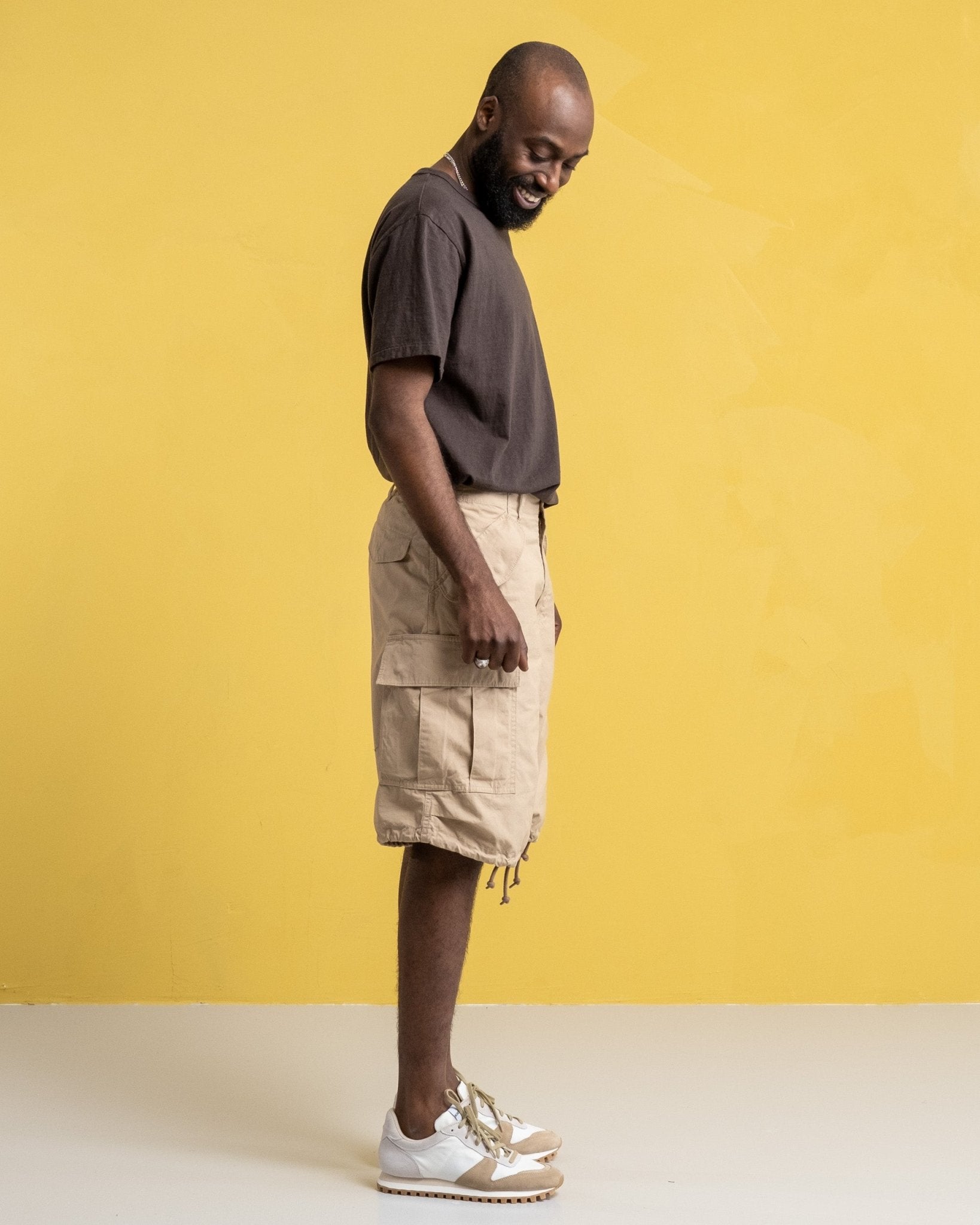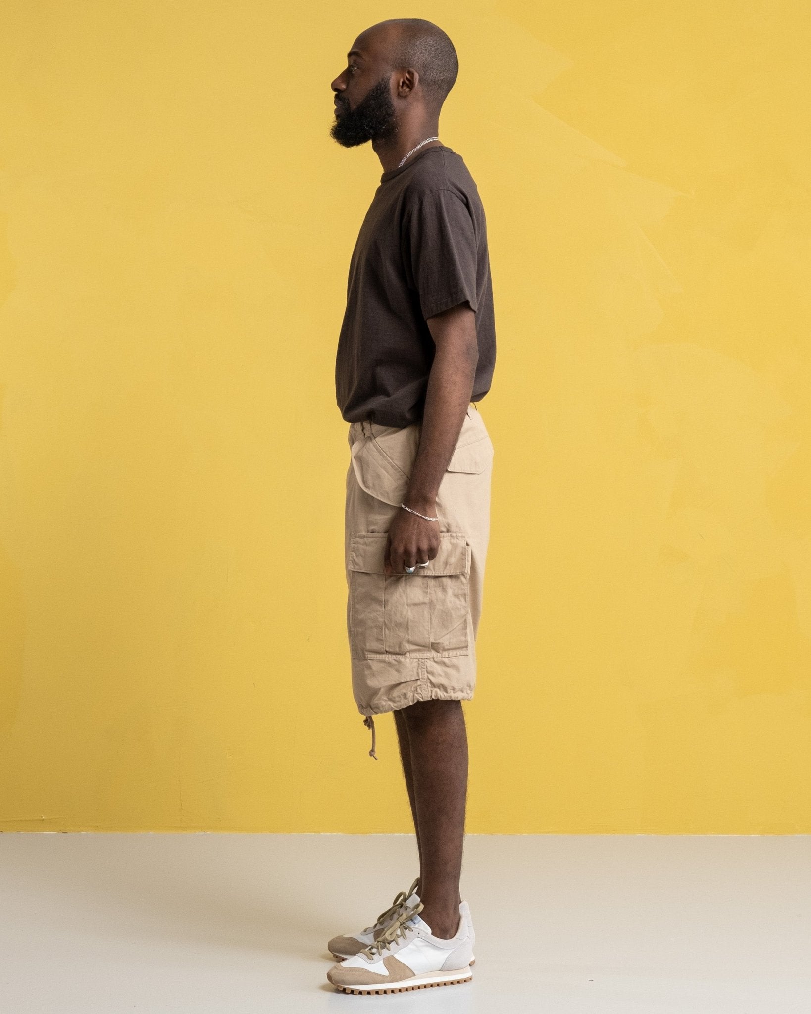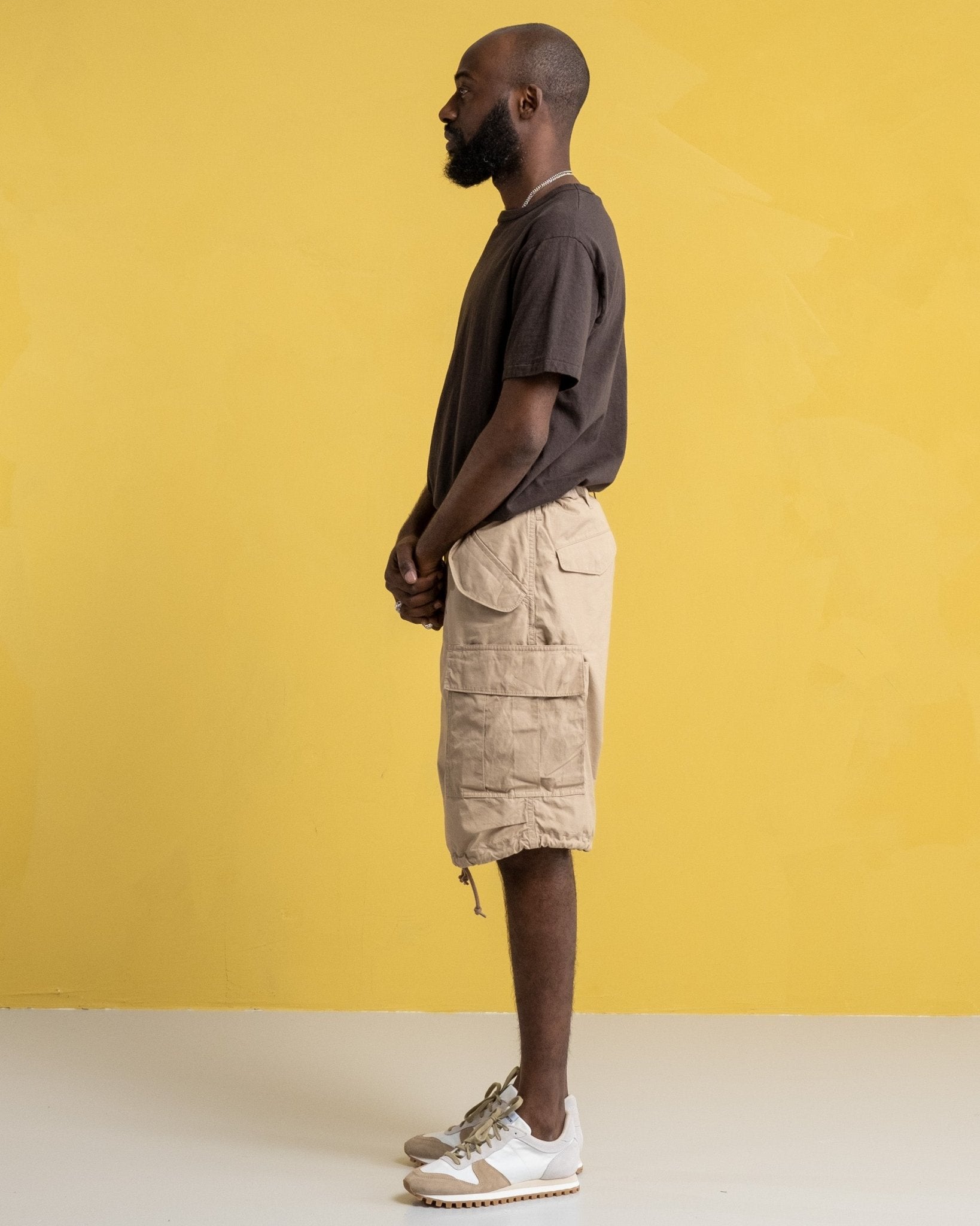 MIL 6Pocket 80/3 Ripstop Beige 20 fra Beams+. Afslappet og bred pasform cargoshorts i japansk bomuld rip-stop. Letvægt men meget holdbar! Lynlås og knaplukning med justerbar talje. Masser af lommer og et par skjulte indvendige lommer. Kanterne kan også justeres via snoretræk. Fremstillet i Kina.