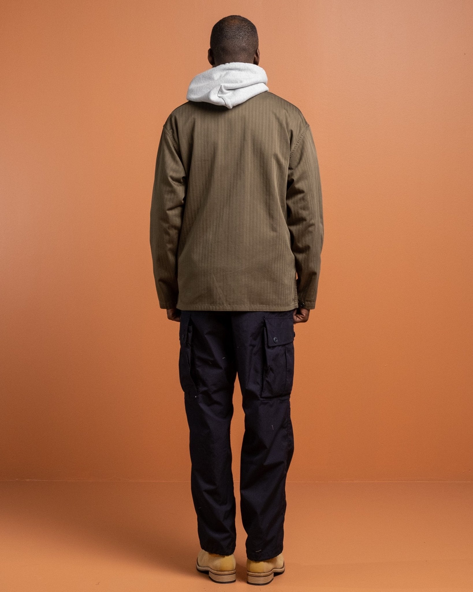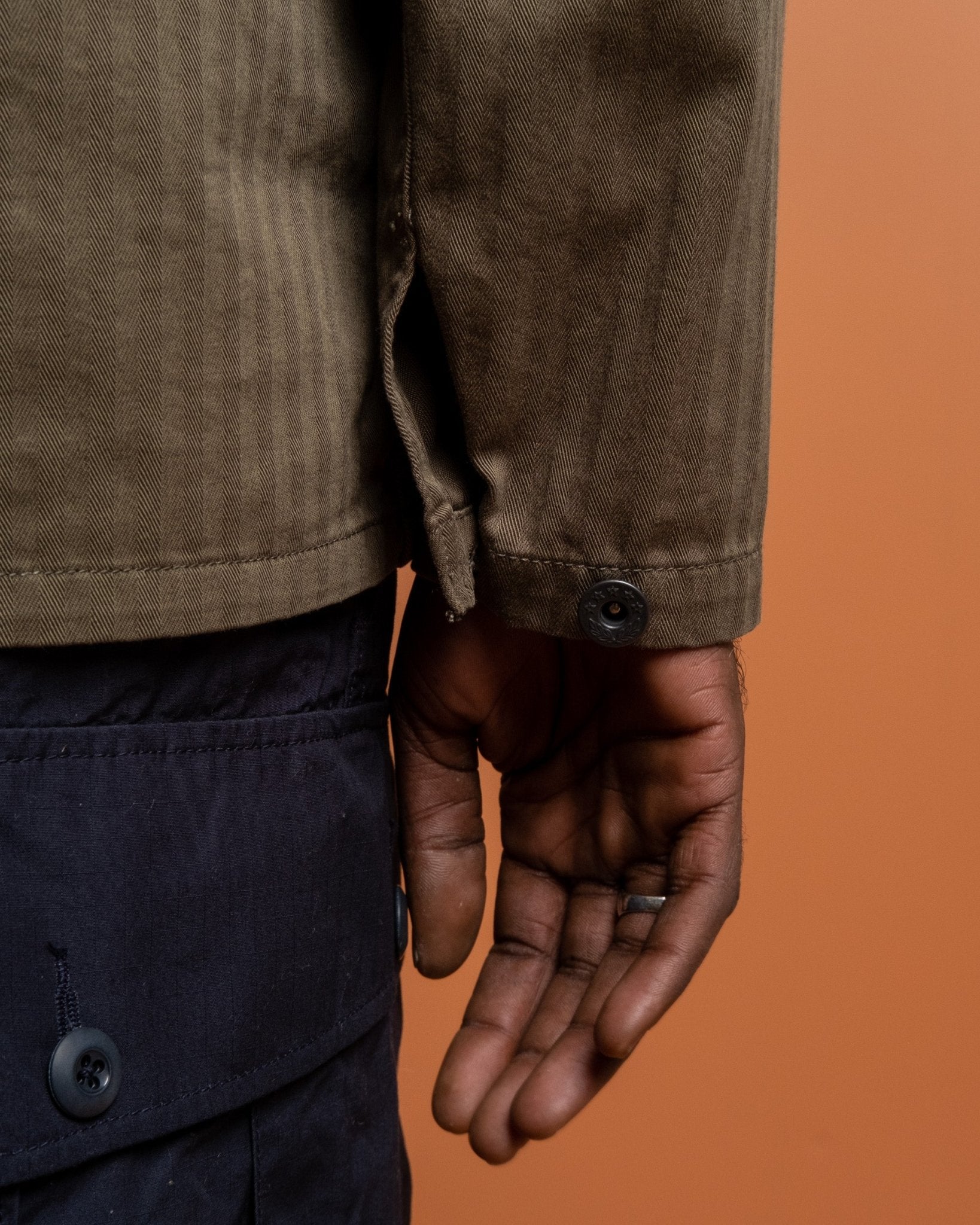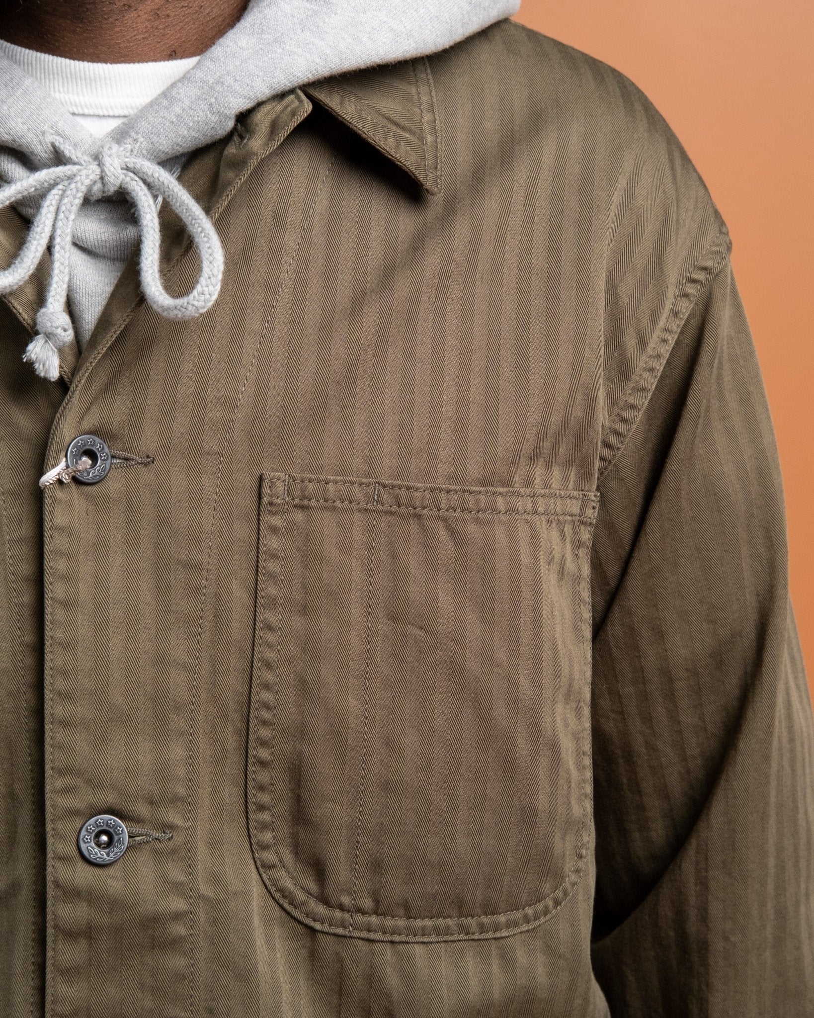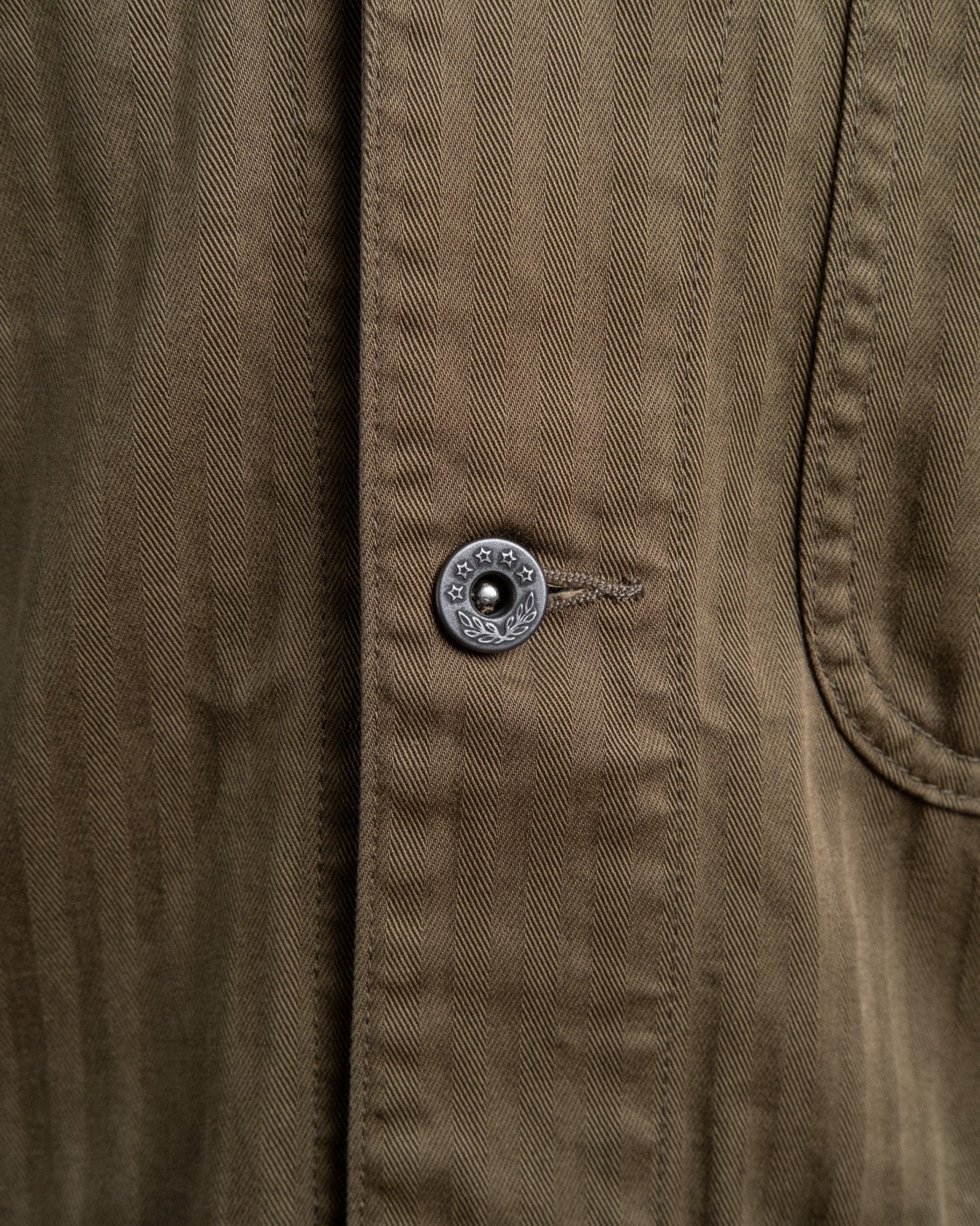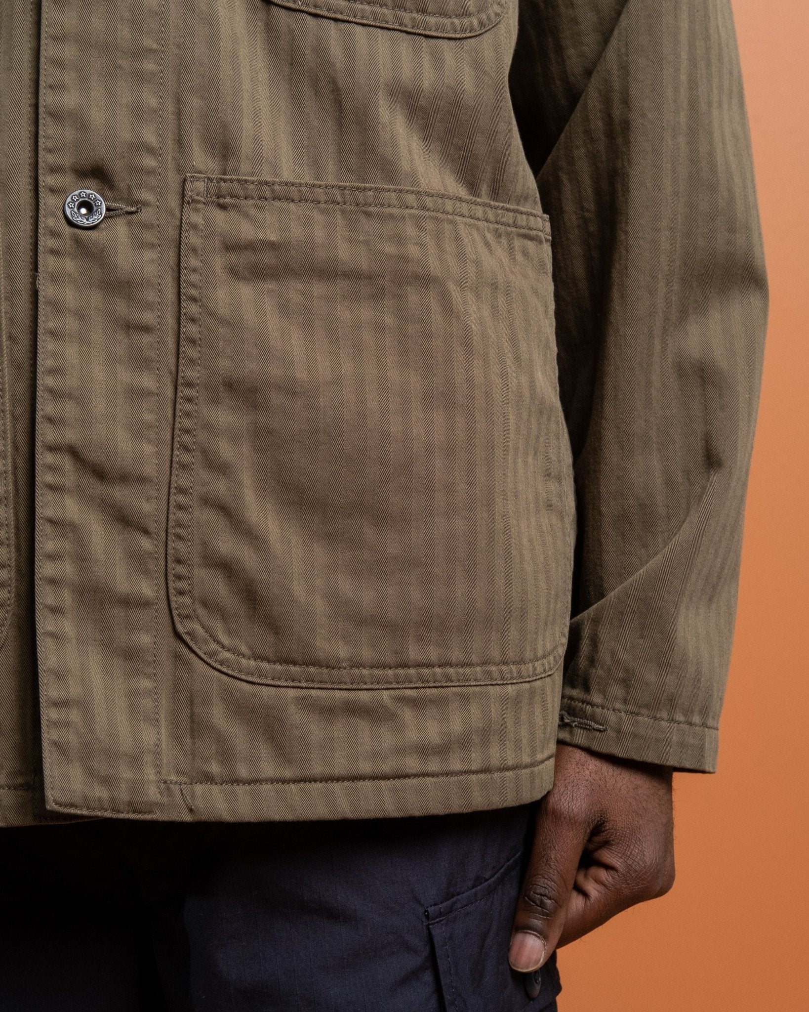 MIL Chore Jacket Supima Herringbone Olive fra japanske Beams+. Endnu en dejlig militærinspireret jakke i en Supima bomuldsherringbone. Tre forlommer med to yderligere skjulte lommer lukket med lynlåse. Justerbare manchetter og specialfremstillede knapper. Skåret fra et japansk stof, en dejlig herringbone i en super blød Supima bomuld. Fremstillet i Kina.