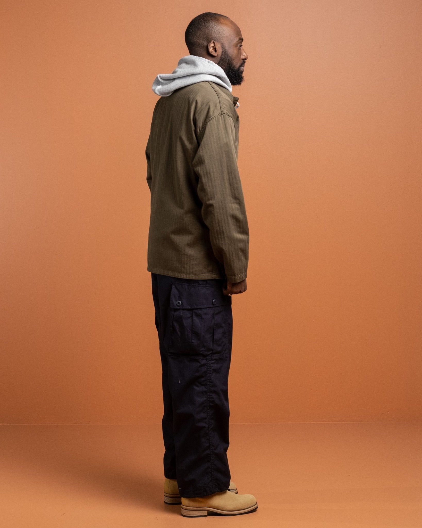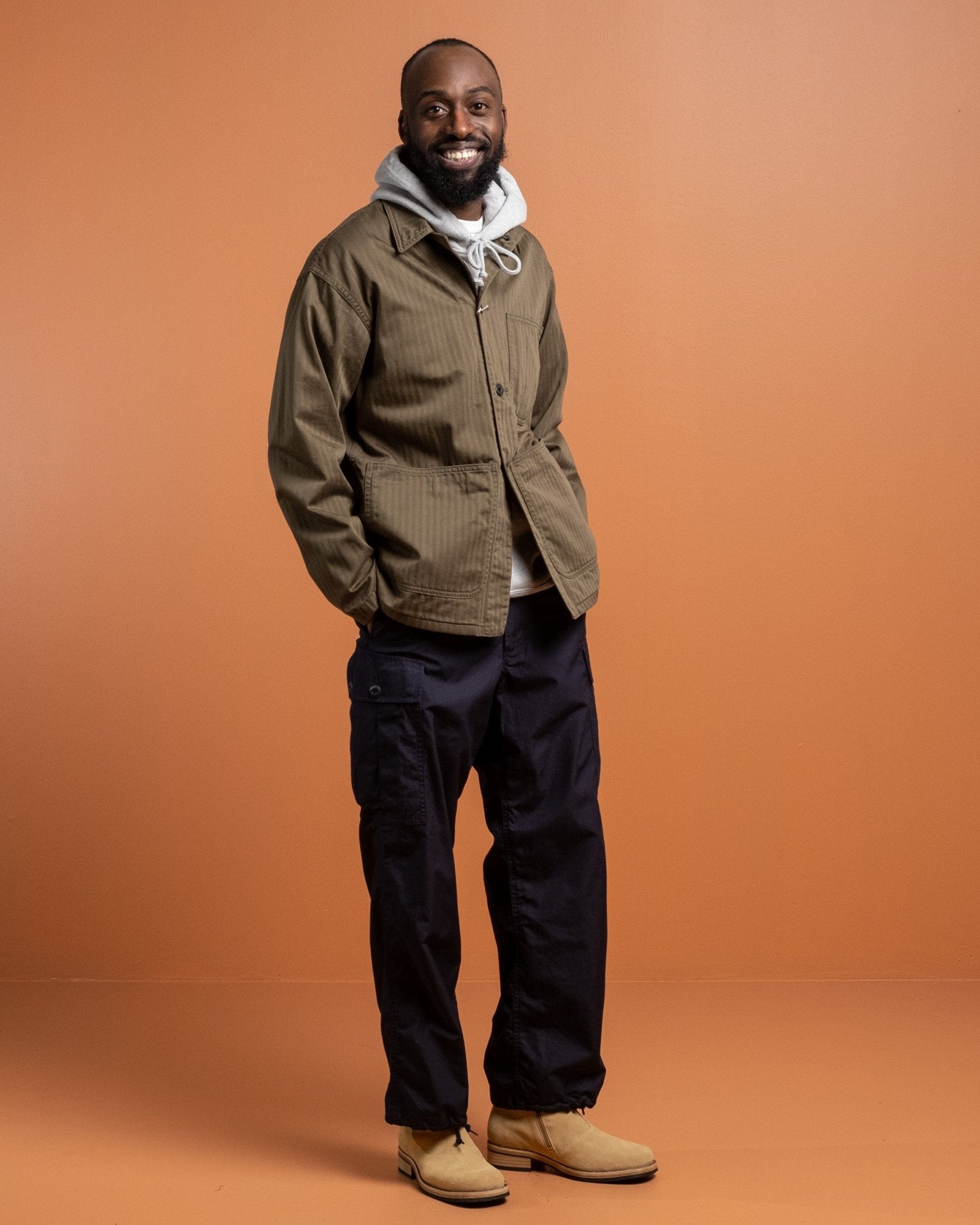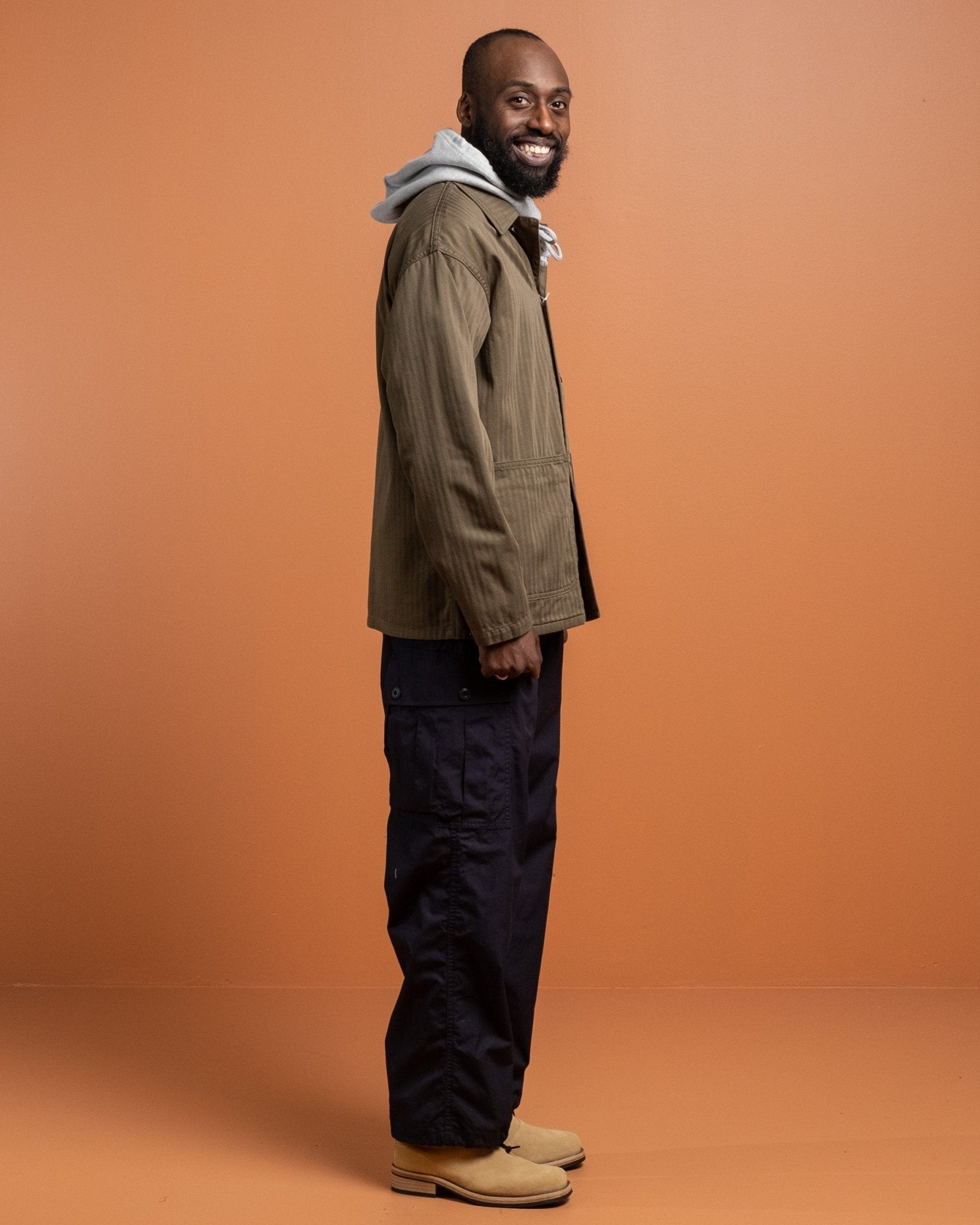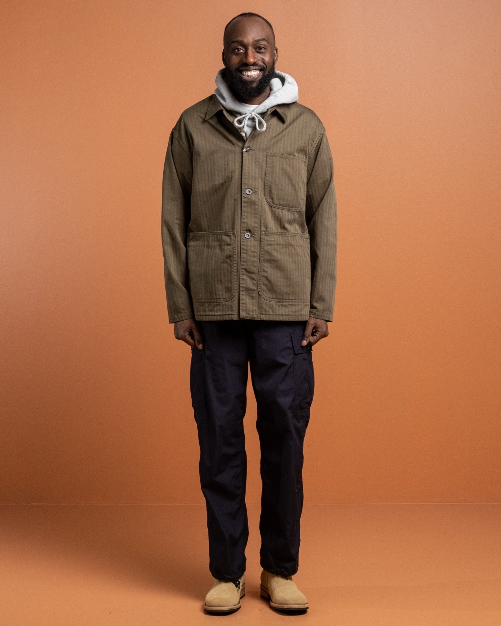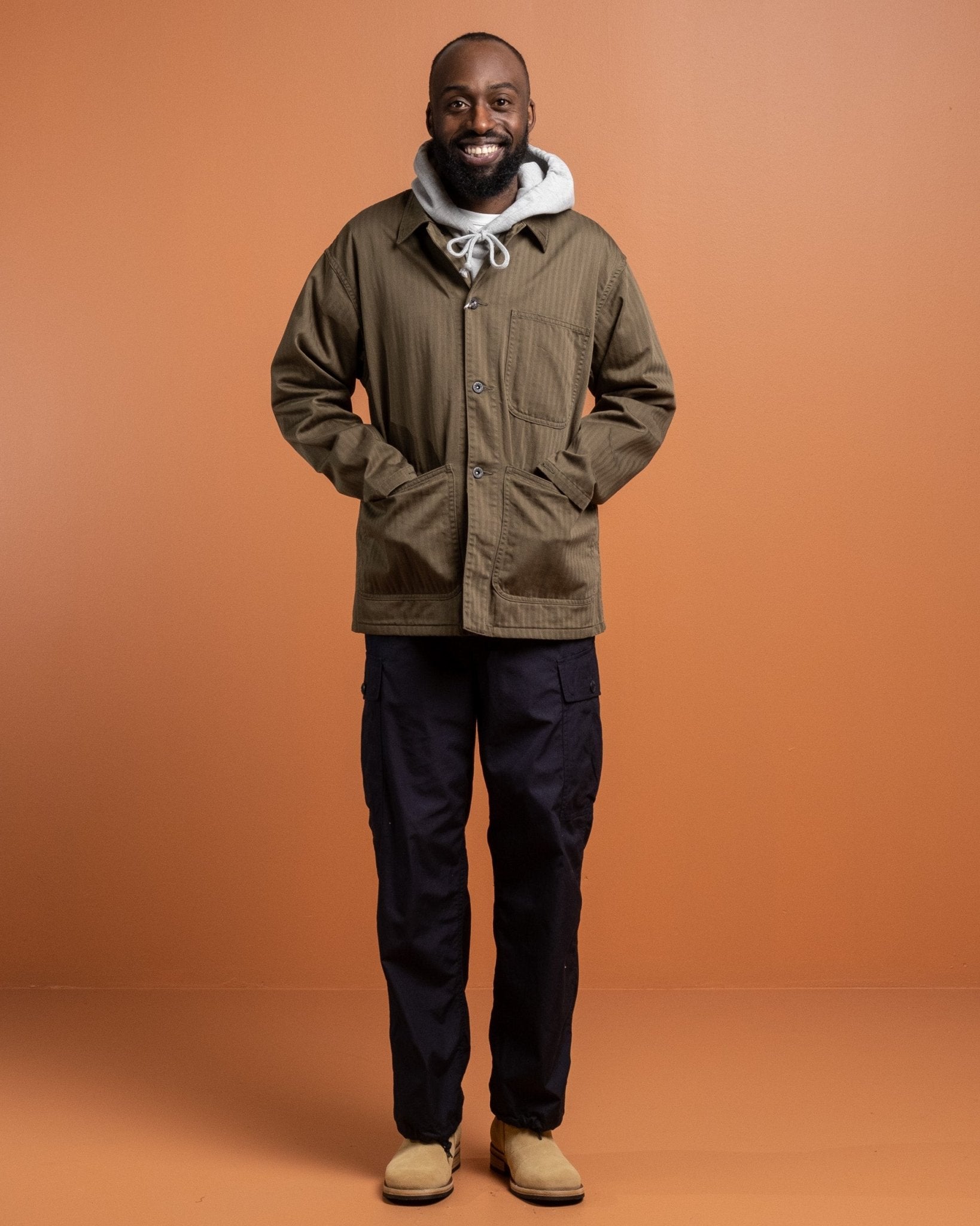 MIL Chore Jacket Supima Herringbone Olive fra japanske Beams+. Endnu en dejlig militærinspireret jakke i en Supima bomuldsherringbone. Tre forlommer med to yderligere skjulte lommer lukket med lynlåse. Justerbare manchetter og specialfremstillede knapper. Skåret fra et japansk stof, en dejlig herringbone i en super blød Supima bomuld. Fremstillet i Kina.