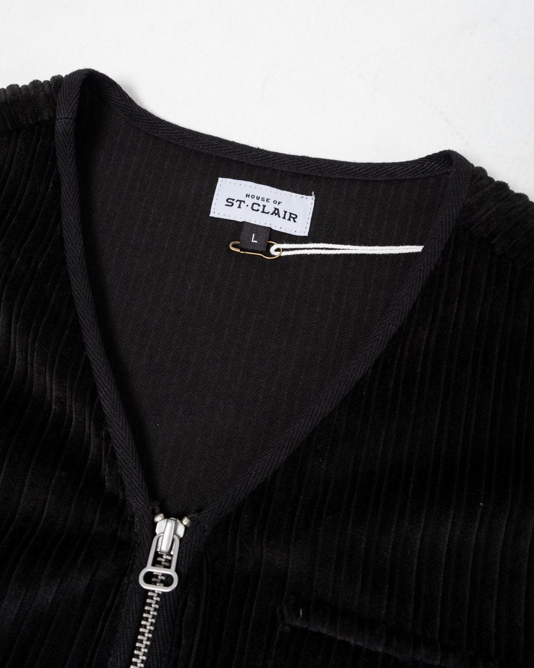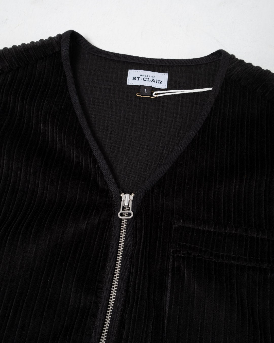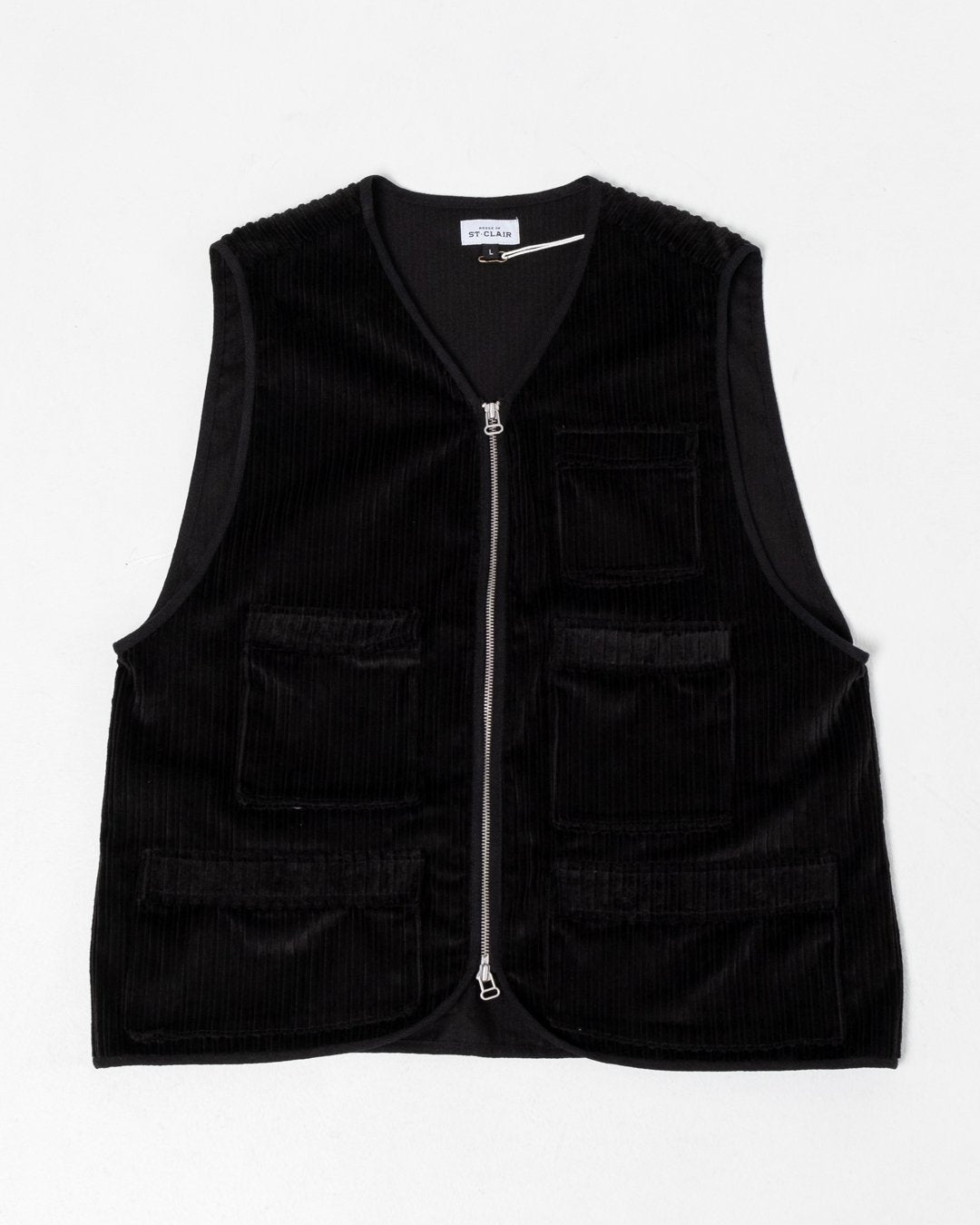 MJM Vest Black fra House of St. Clair. Letvægts multi-lomme vest i engelsk Hi Lo bomuldsfløjl. Fem forreste 3D-lommer med trykknaplukning og to store 3D-lommer bagpå med trykknaplukning. To-vejs lynlås. Fremstillet i USA.