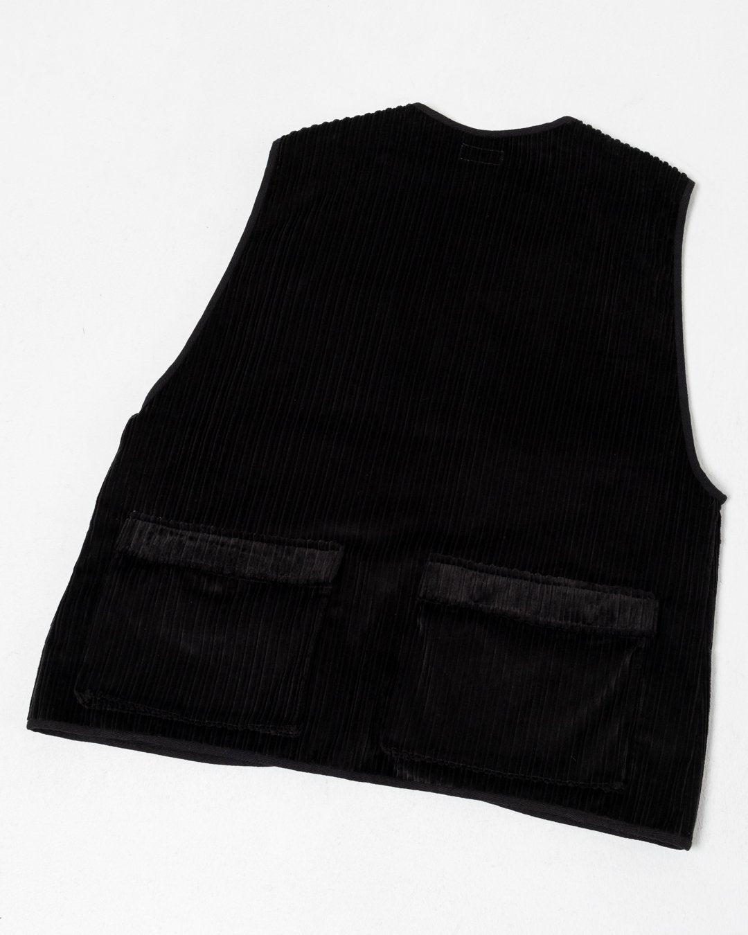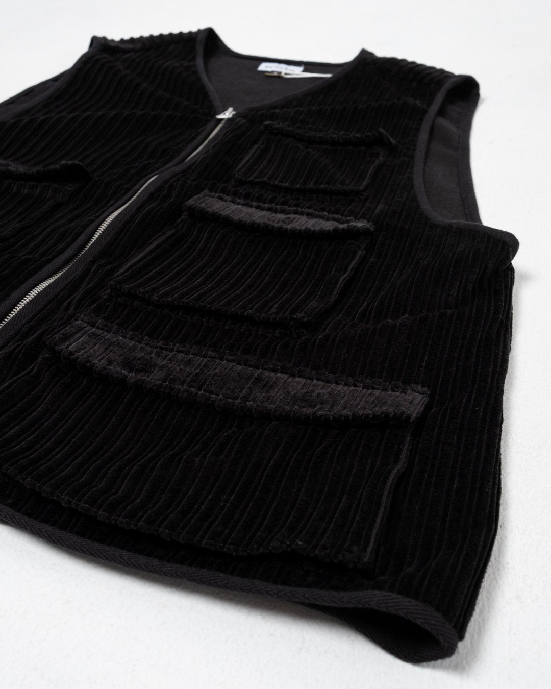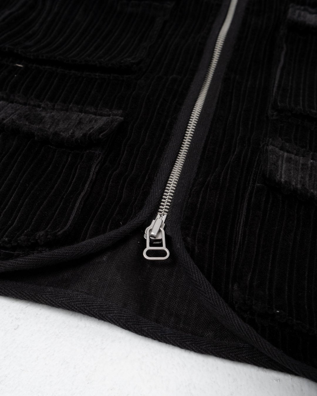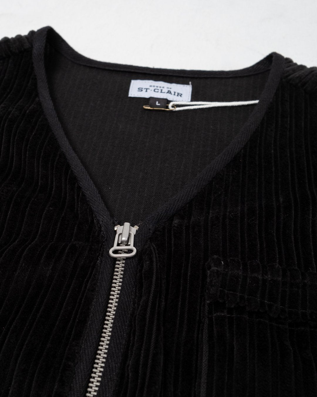 MJM Vest Black fra House of St. Clair. Letvægts multi-lomme vest i engelsk Hi Lo bomuldsfløjl. Fem forreste 3D-lommer med trykknaplukning og to store 3D-lommer bagpå med trykknaplukning. To-vejs lynlås. Fremstillet i USA.