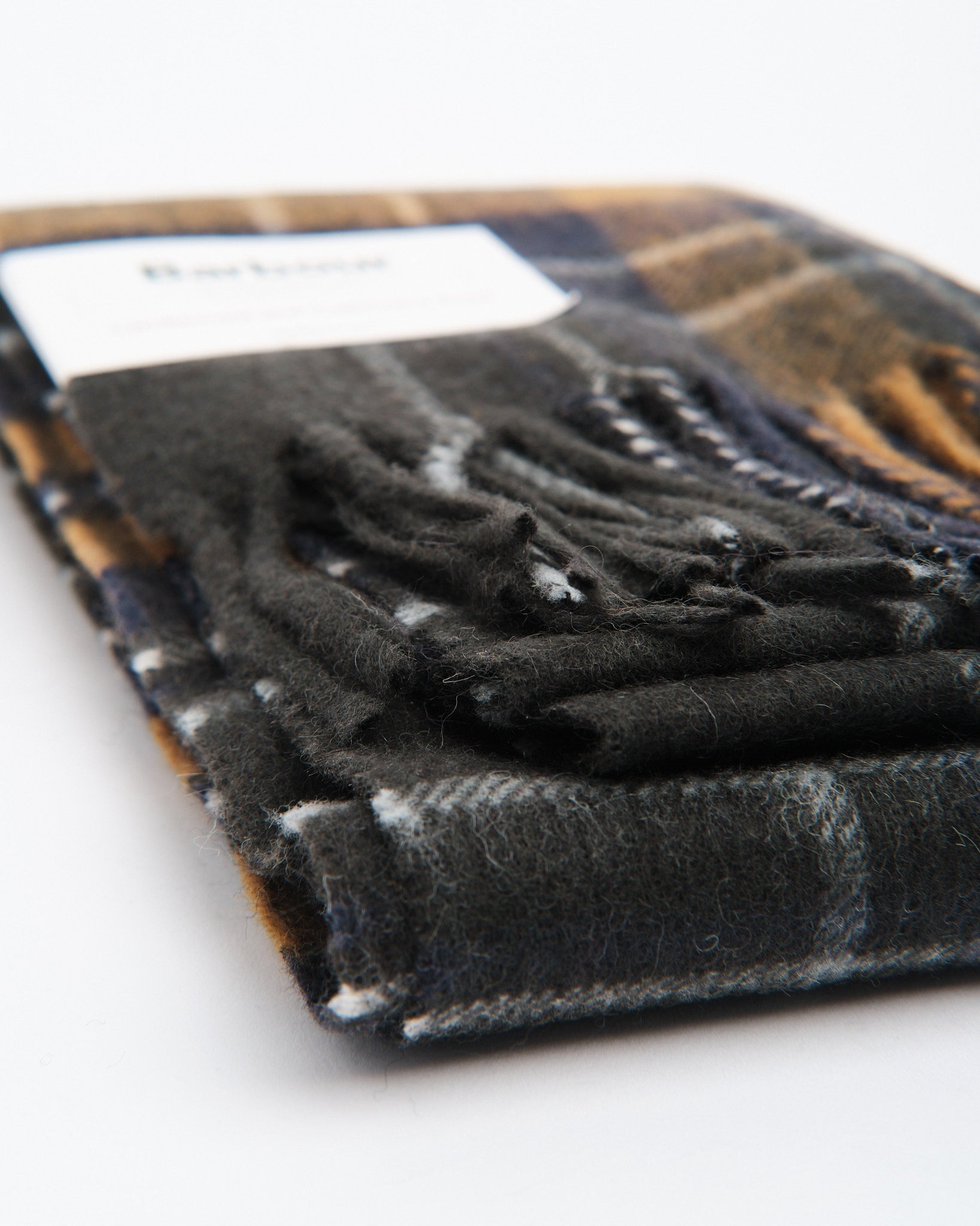 Den BARBOUR NEW CHECK TARTAN SCARF i Olive/Classic er den perfekte blanding af tradition og moderne komfort. Fremstillet af en luksuriøs blanding af 95% lammeuld og 5% kashmir, tilbyder dette tørklæde uovertruffen blødhed og varme, hvilket gør det til et must-have i de koldere måneder. Det klassiske olivenfarvede ternet mønster tilføjer sofistikation, mens den frynsete kant giver det en raffineret afslutning. Med en længde på 180 cm og en bredde på 25 cm, tilbyder det alsidige stylingmuligheder for ethvert outfit.