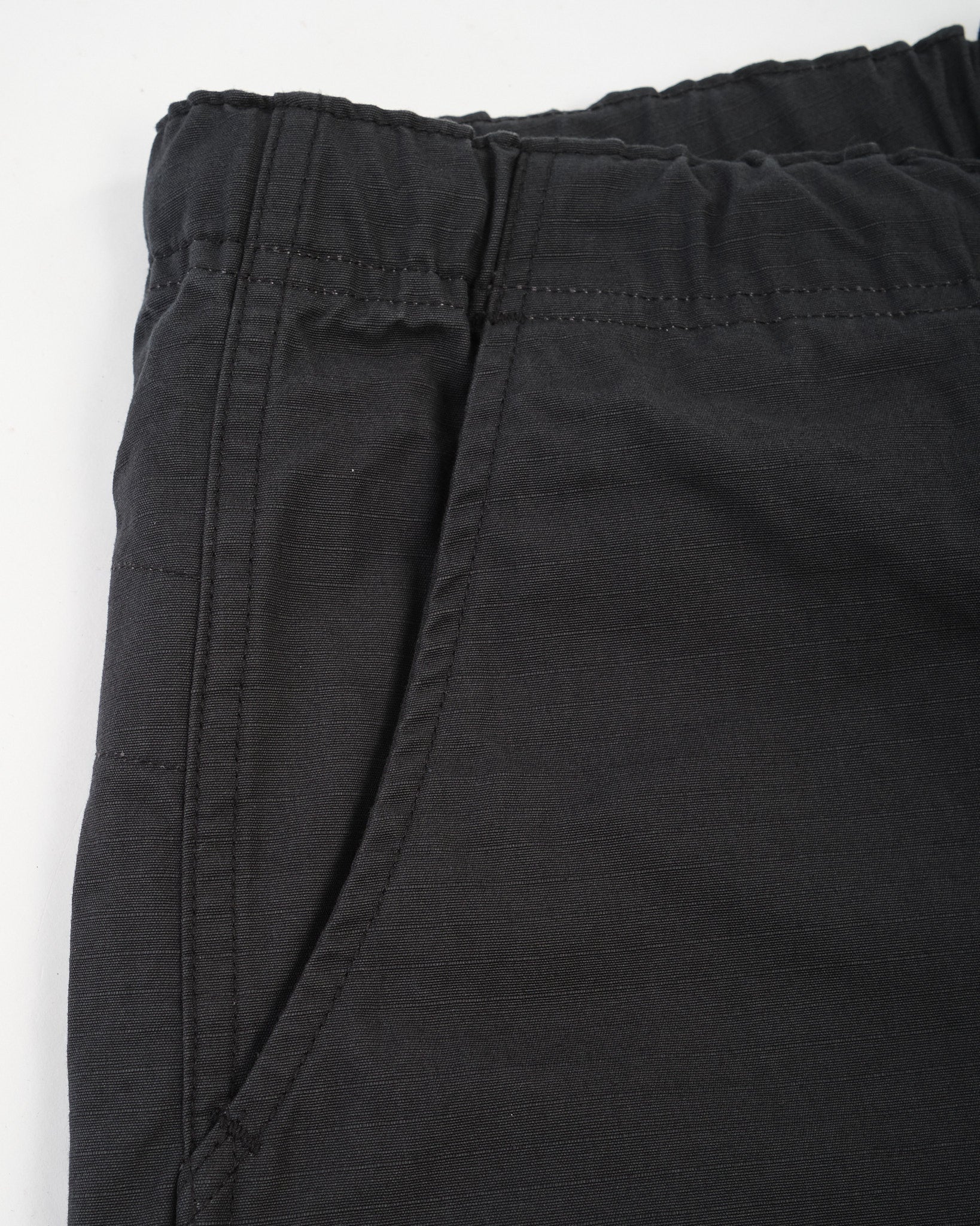 Den elastiske taljebånd med snøre sikrer en behagelig, justerbar pasform uden behov for et bælte. Designet bevarer den afslappede øvre blok og trimmer mod kanten for balance. Funktionelle detaljer inkluderer skrå sidelommer, en baglomme med paspolering, og (i nogle varianter) en lynlås, hvilket tilbyder både anvendelighed og rene linjer.
