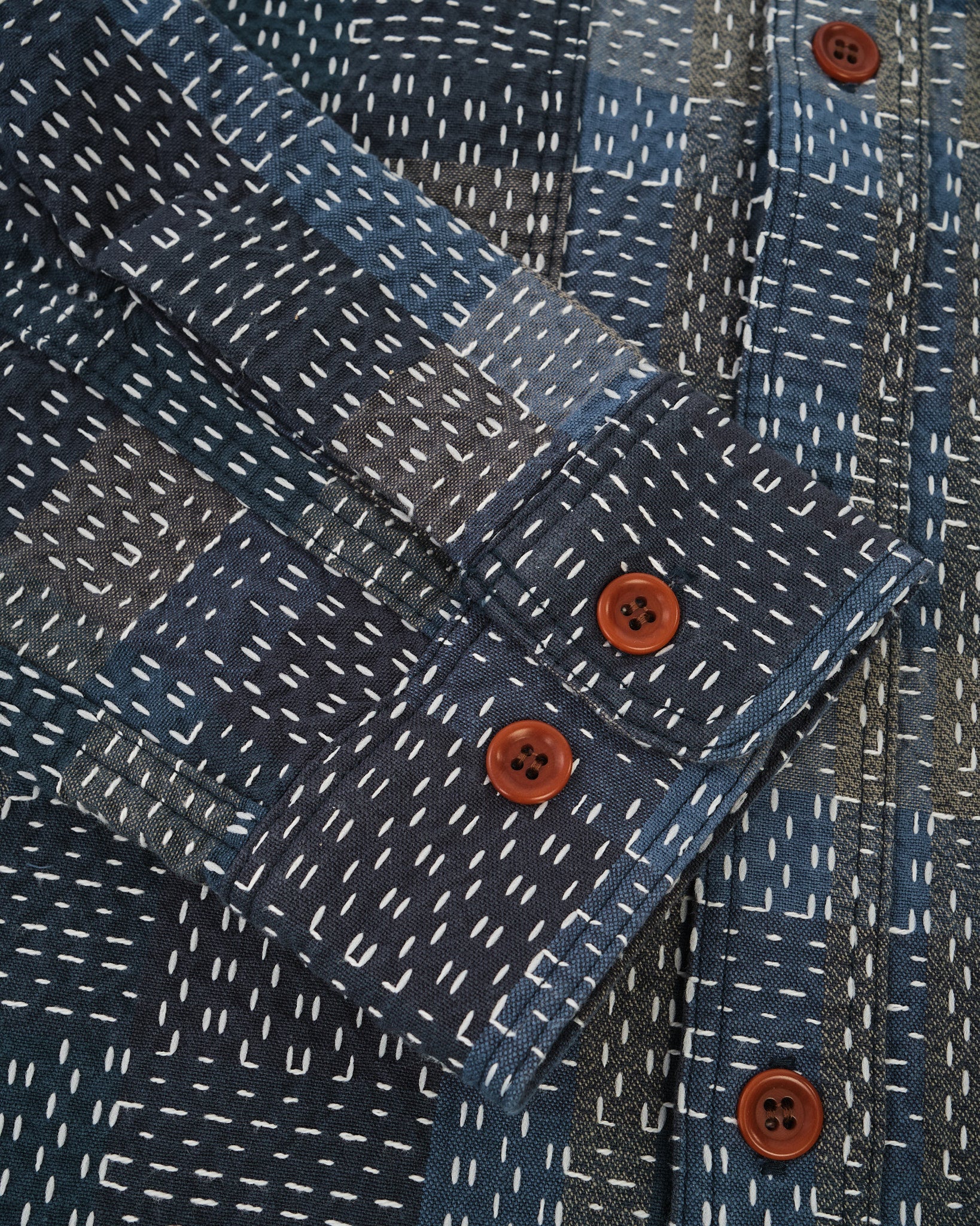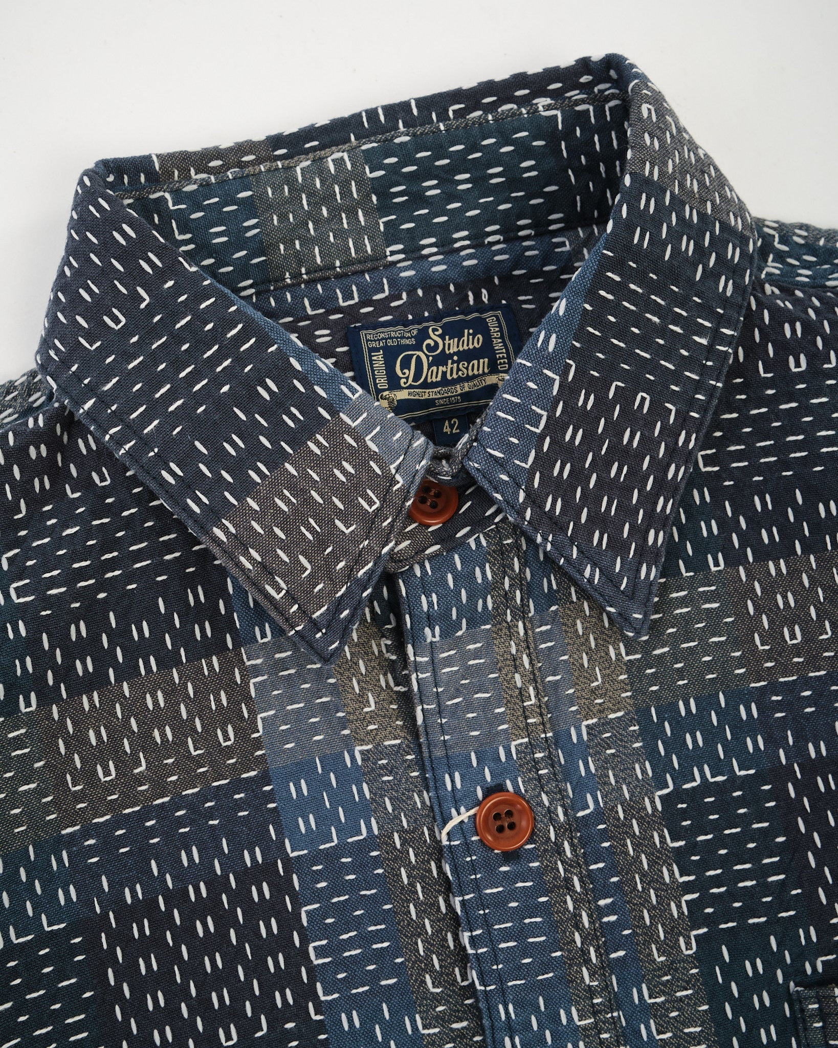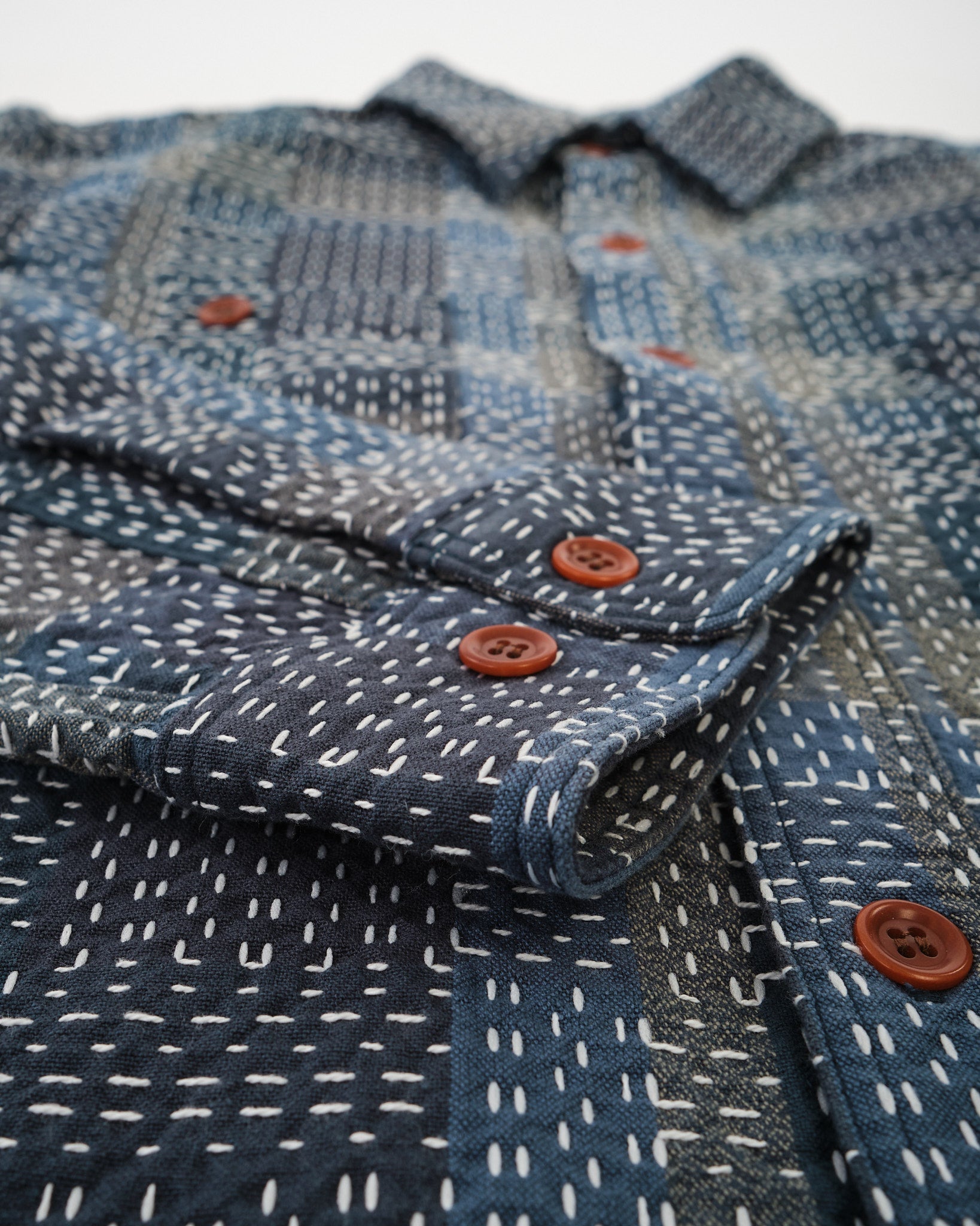 The STUDIO D'ARTISAN Noragi Sashiko Shirt (5651) er en moderne fortolkning af traditionelt japansk arbejdstøj, der henter inspiration fra Noragi, de robuste beklædningsgenstande som arbejdere bar i århundreder. Designet med sashiko-syninger, der løber både lodret og vandret, fremviser denne skjorte en unik håndværksmæssig æstetik, der ærer Japans rige tekstilarv.