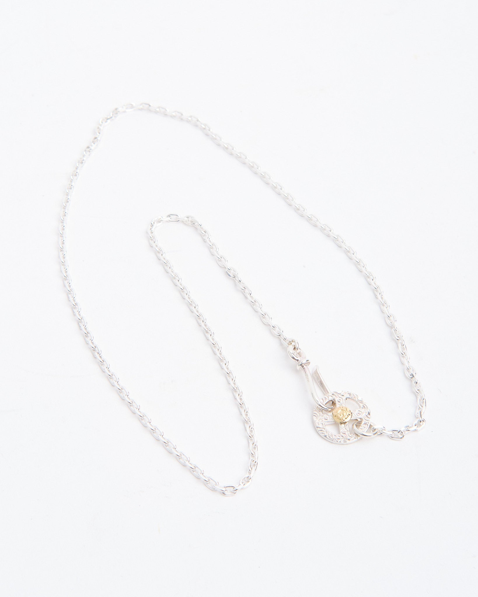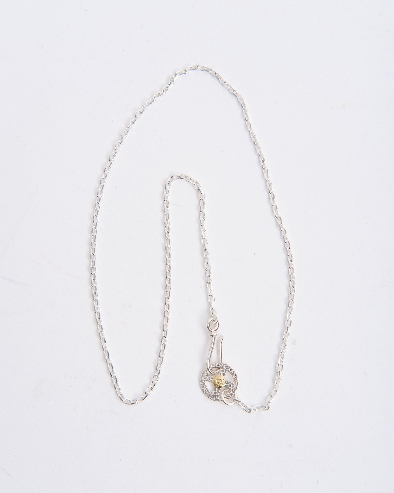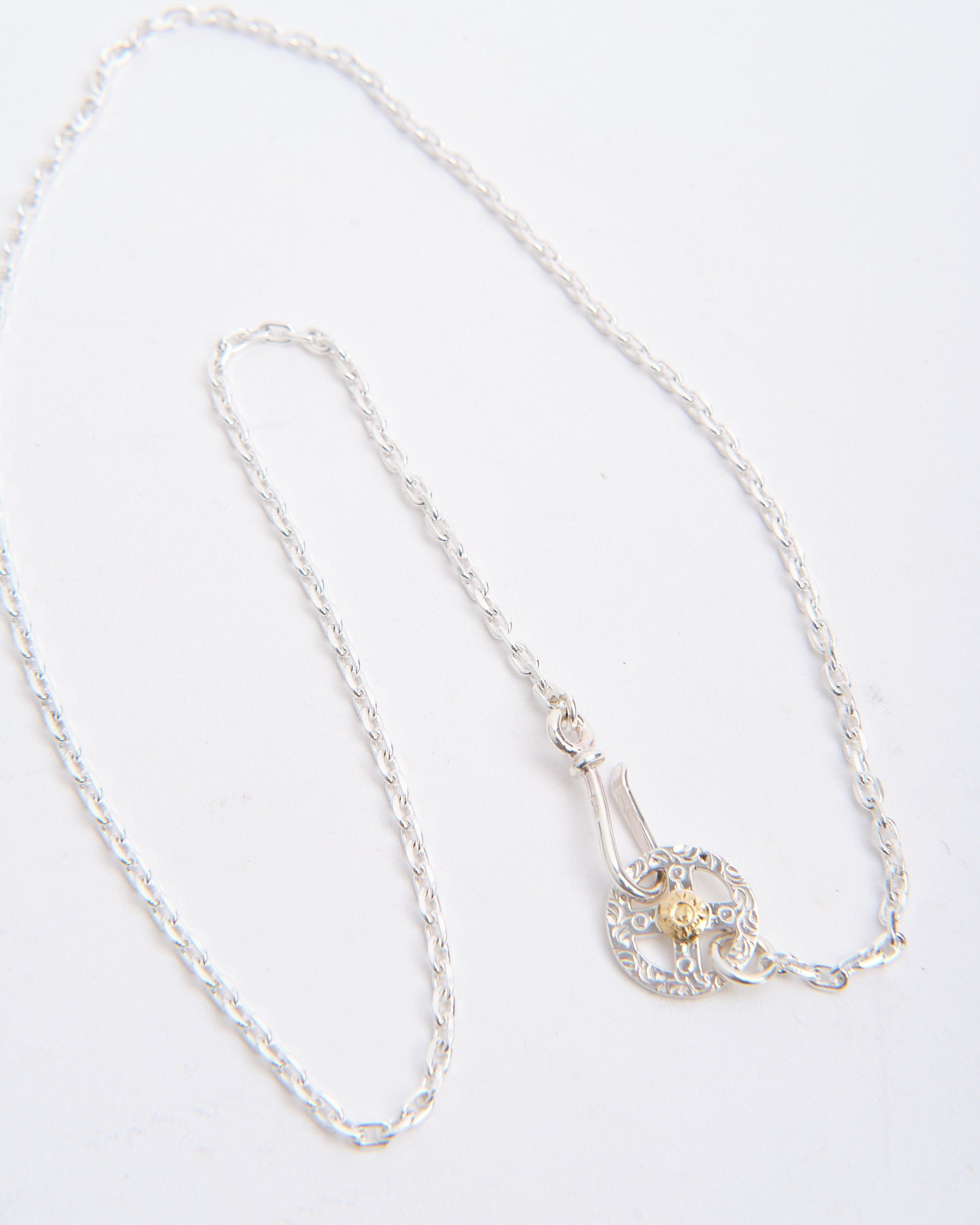 The Chain S + Medicine Wheel with K18 (60cm) is a complete necklace set that unites First Arrows’ symbolic pendant with a handcrafted silver chain. The Medicine Wheel is made from Britannia Silver 950 and detailed with 18k yellow gold, carrying meaning of harmony, balance, and protection inspired by Native American tradition. The longer 60cm chain gives the pendant a relaxed drape, ideal for layering with other necklaces or wearing as a statement piece on its own. First Arrows use a unique heat-treatment process to strengthen the silver, giving it both durability and brilliance. Over time, the silver will age gracefully, developing a darkened patina that highlights the warmth of the gold accent.