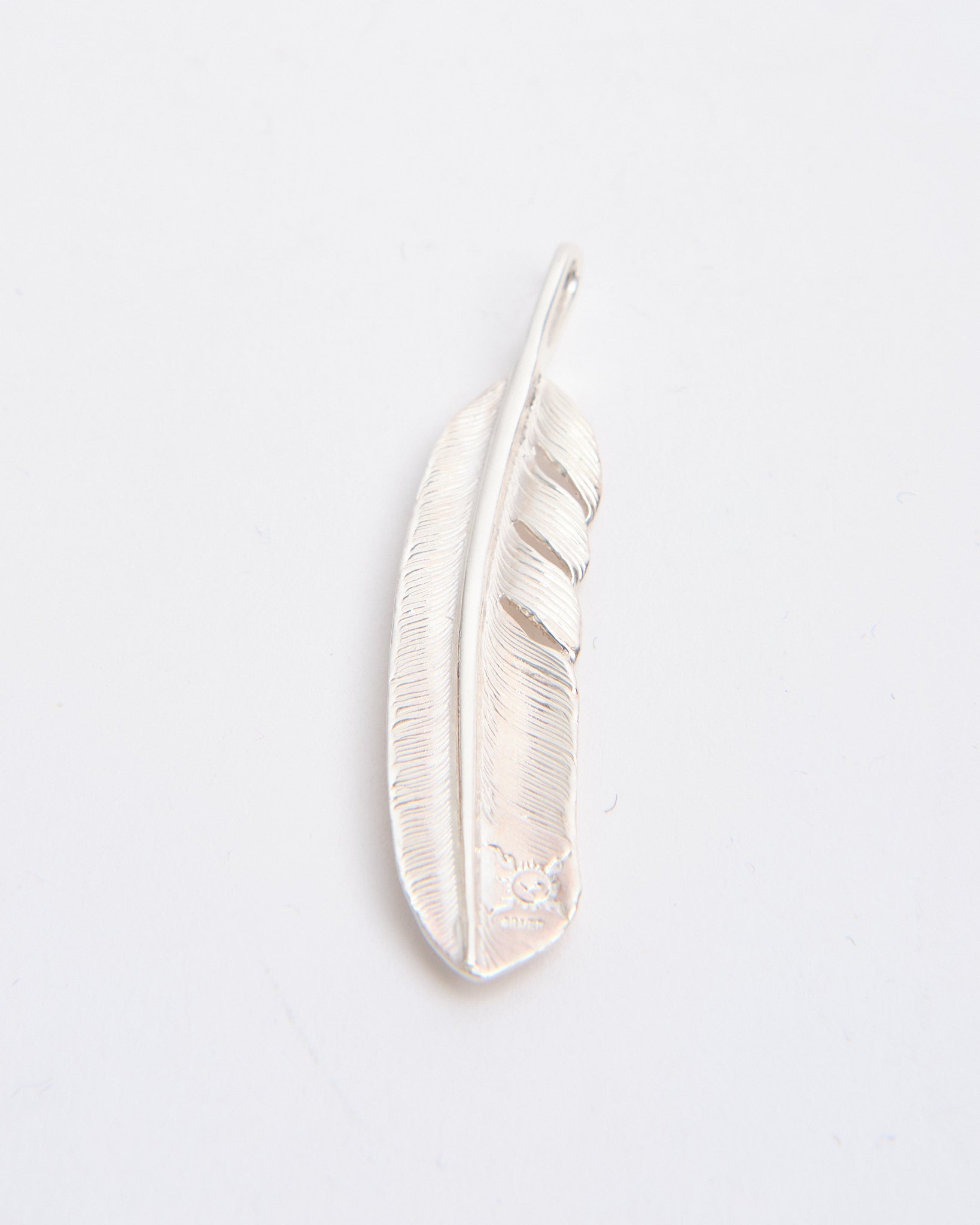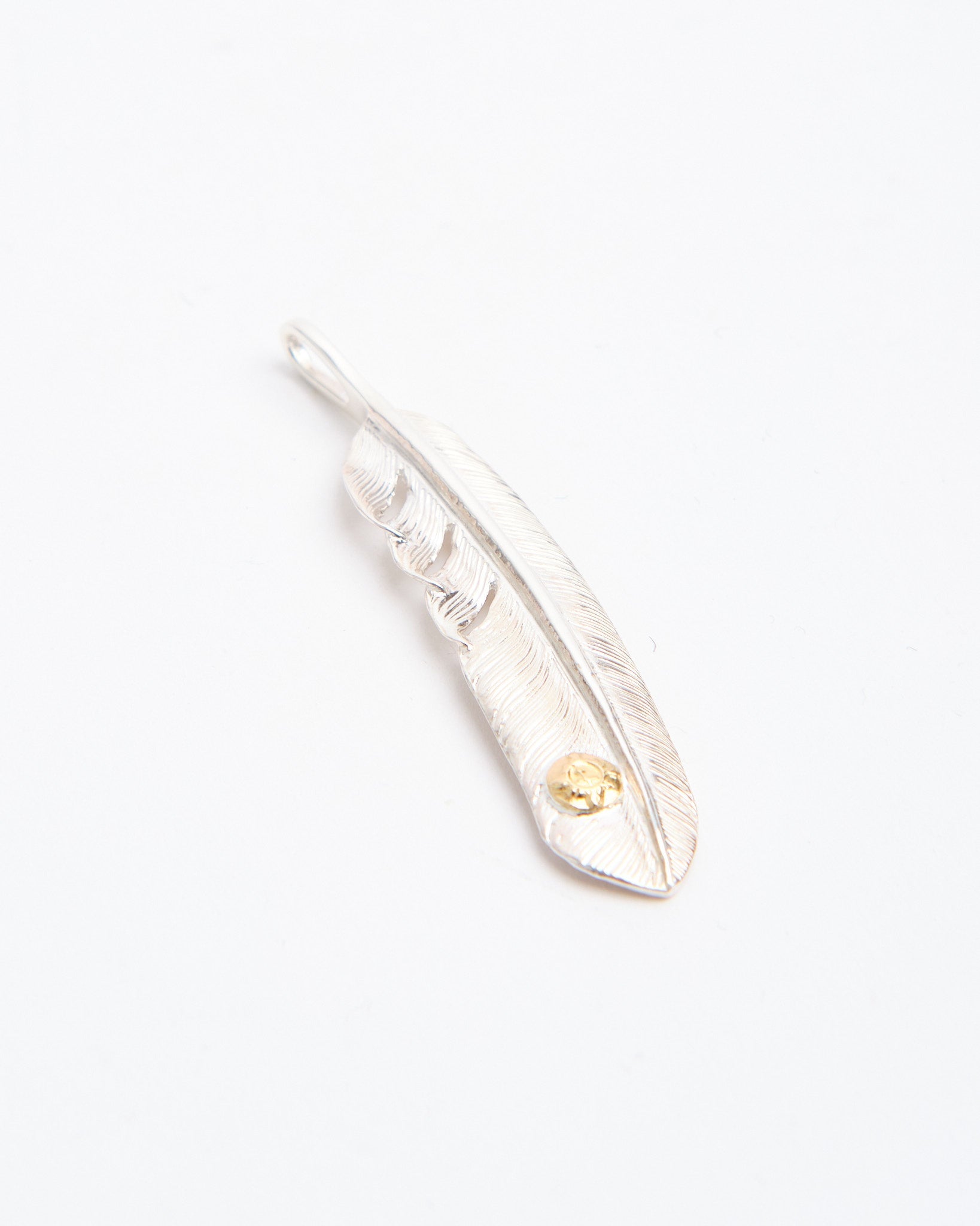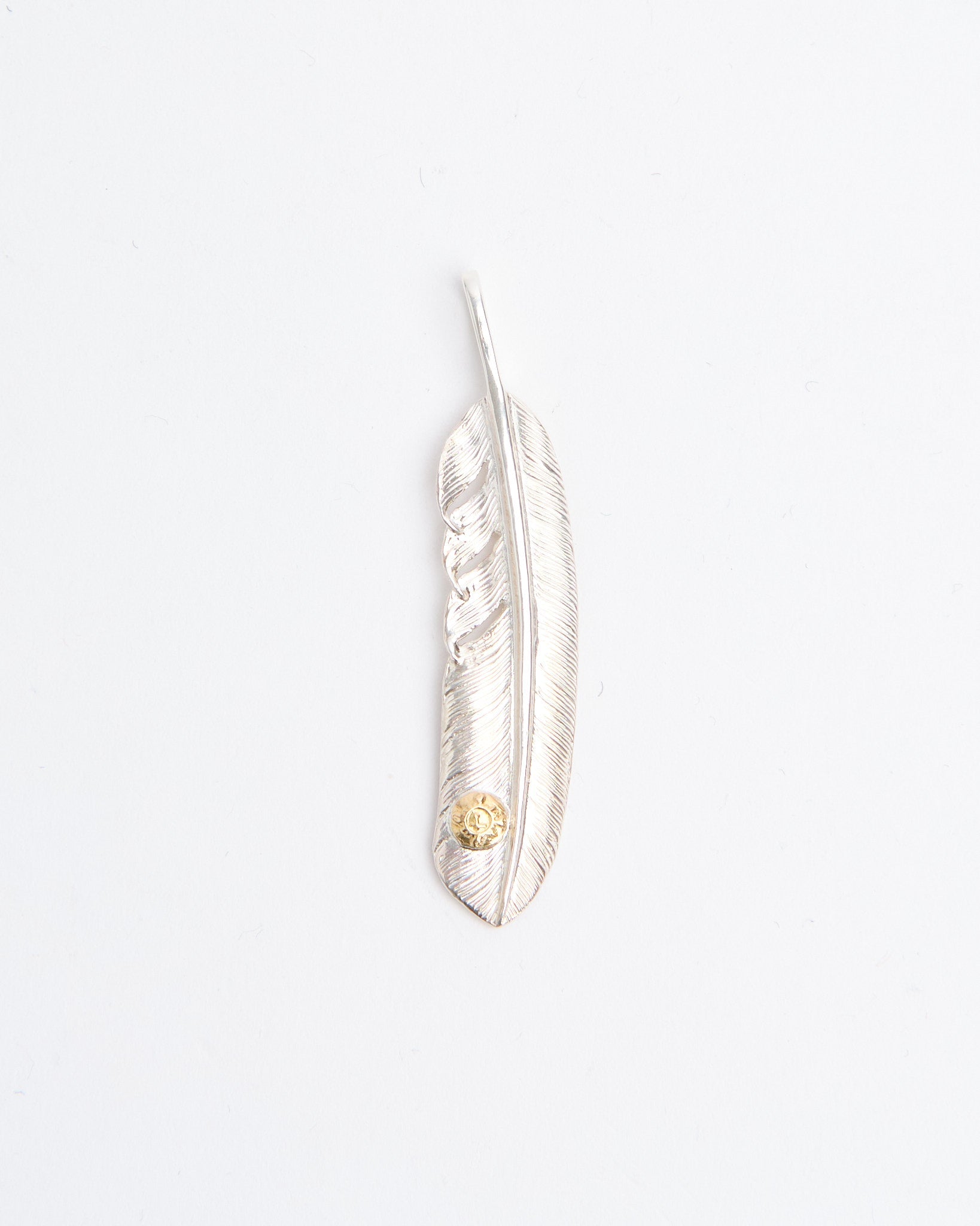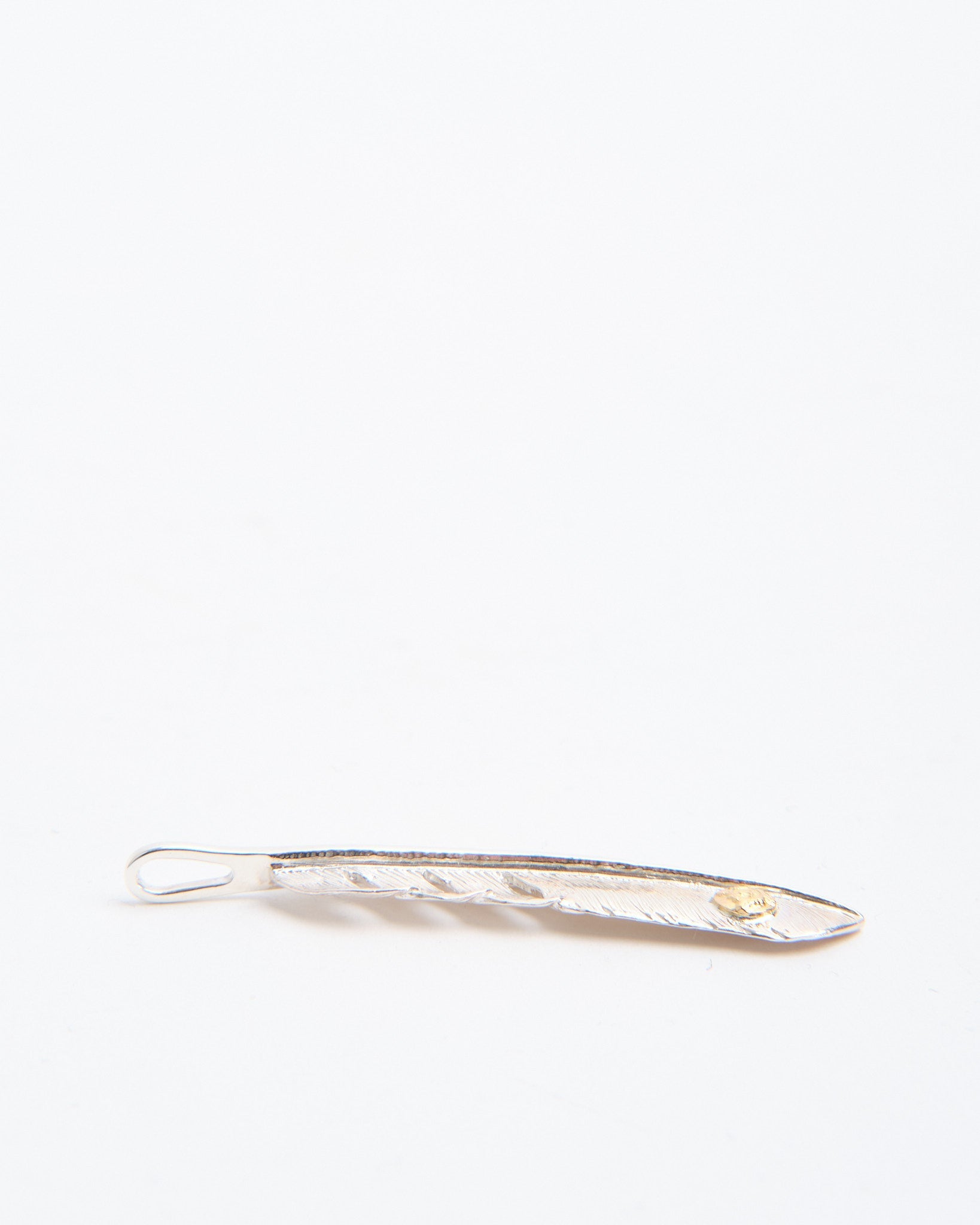 Fjeren med K18 S (størrelse L) er en raffineret fortolkning af First Arrows' signaturfjeremotiv. Håndlavet i Japan af Britannia Sølv 950, bærer den store fjer dyb betydning hentet fra Native American tradition, der symboliserer frihed, håb og positiv energi. En lille detalje i 18k gult guld er tilføjet til designet, hvilket skaber en varm kontrast mod sølvet. Sølvet er behandlet med First Arrows' unikke varmeprocess, hvilket gør det stærkt samtidig med at bevare dets naturlige glans. Over tid vil sølvet mørkne for at fremhæve guldet endnu mere, hvilket giver vedhænget en karakter, der vokser med ejeren. Uanset om det bæres alene som et statement piece eller lag-på-lag med andre vedhæng, er denne fjer en livslang ledsager, der blander arv og moderne raffinement.