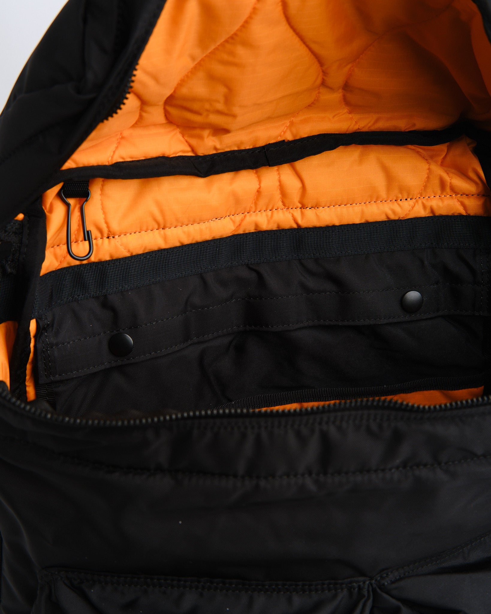 Opdag PORTER YOSHIDA PORTER FORCE DAYPACK i sort, en fusion af moderne stil og militær præcision. Designet og håndlavet i Japan, henter denne daypack inspiration fra farvevariationerne fundet i militært udstyr. Den er konstrueret ved brug af Nylon Ox stof med en akrylbelægning, mens dens indre er foret med quiltet nylon ripstop i en slående nødsituation orange nuance. Denne kombination sikrer ikke kun levetid, men tilføjer også et unikt præg til dens æstetiske appel. Daypacken har et stort hovedrum, der nemt rummer B4-størrelse genstande sammen med flere eksterne lynlåslommer, en Velcro-lomme og interne organisationslommer. En af hvilke kan afmonteres for ekstra bekvemmelighed. Med dimensioner der måler W 295mm x H 410mm x D 130mm og vejer 735g er den perfekt egnet til daglig brug, uden at gå på kompromis med stil eller funktionalitet. Derudover garanterer dens rummelige 19L kapacitet plads til at opbevare alle dine essentielle ejendele.