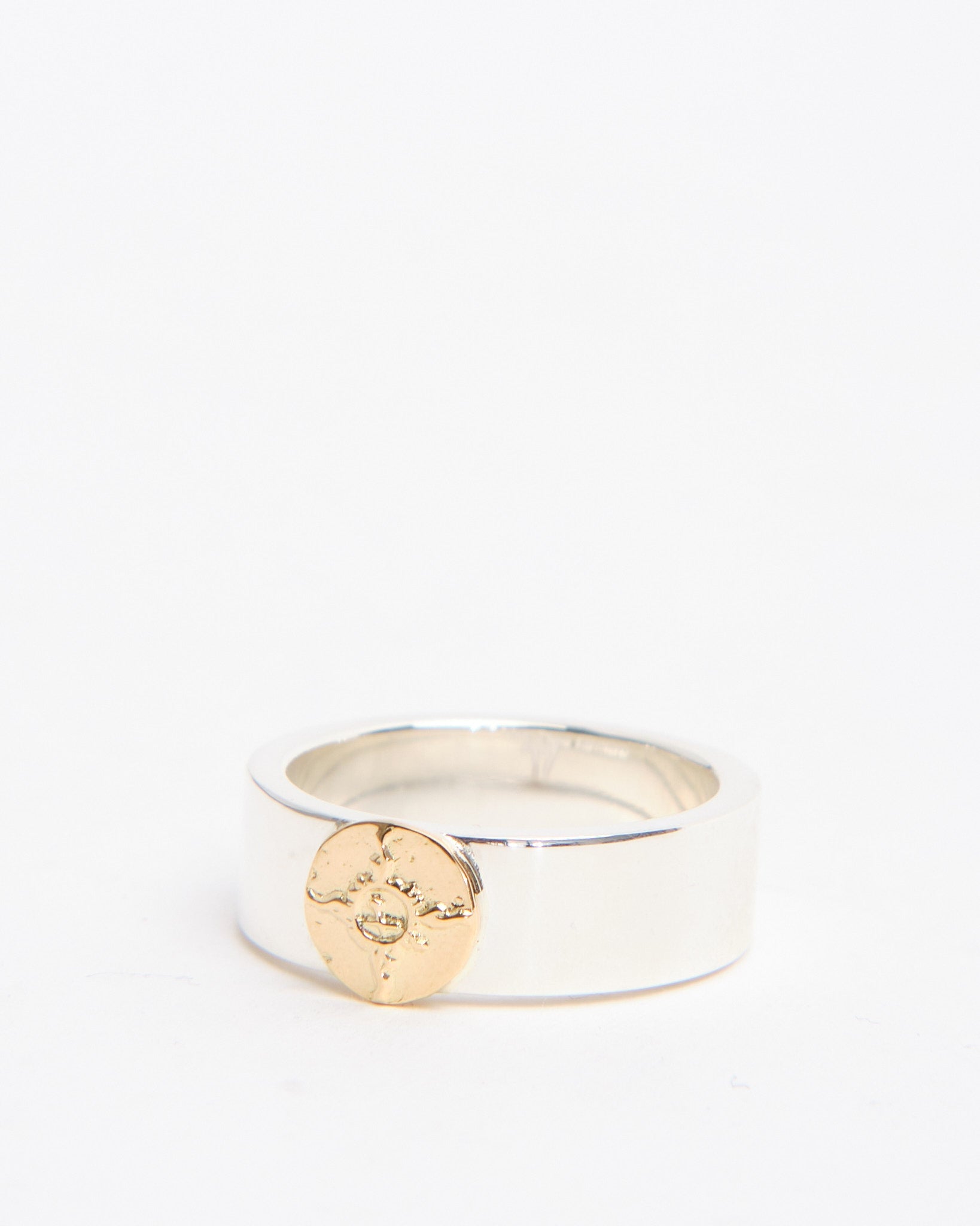 The Flat Hammered 8mm Plane Ring with K18 (#20) is a bold yet refined design from First Arrows, handcrafted in Japan from Britannia Silver 950. The wide 8mm band features a hammered finish, giving the ring a unique texture and natural shine that changes with light and movement. A detail in 18k yellow gold adds warmth and contrast, highlighting the balance between two precious metals. Strengthened through First Arrows’ exclusive heat-treatment process, the silver is durable while maintaining its brilliance. Over time, the silver will darken and the contrast with the gold will deepen, creating a ring that grows more personal with age. Inspired by Native American jewelry but elevated with Japanese refinement, this ring is both a statement of craftsmanship and a lifelong companion.
