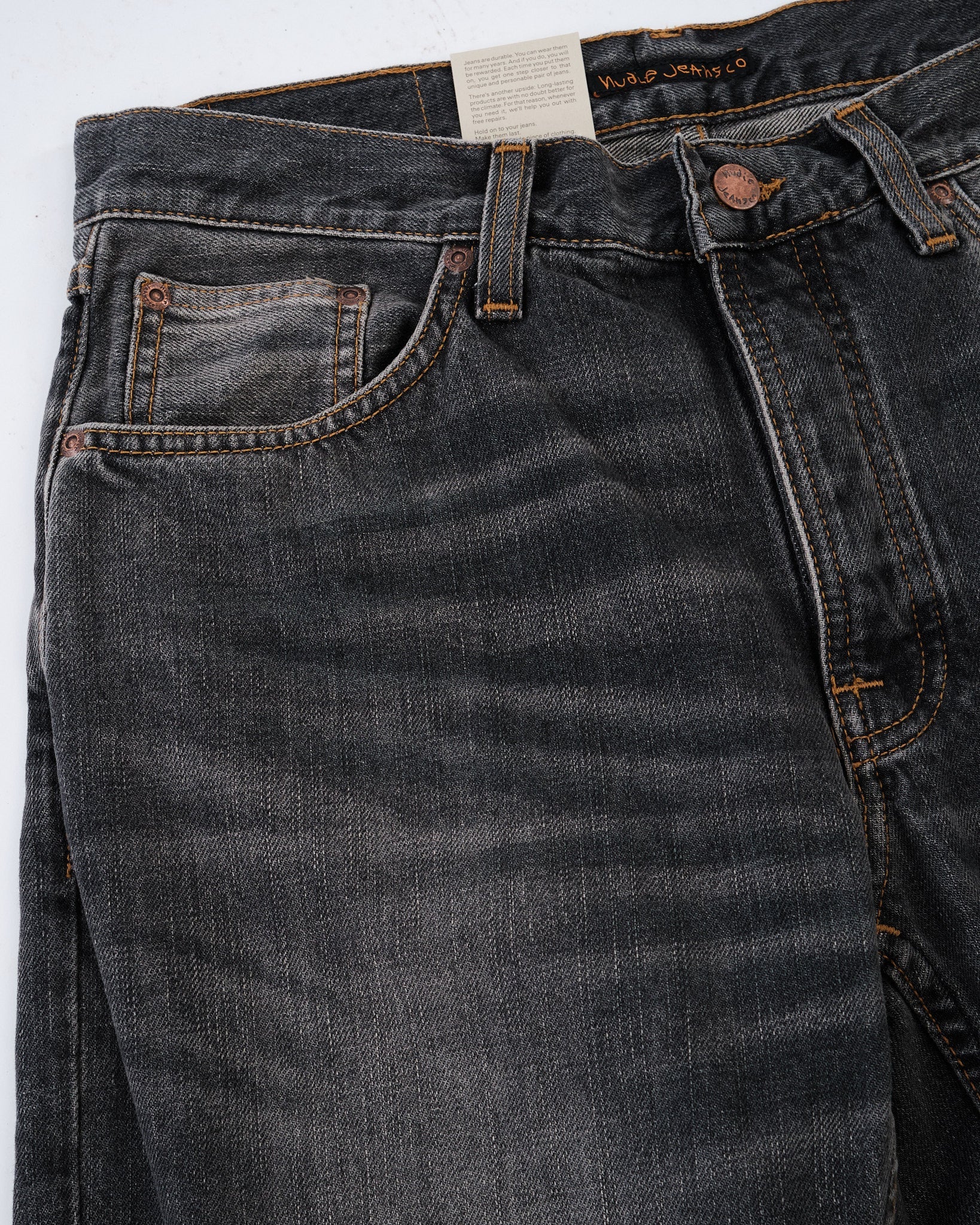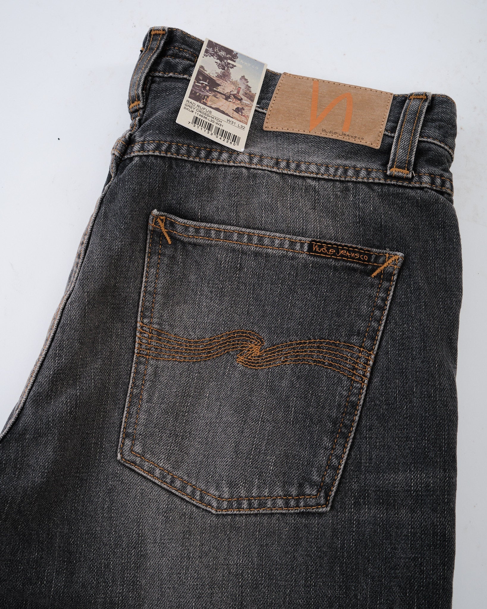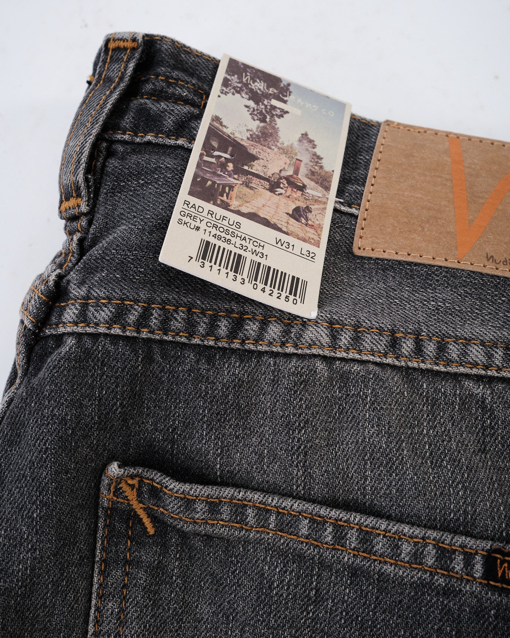 Træd ind i dristig denim styling med NUDIE JEANS CO. RAD RUFUS GREY CROSSHATCH. Disse jeans med høj talje og regulær pasform med lige ben har en slående grå vask med dybe kontraster. Fremstillet af sort denim, fremviser stoffet en robust krydshatch tekstur, der skaber rige højdepunkter og lavpunkter med et dynamisk, noppet udseende.