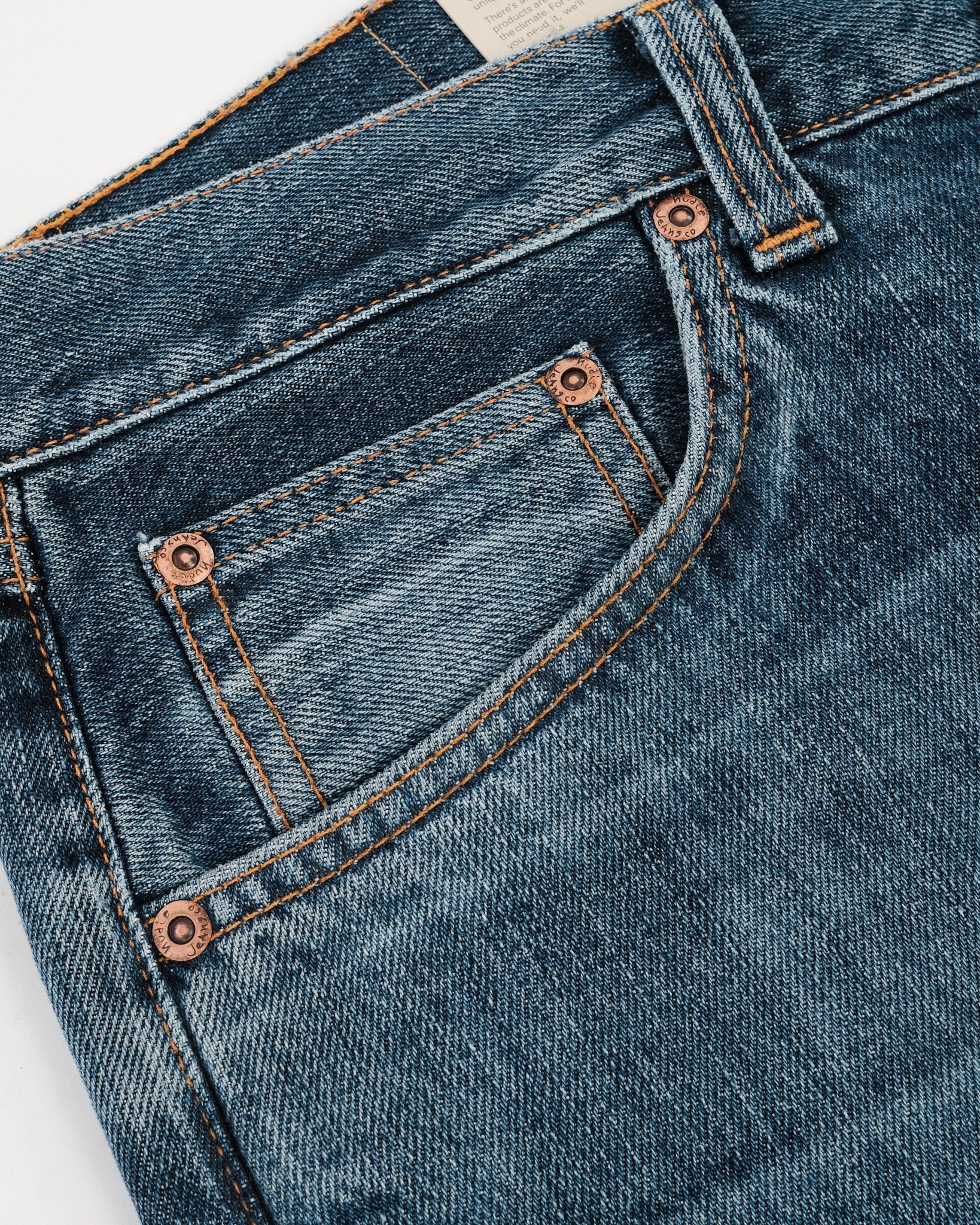 3. Premium denim med en klar mellemblå indigo vask for en vintage fornemmelse.