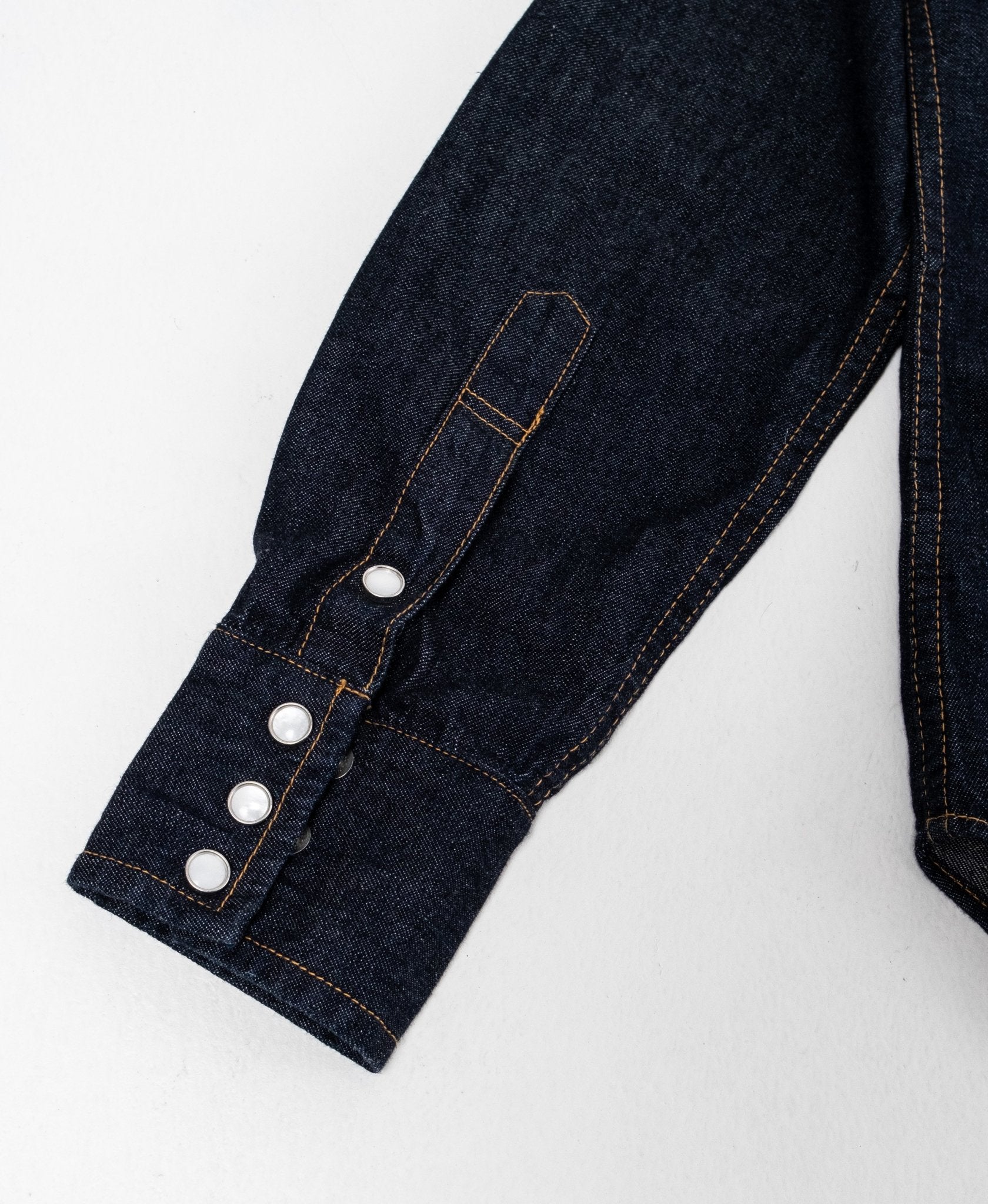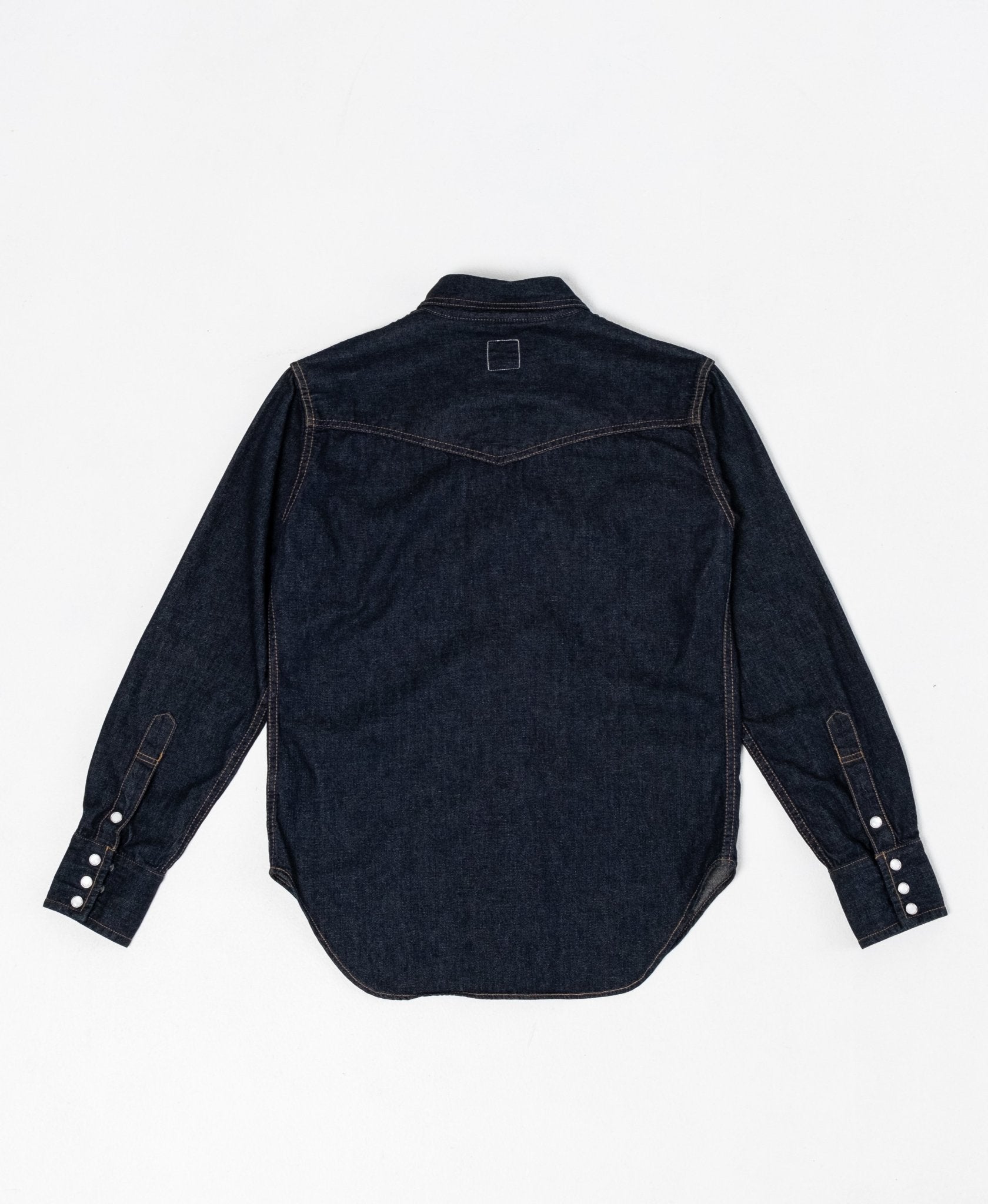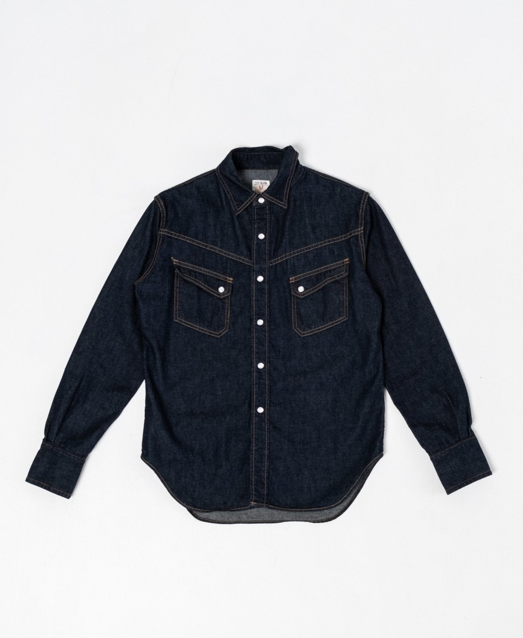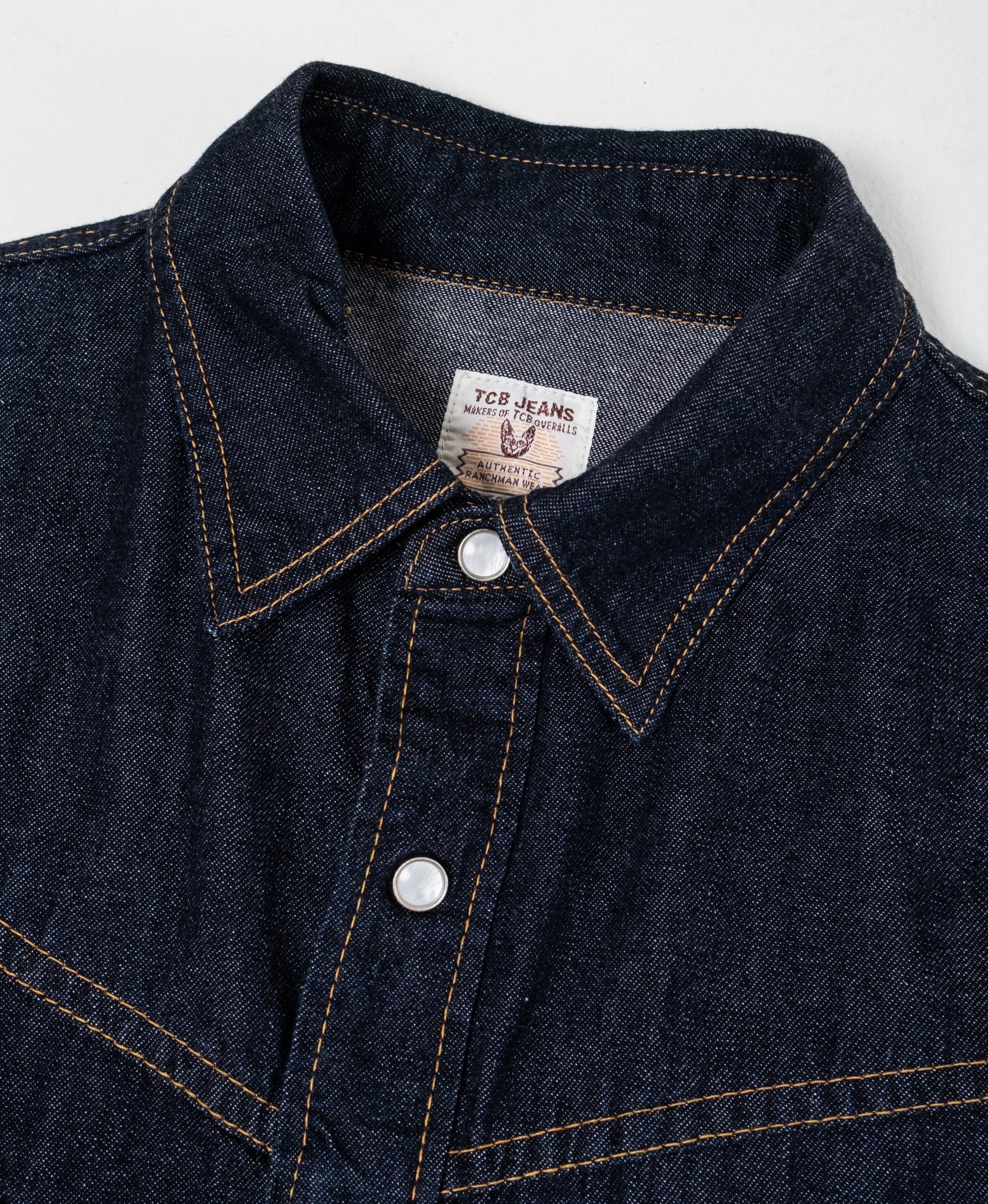 Ranchman Shirt Denim fra TCB. Denne skjorte har hentet sin inspiration fra 1940'ernes western-skjorter. Detaljerne er meget tæt på det originale, hvilket gør silhuetten en smule renere end den vintage version, derfor nem at matche med enhver stil. Denim er lavet af 8,5 oz californisk bomuld, der er langsomt vævet på en gammel væv. Det er en lidt lettere denim, der har nogle ujævnheder i stoffet. Fremstillet i Japan.