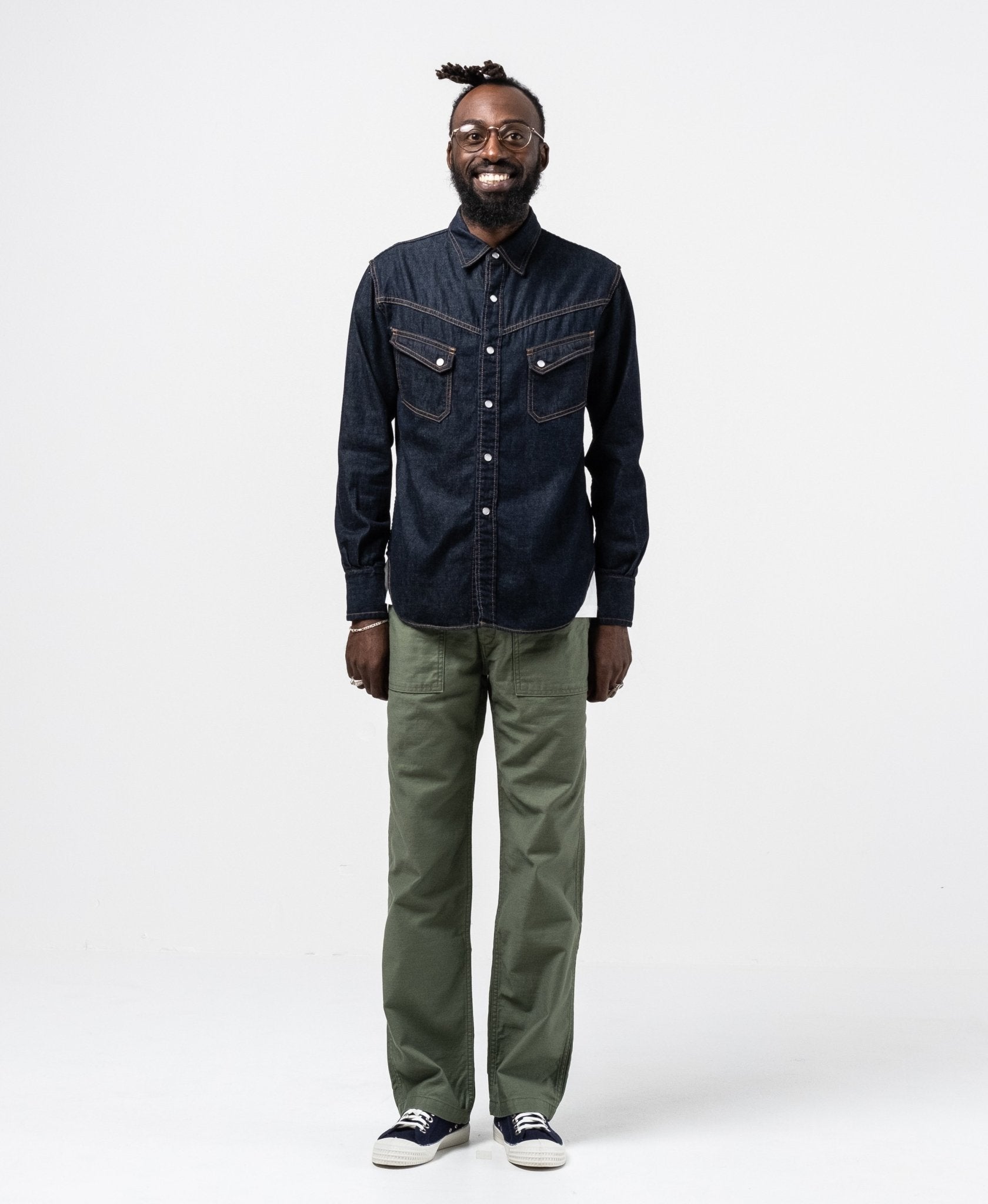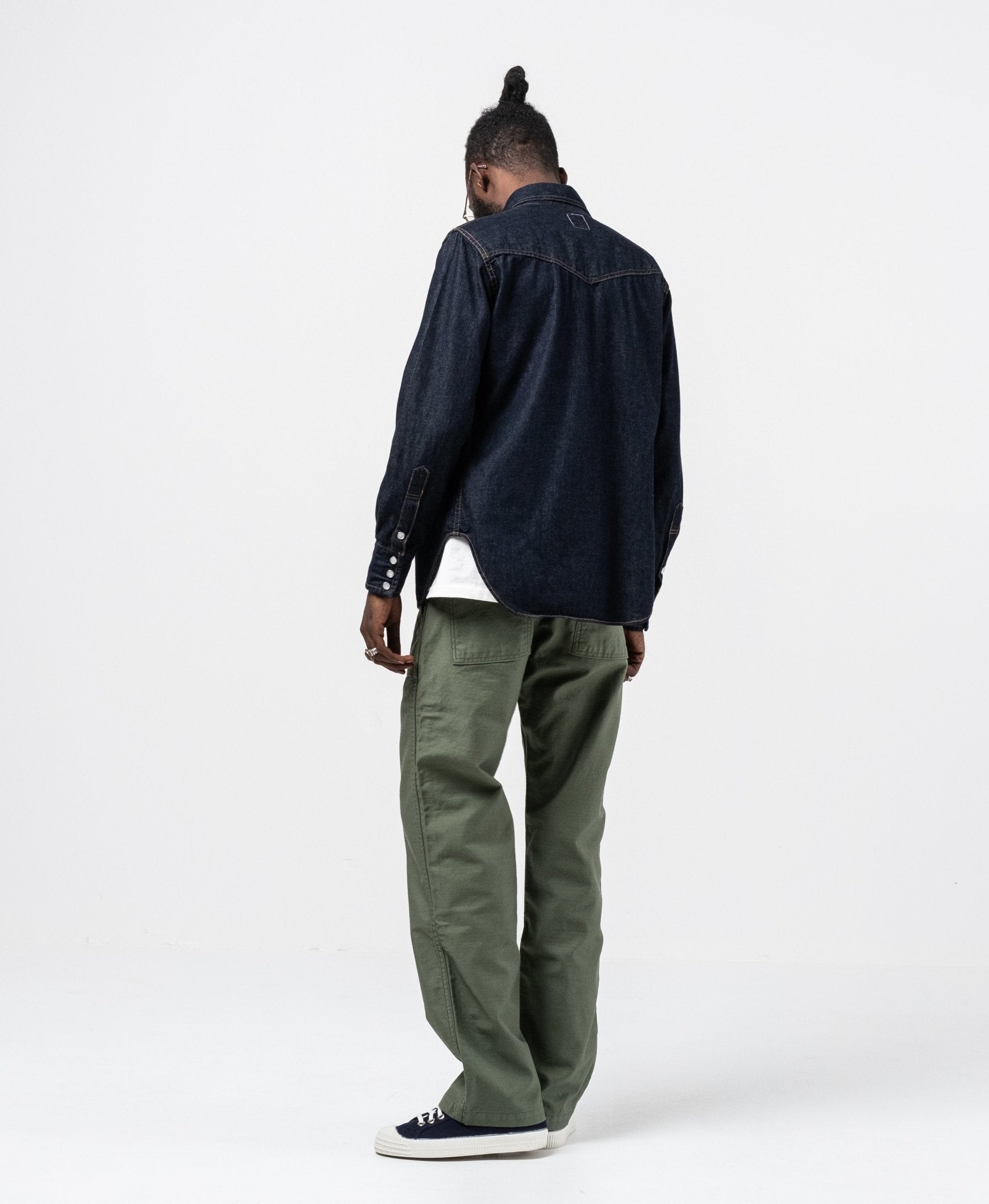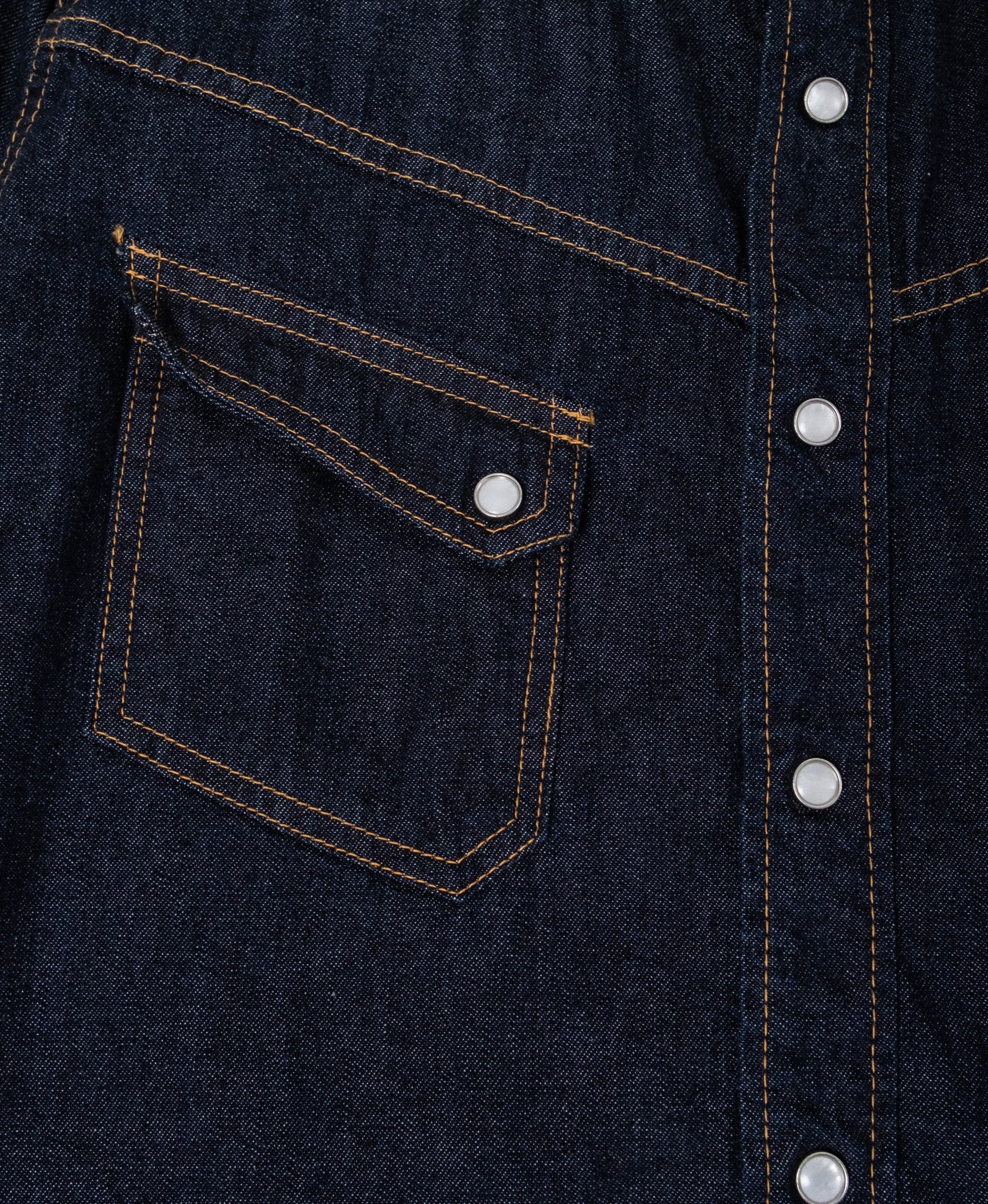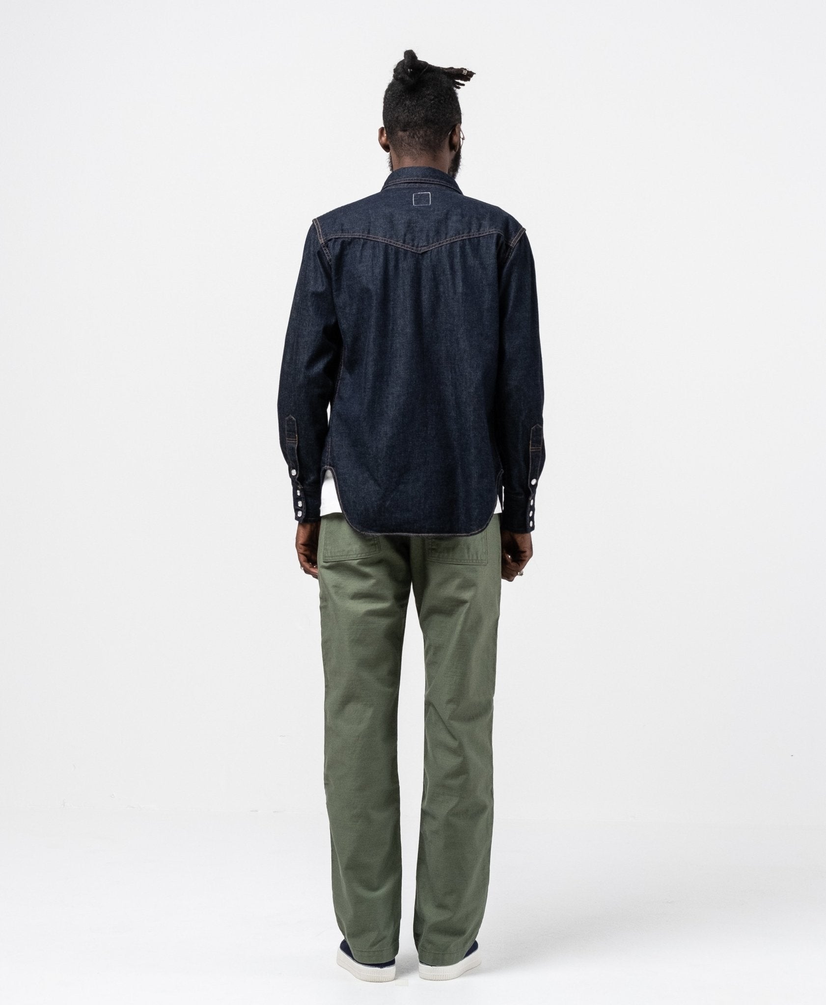 Ranchman Shirt Denim fra TCB. Denne skjorte har hentet sin inspiration fra 1940'ernes western-skjorter. Detaljerne er meget tæt på det originale, hvilket gør silhuetten en smule renere end den vintage version, derfor nem at matche med enhver stil. Denim er lavet af 8,5 oz californisk bomuld, der er langsomt vævet på en gammel væv. Det er en lidt lettere denim, der har nogle ujævnheder i stoffet. Fremstillet i Japan.