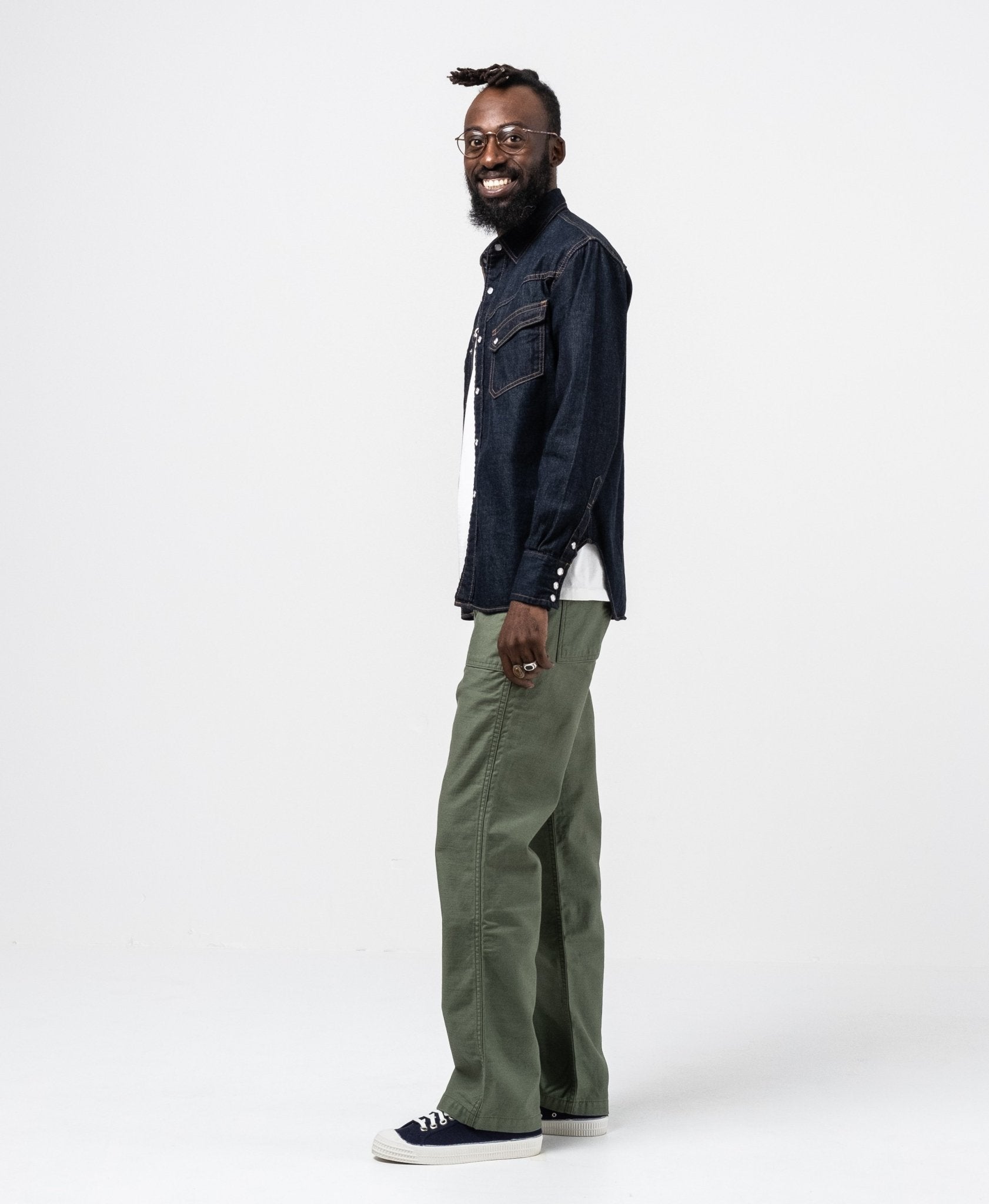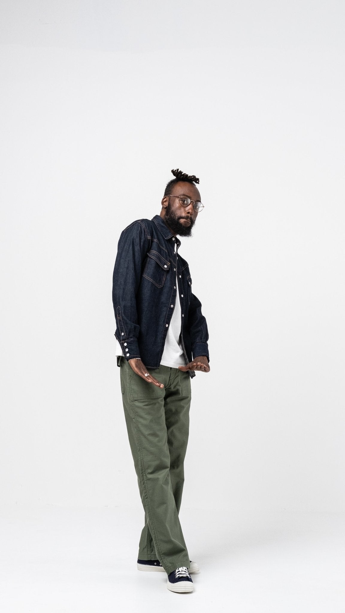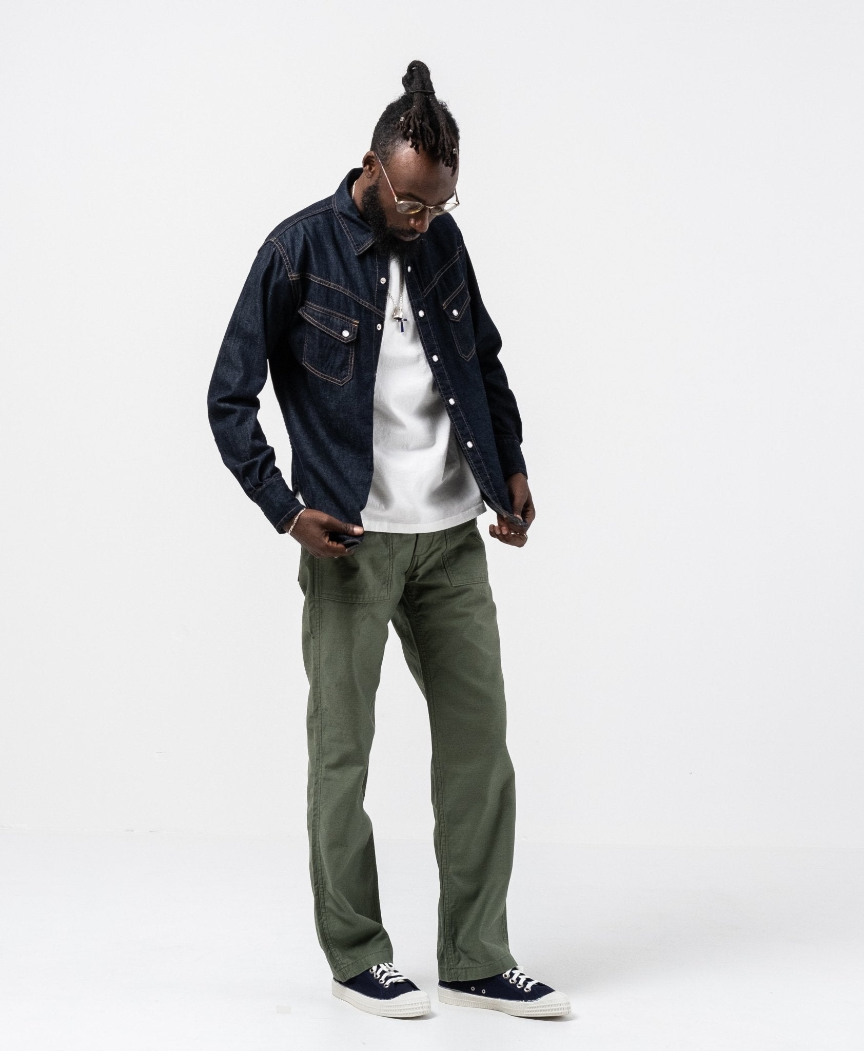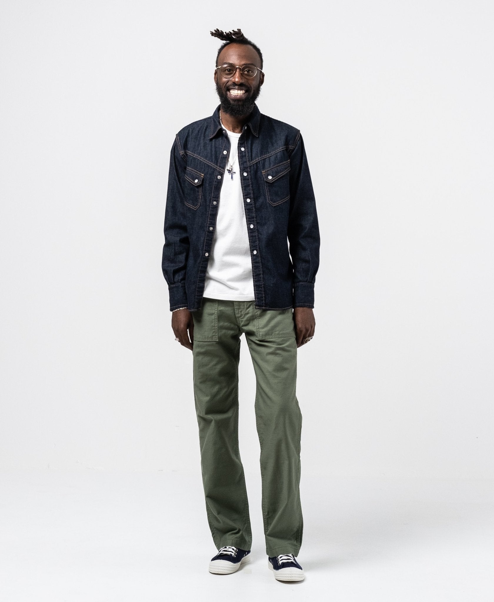 Ranchman Shirt Denim fra TCB. Denne skjorte har hentet sin inspiration fra 1940'ernes western-skjorter. Detaljerne er meget tæt på det originale, hvilket gør silhuetten en smule renere end den vintage version, derfor nem at matche med enhver stil. Denim er lavet af 8,5 oz californisk bomuld, der er langsomt vævet på en gammel væv. Det er en lidt lettere denim, der har nogle ujævnheder i stoffet. Fremstillet i Japan.