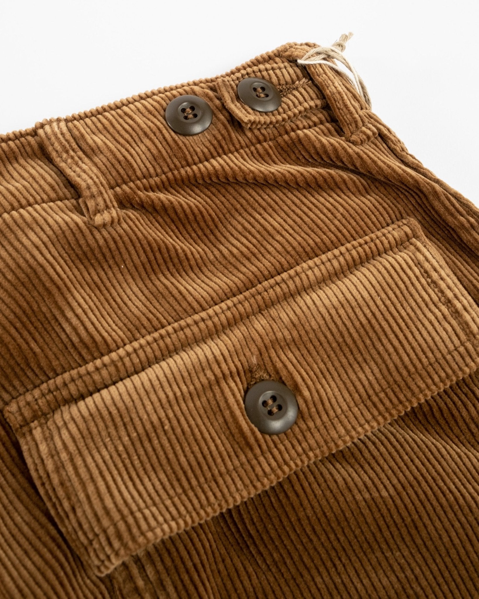 Afslappet pasform, ydre bag- og forlommer, knapflue og justerbar talje. Fremstillet af et tykt 100% premium japansk bomuldscordfløjl, 4-lomme japansk twill konstruktion, knapflue, tonale syninger og et let tilspidset ben.