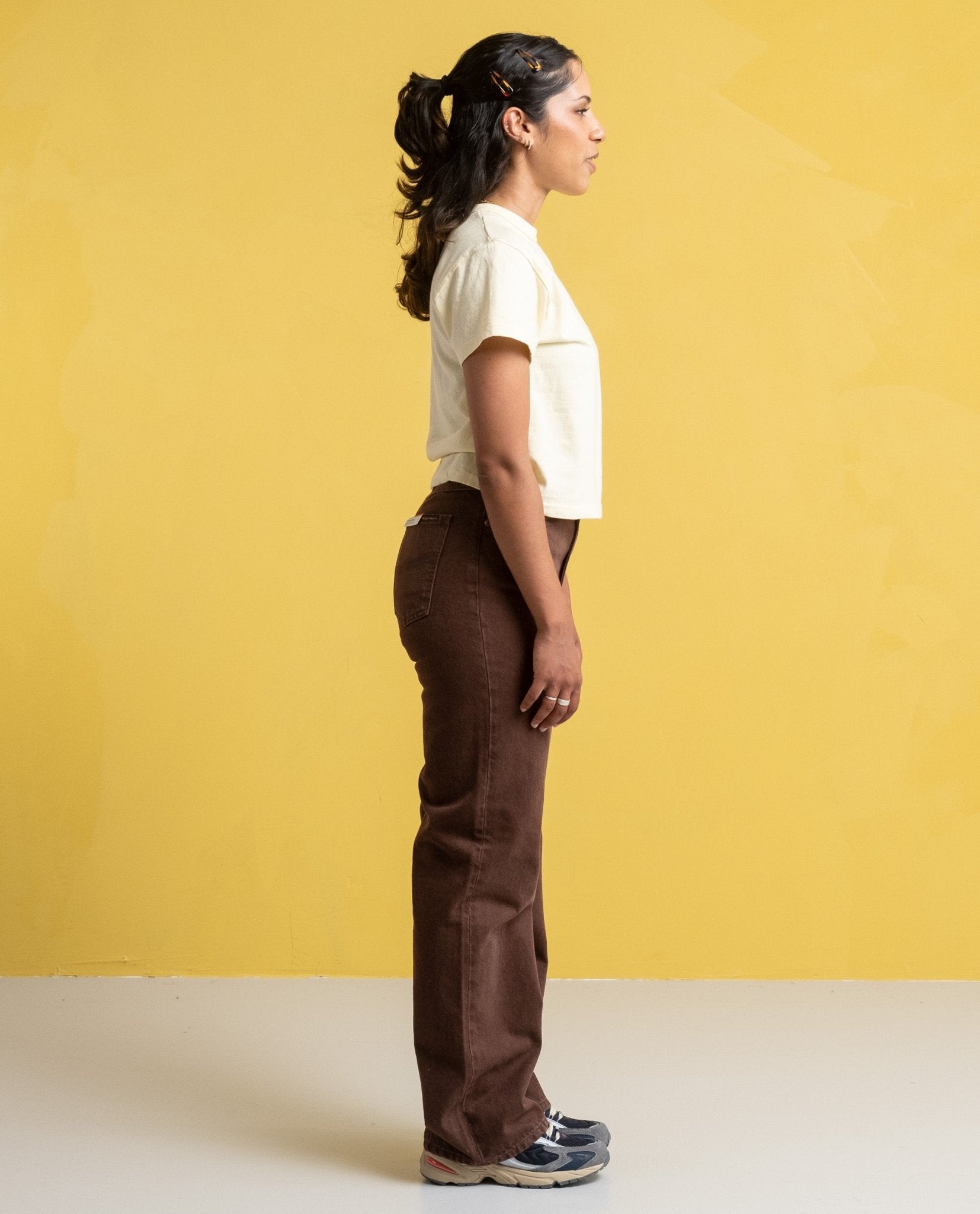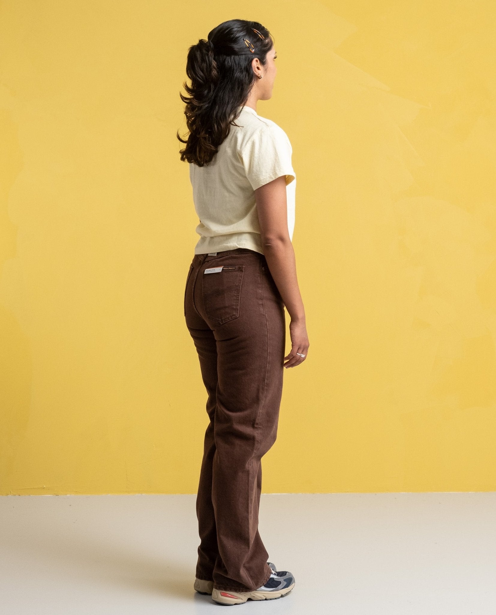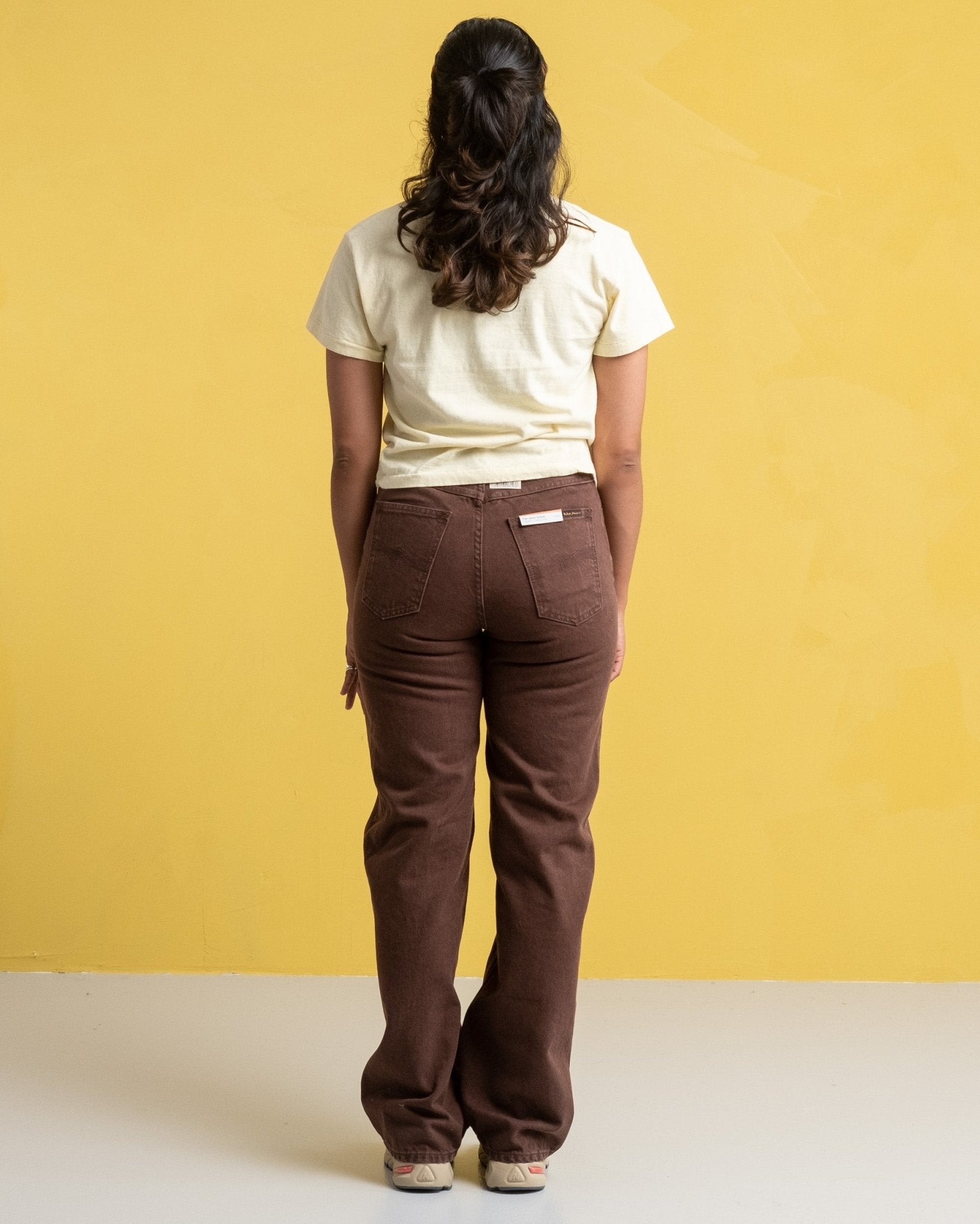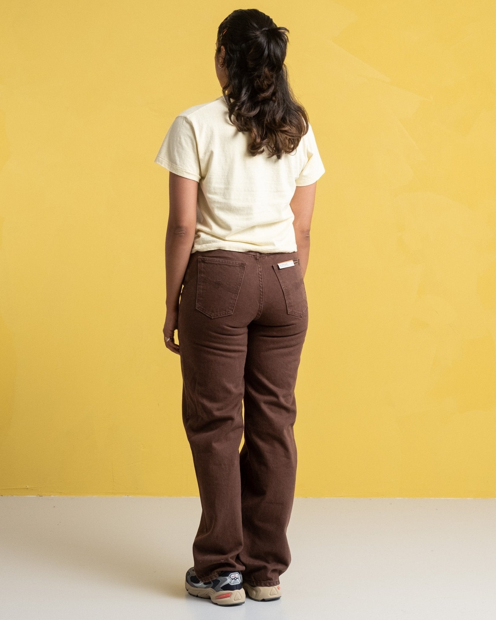 Clean Eileen Cinnamon fra Nudie Jeans Co. Loose fit damejeans med høj talje og brede ben. Her i en dejlig jordnær tone med et subtilt slidt look. Fremstillet af 100% økologisk bomuld. Fremstillet i Tunesien.