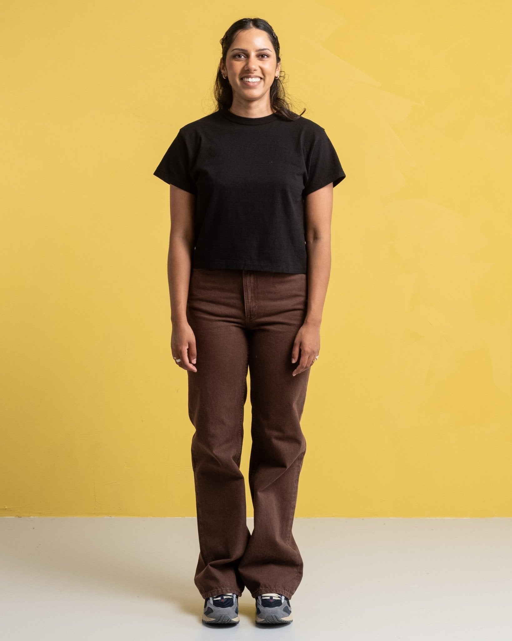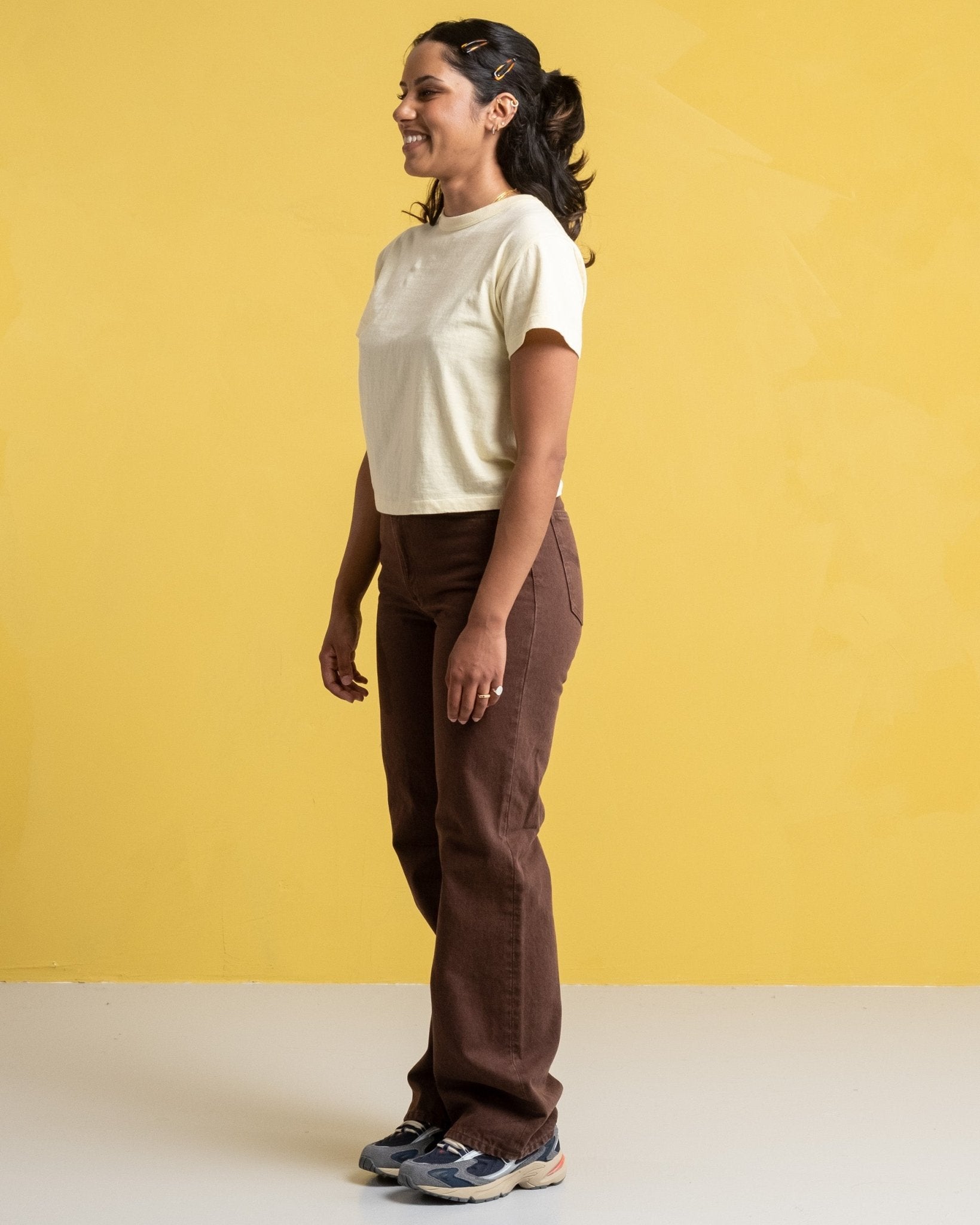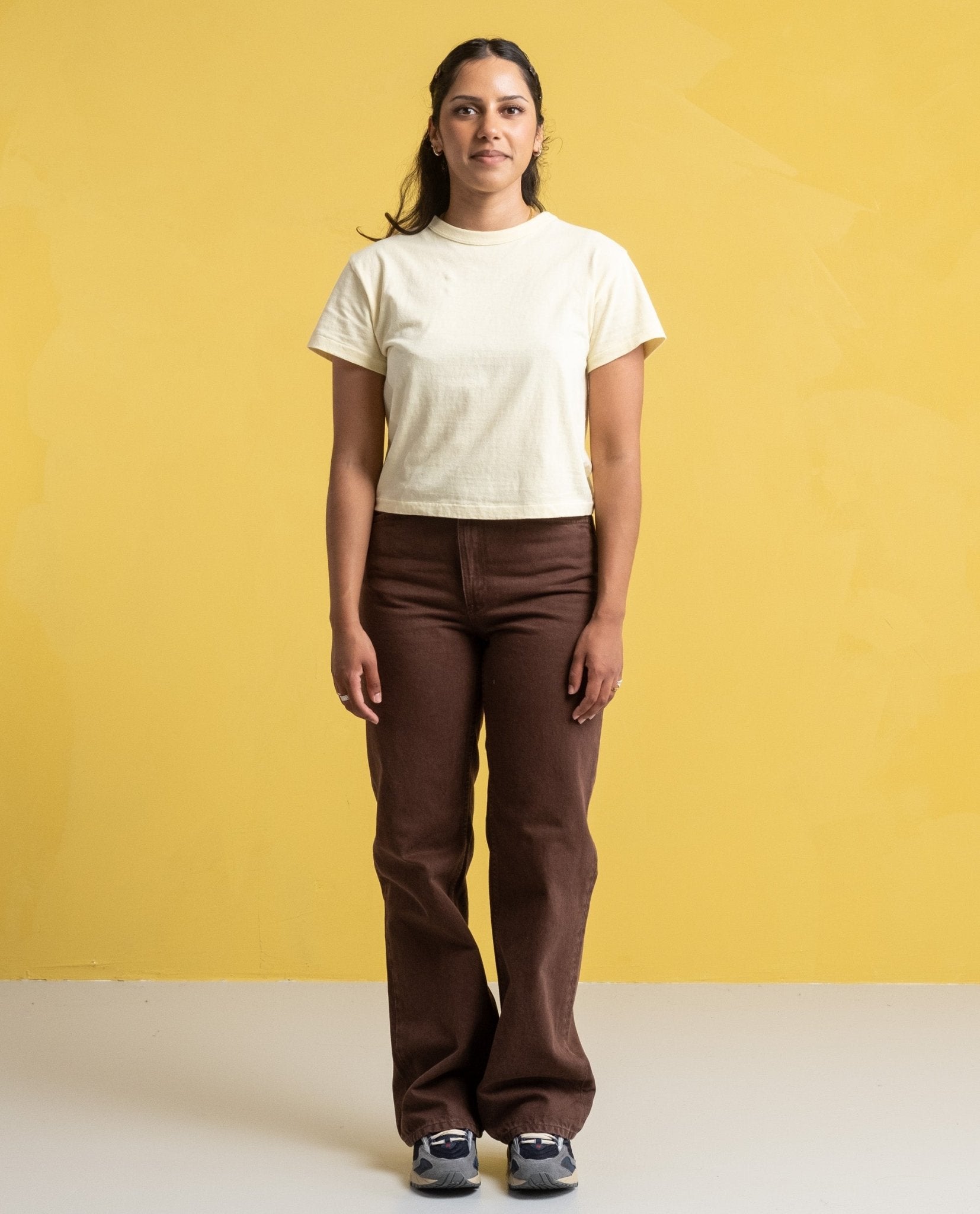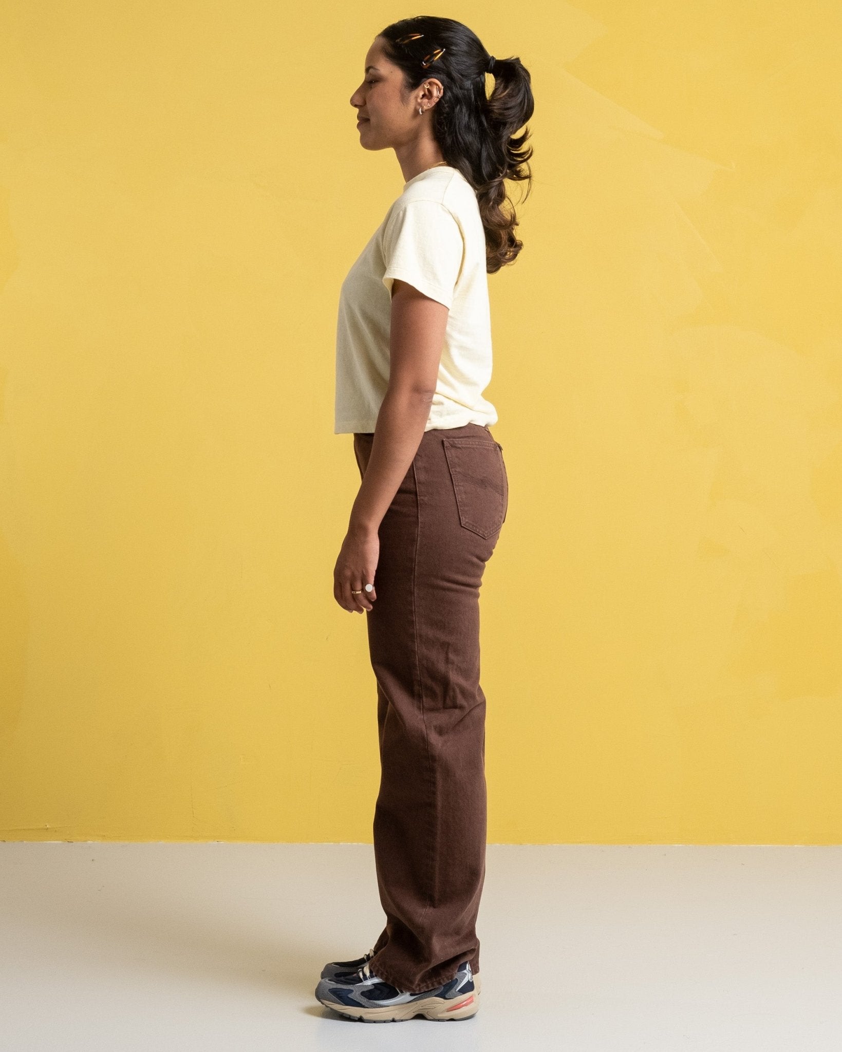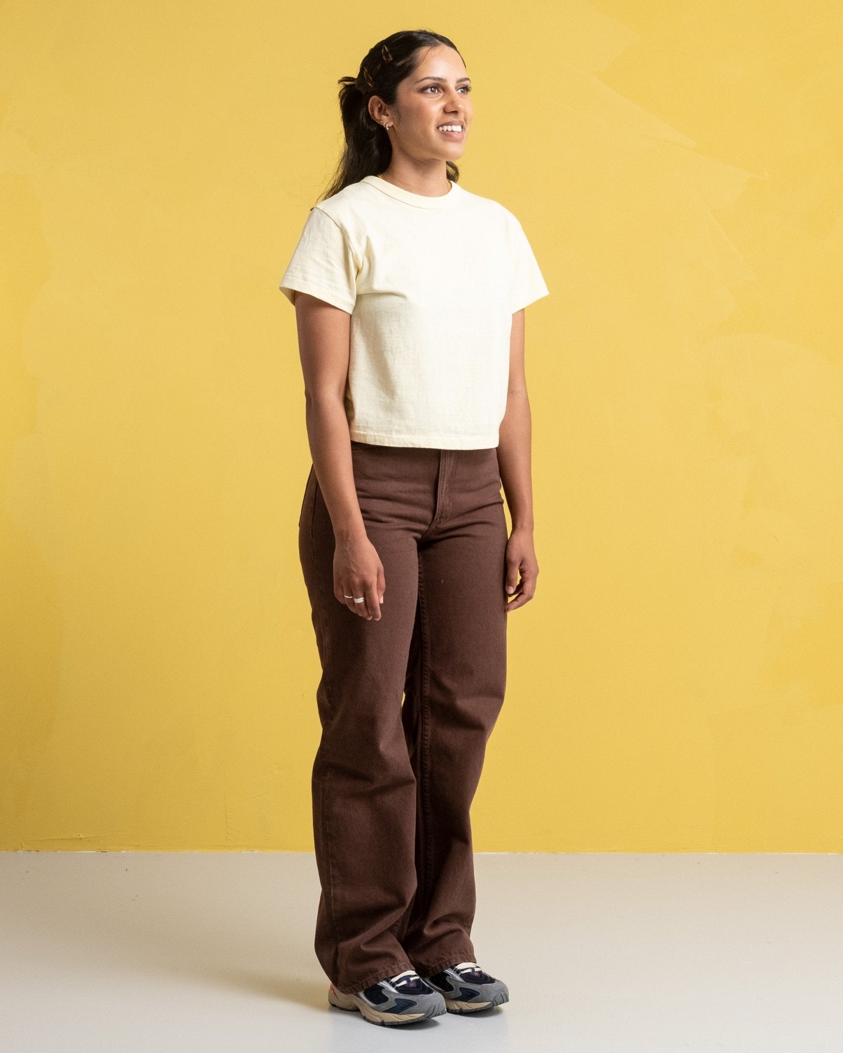 Clean Eileen Cinnamon fra Nudie Jeans Co. Loose fit damejeans med høj talje og brede ben. Her i en dejlig jordnær tone med et subtilt slidt look. Fremstillet af 100% økologisk bomuld. Fremstillet i Tunesien.