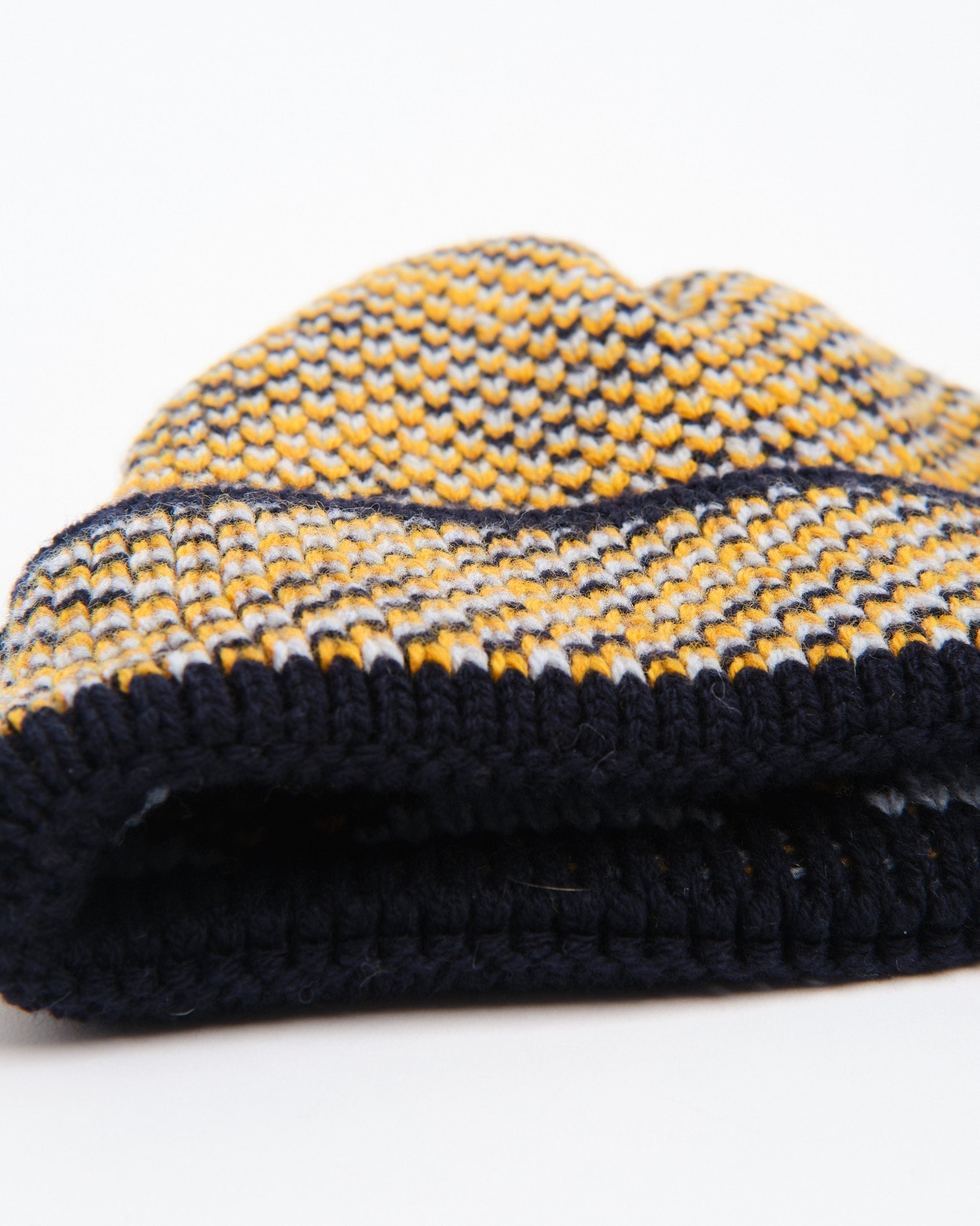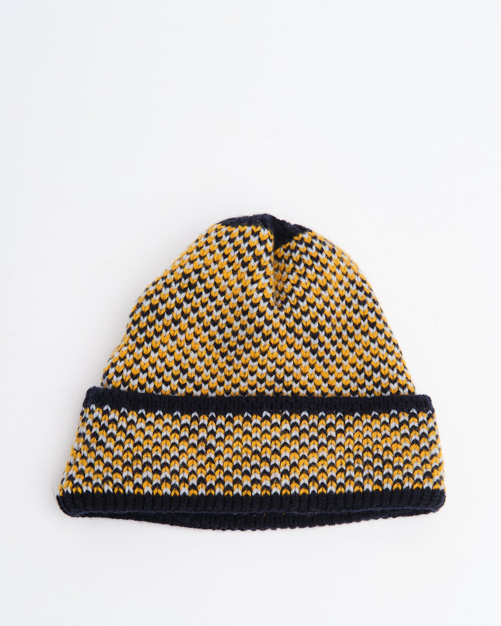 Reverse Geo Beanien i Navy fra Found Feather bringer grafisk struktur og forhøjet tekstur sammen i én kompakt pakke. Fremstillet i Japan af vaskbart italiensk Donegal uld, den har et fedt omvendt jacquard strikmønster, der tilføjer dimension uden unødig volumen. Et blødt stræk garn og konstruktion med ét panel tilbyder en glat, sikker pasform, mens den regulære 7 cm skygge giver den et klassisk touch. Afsluttet med et vævet mærke og et QR-kodet plejemærke, blander denne beanie iøjnefaldende design med komfort i koldt vejr.