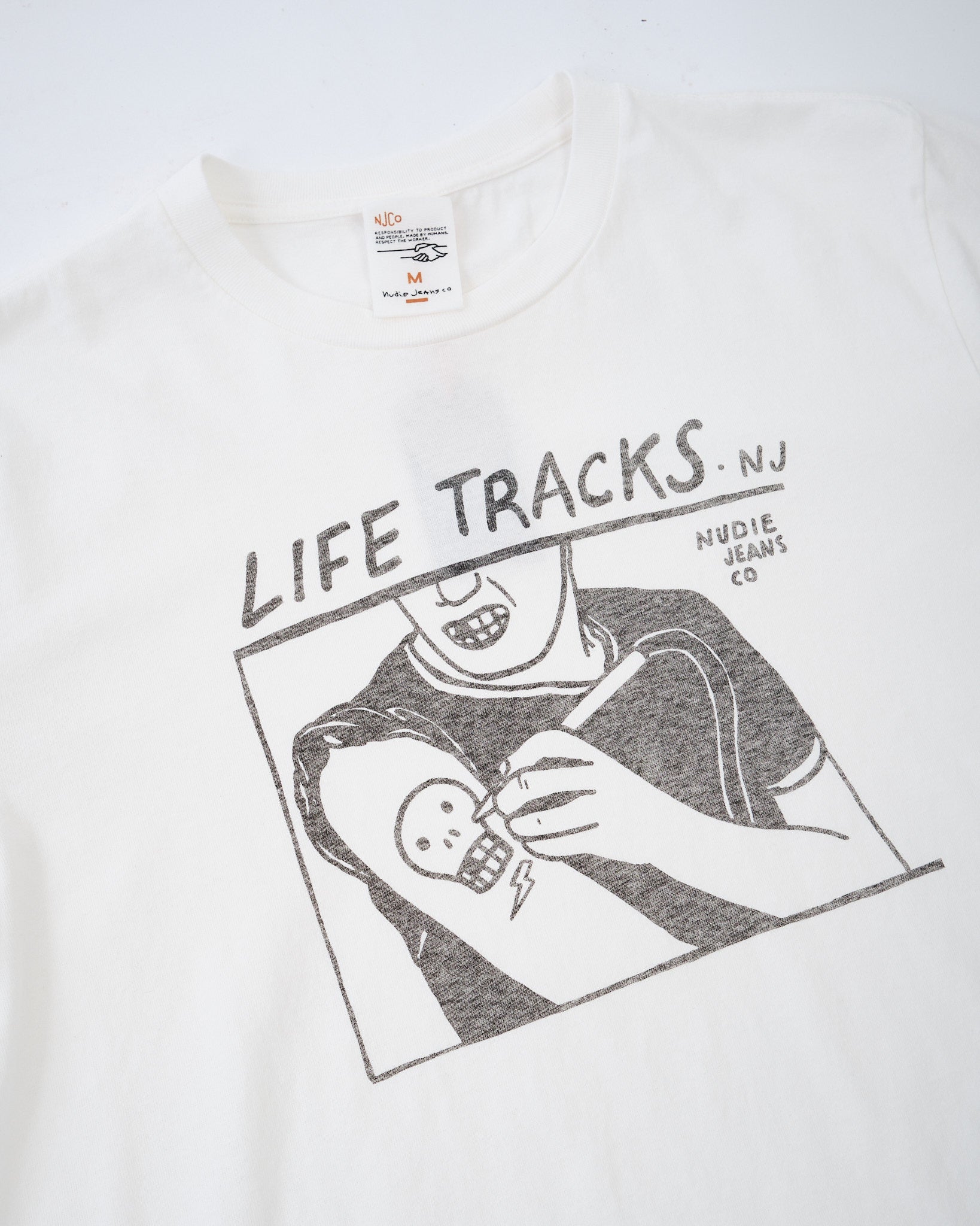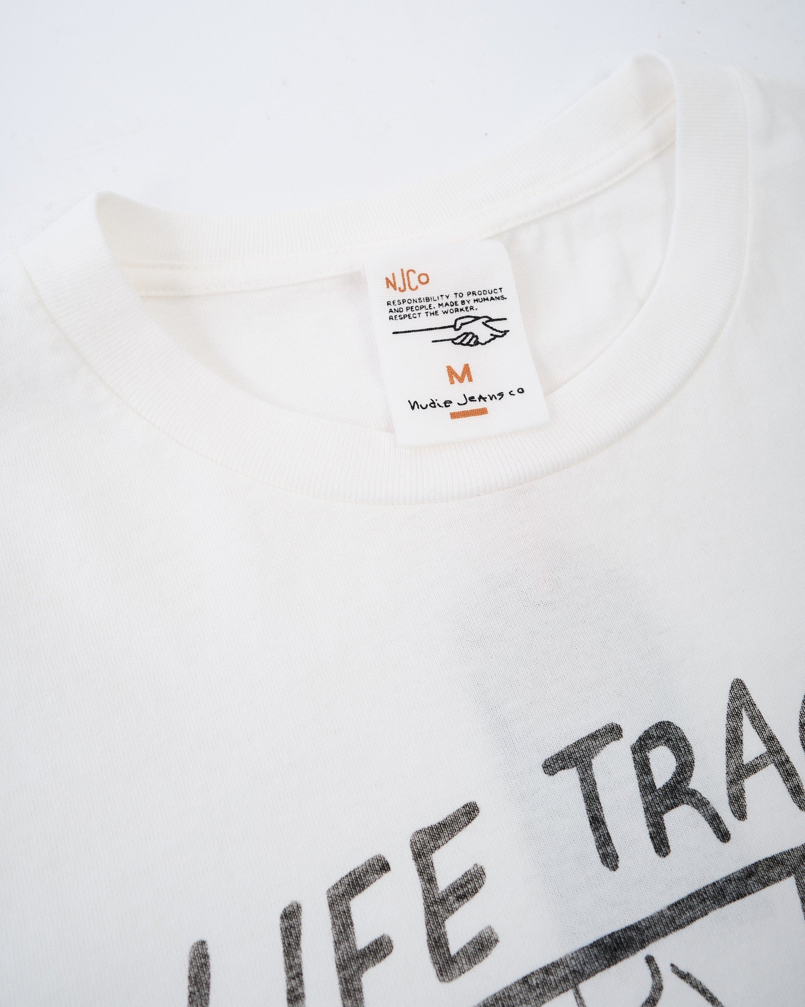 The NUDIE JEANS CO. ROY LIFE TRACKS T-SHIRT CHALK WHITE er en klassisk rundhals t-shirt designet til et afslappet, vintage-inspireret look. Lavet af 100% økologisk bomuld, den har åbent endt spundet garn, hvilket skaber en åben strikstruktur med en uregelmæssig tekstur, en tør håndfølelse og subtil hårlighed.