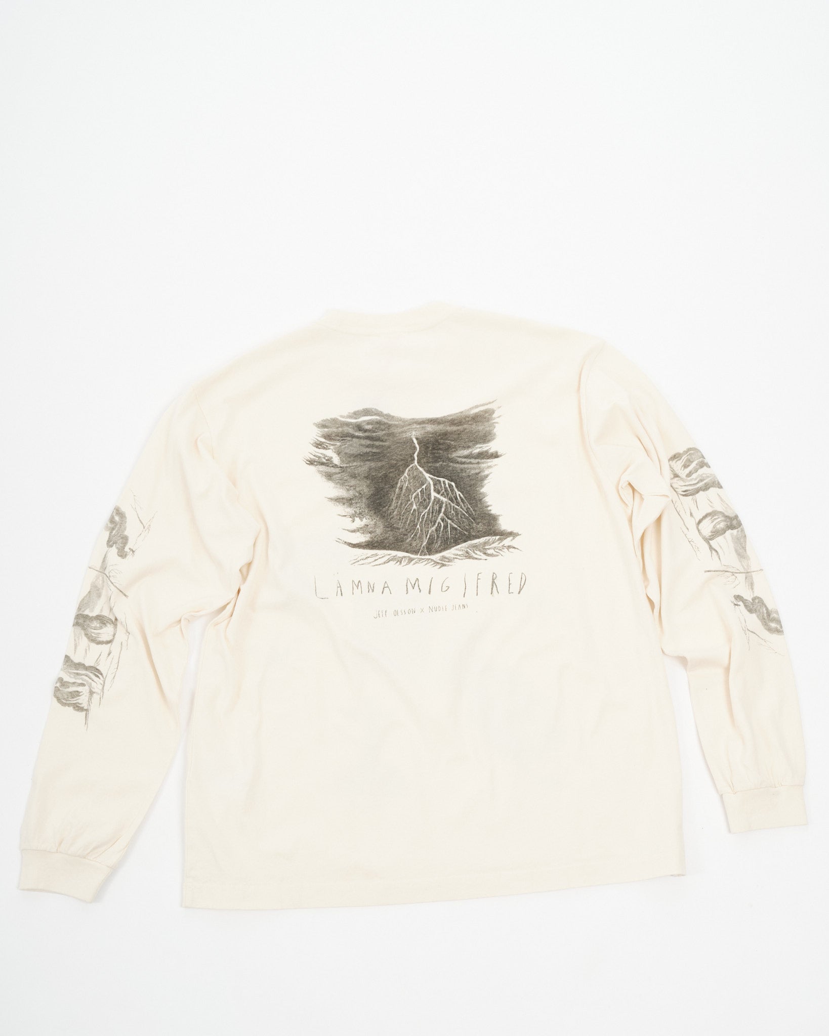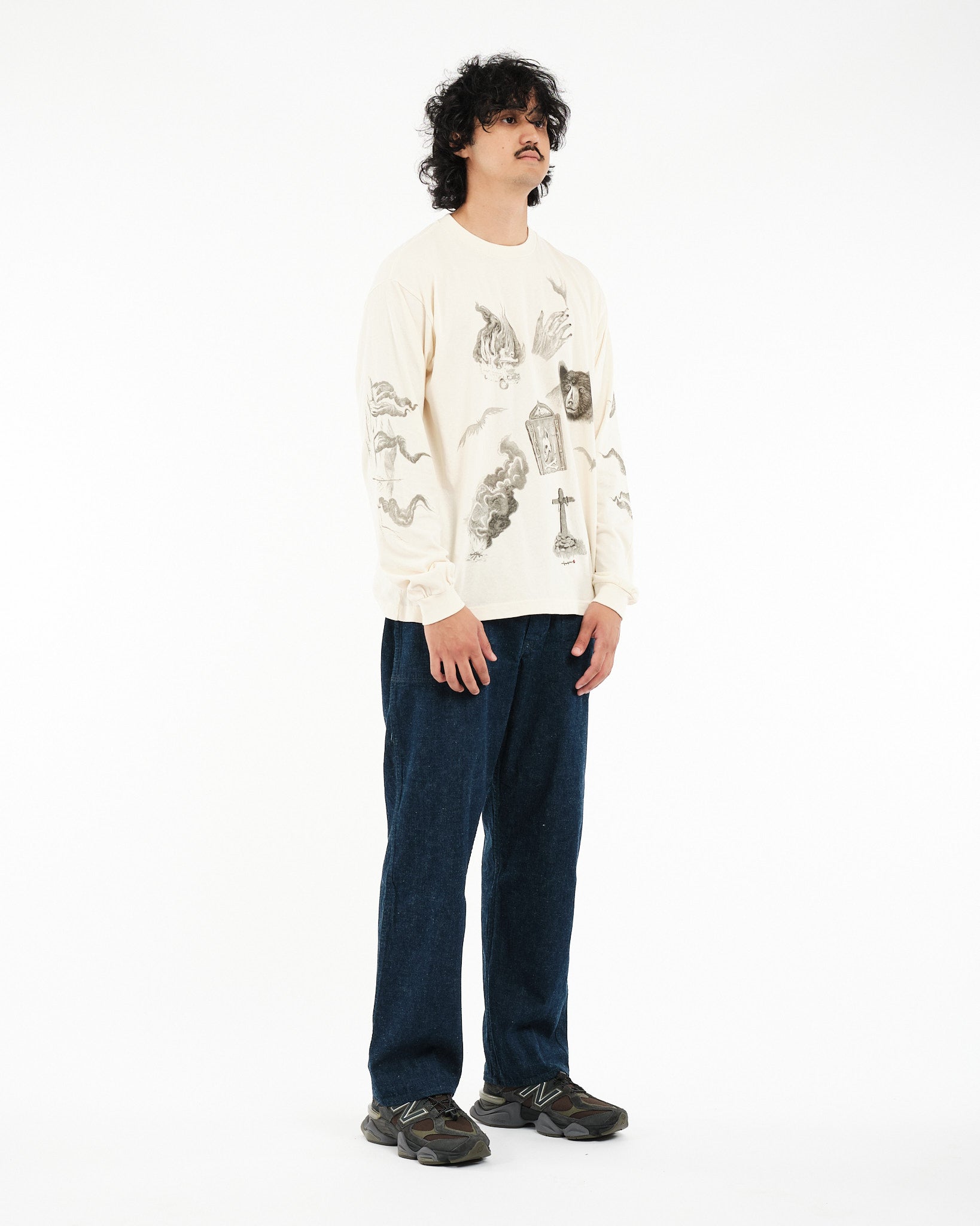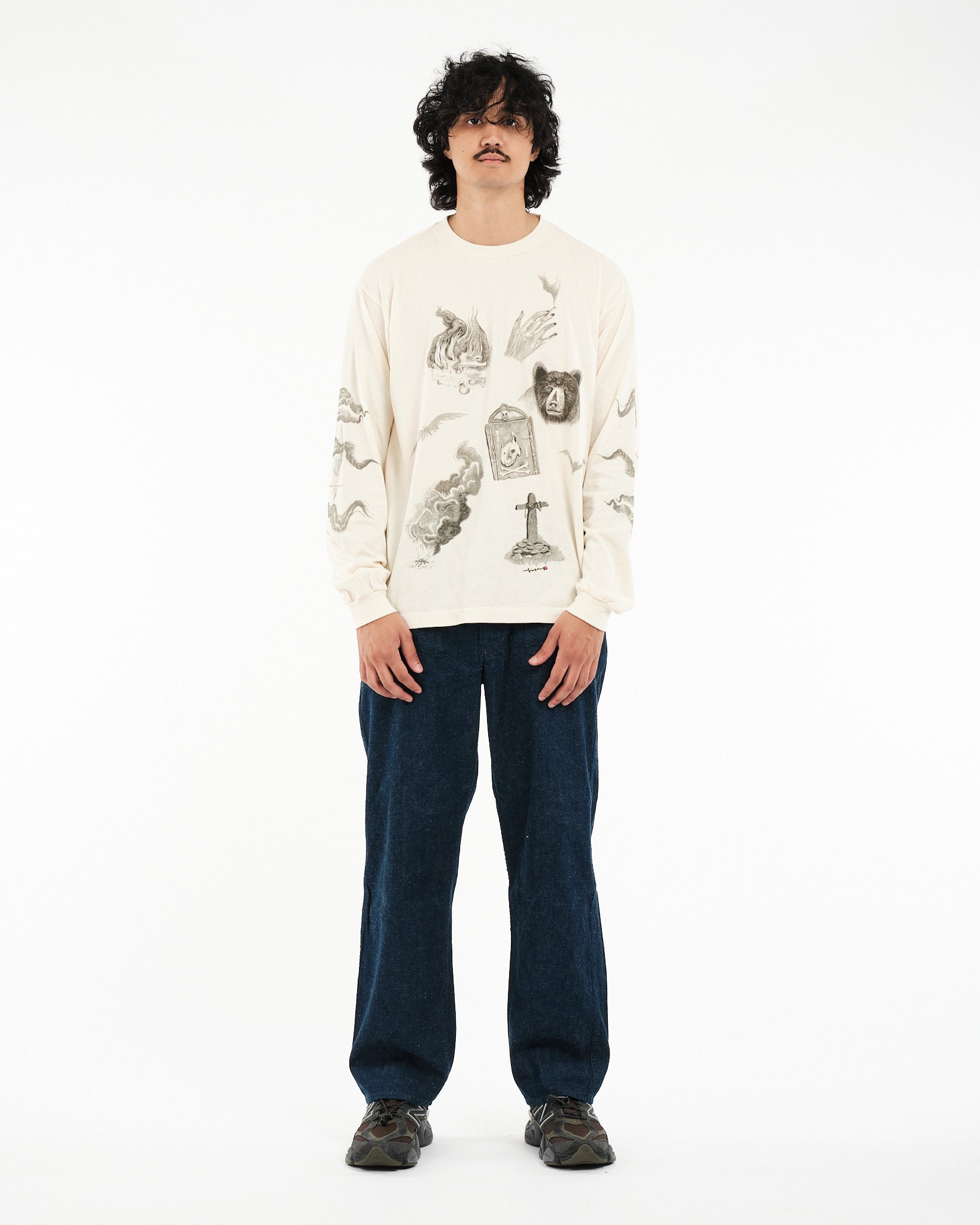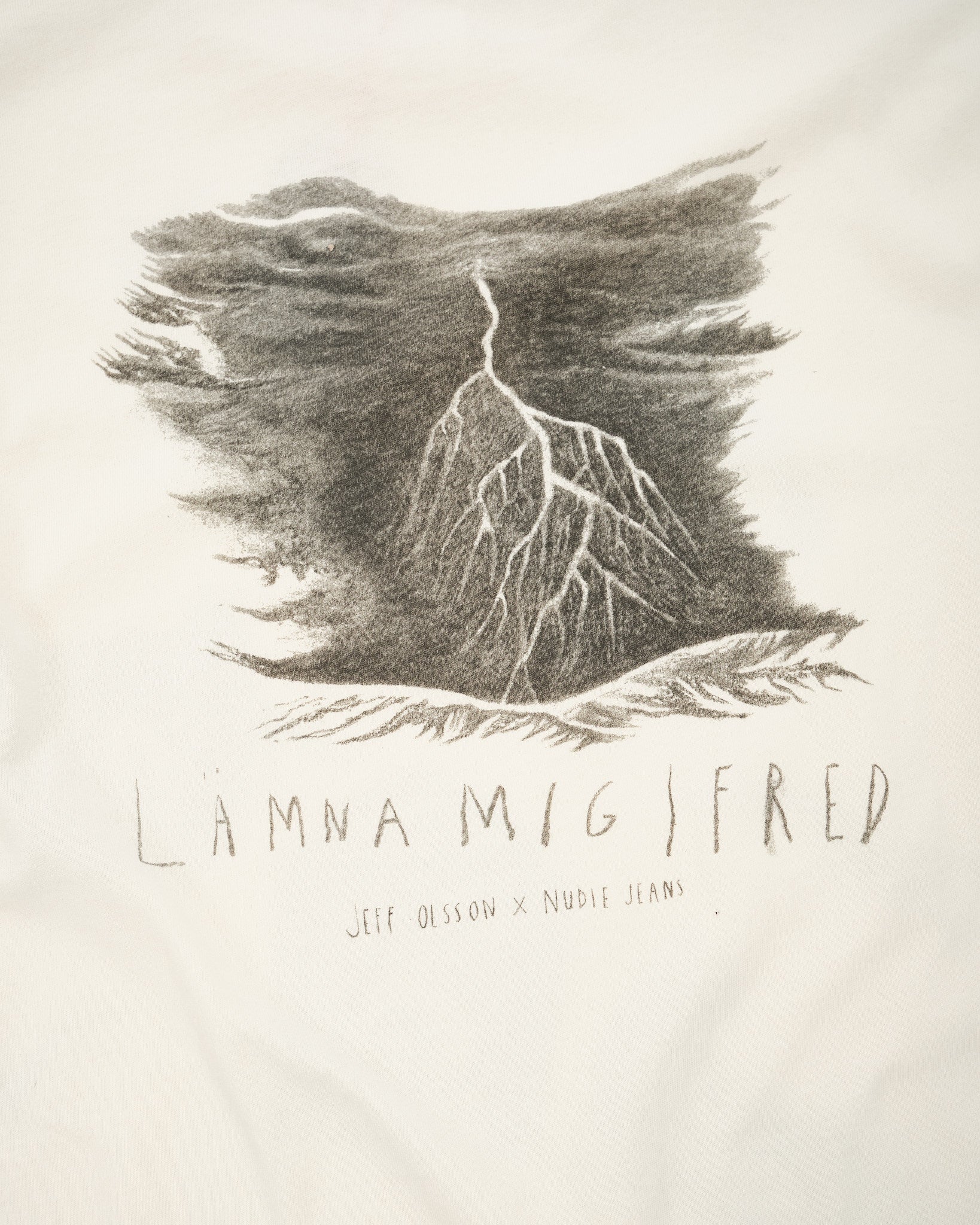 Værdsæt kreativiteten hos Nudie Jeans Co. Rudi Doodle Off White T Shirt, der fremviser originale designs af kunstneren Jeff Olsson fra Göteborg. Fremstillet af økologisk bomuld har denne langærmede T-shirt med rund hals en fængslende samling af blyantsdoodler, hver en lille kunstværk, der afspejler Olssons karakteristiske præg af melankoli og dybde. Det svenske udtryk "Lämna mig ifred" er elegant vist på bagsiden, hvilket tilføjer et flair til designet. Skjortens tekstur er beriget af strikningen og den lette fnuggethed fra det ring spundne garn med kontrasterende grå oversting, der fremhæver dens kunstneriske charme.