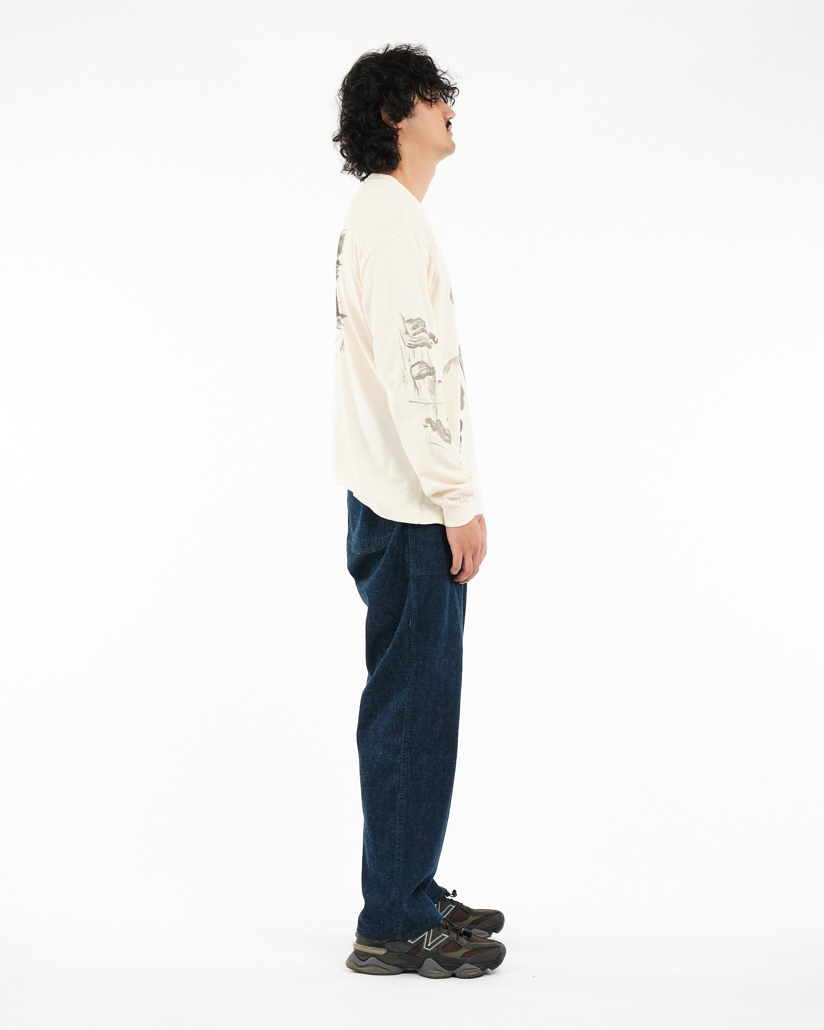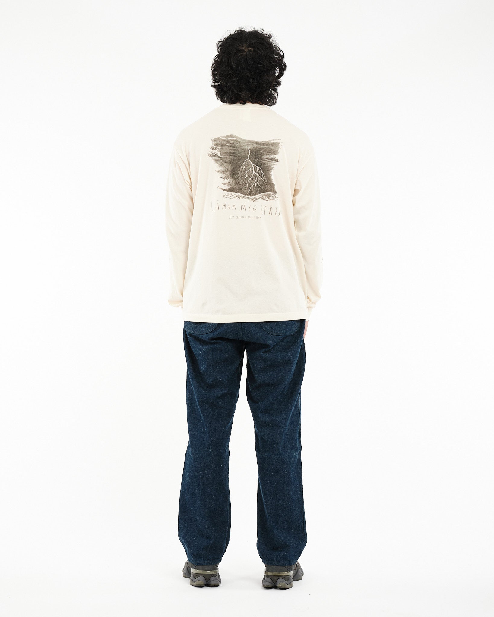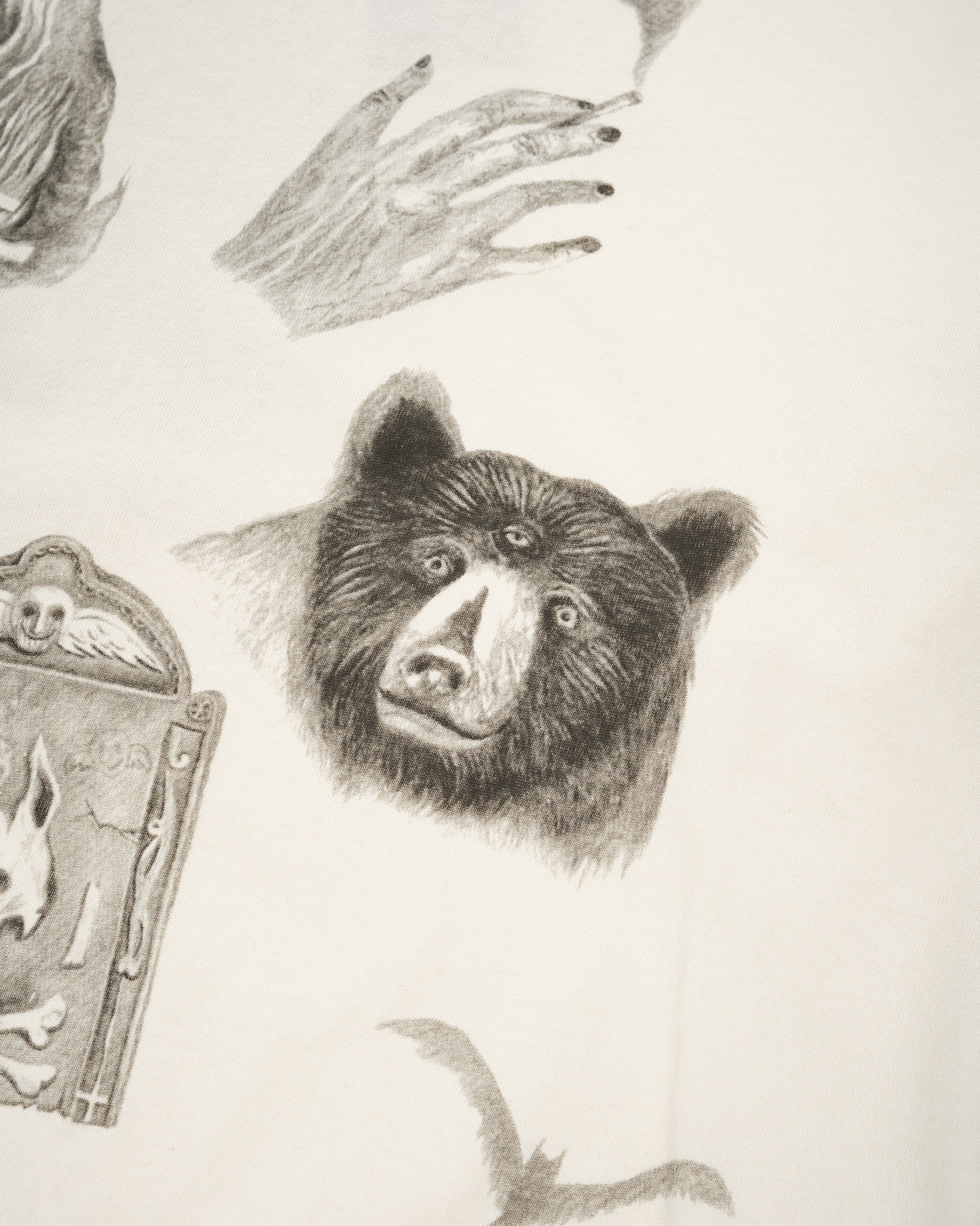 Værdsæt kreativiteten hos Nudie Jeans Co. Rudi Doodle Off White T Shirt, der fremviser originale designs af kunstneren Jeff Olsson fra Göteborg. Fremstillet af økologisk bomuld har denne langærmede T-shirt med rund hals en fængslende samling af blyantsdoodler, hver en lille kunstværk, der afspejler Olssons karakteristiske præg af melankoli og dybde. Det svenske udtryk "Lämna mig ifred" er elegant vist på bagsiden, hvilket tilføjer et flair til designet. Skjortens tekstur er beriget af strikningen og den lette fnuggethed fra det ring spundne garn med kontrasterende grå oversting, der fremhæver dens kunstneriske charme.