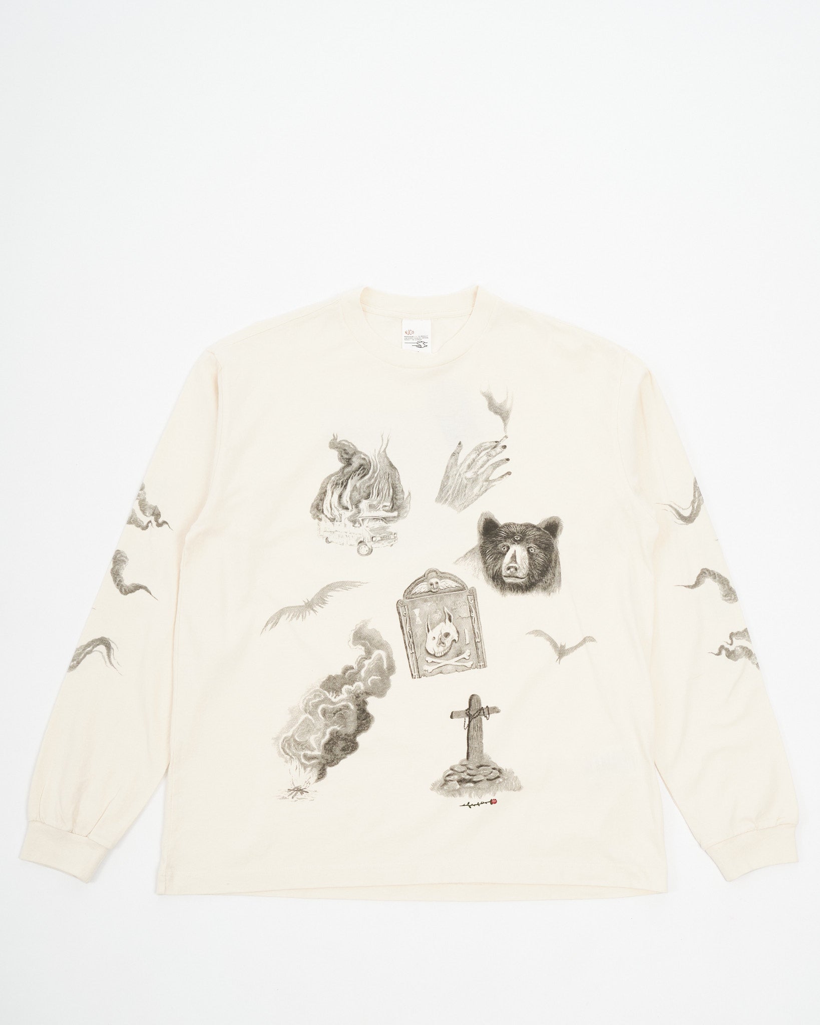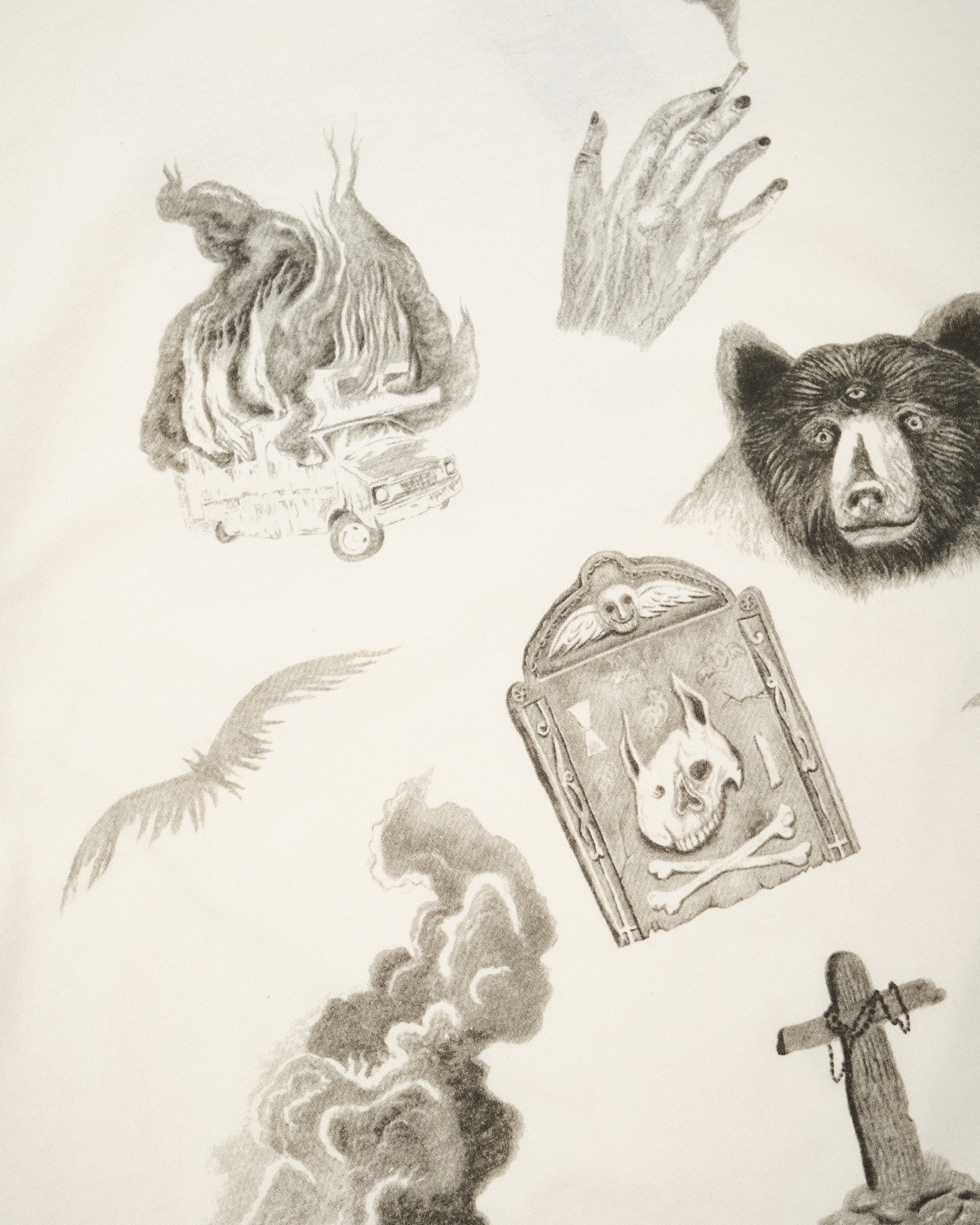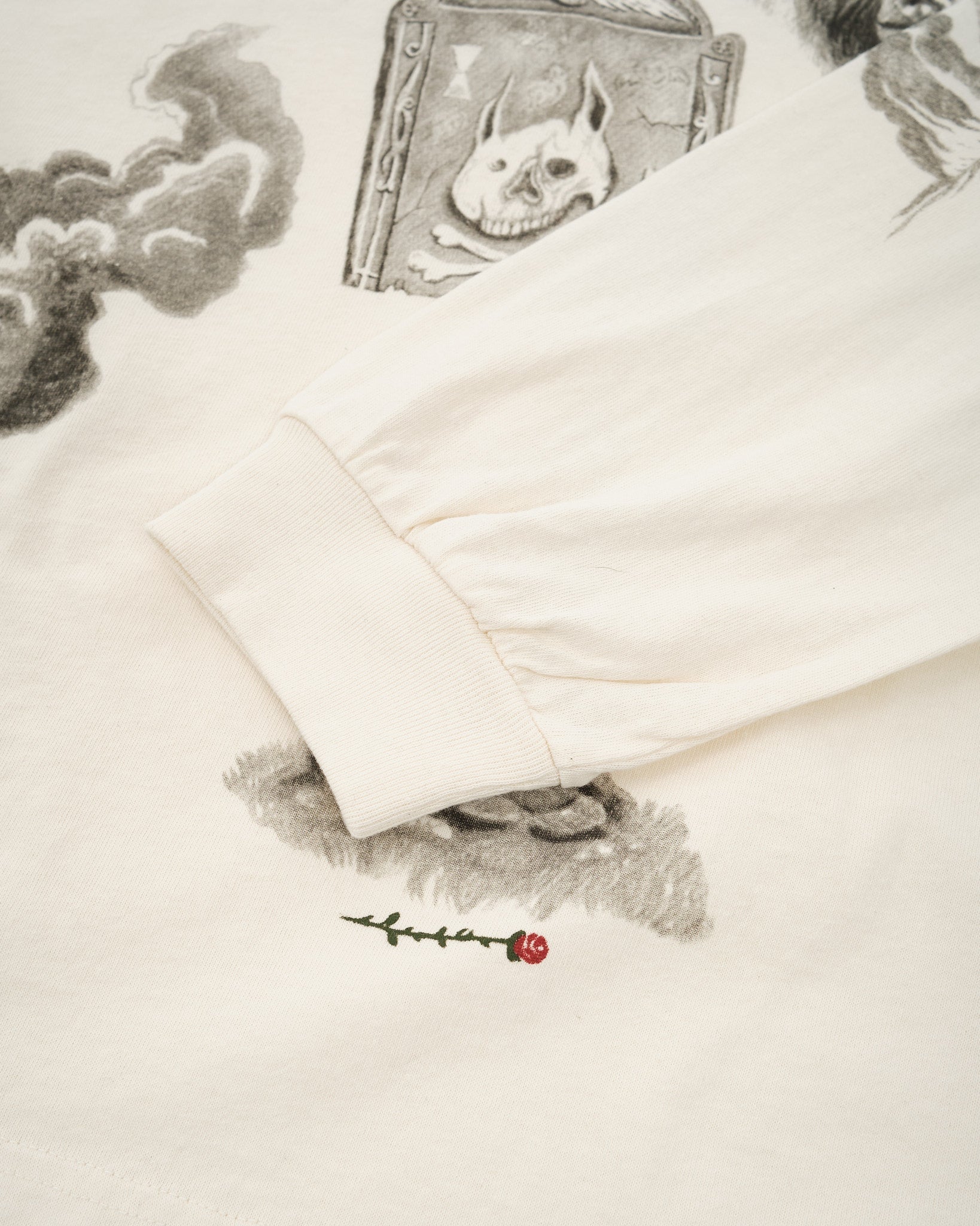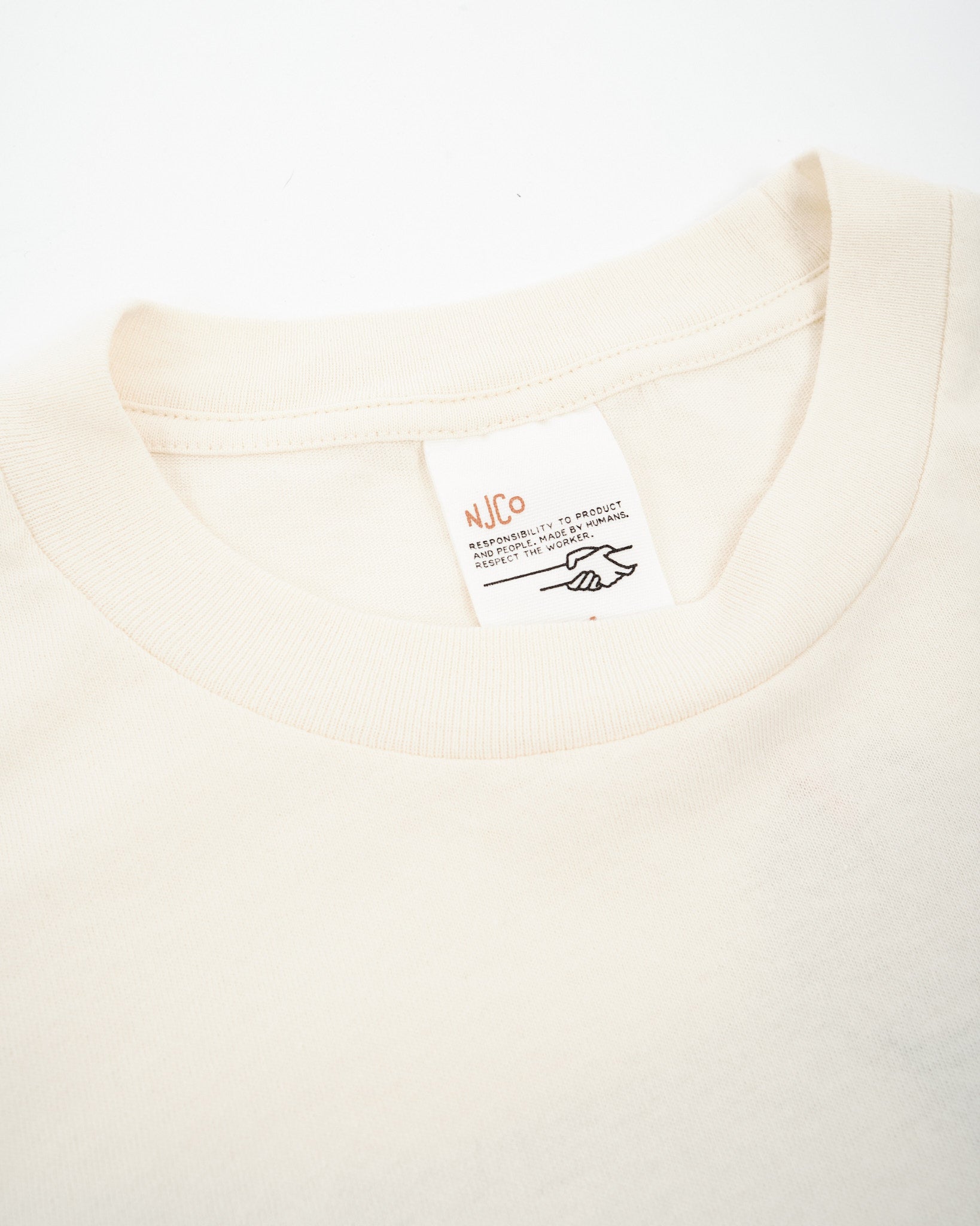 Værdsæt kreativiteten hos Nudie Jeans Co. Rudi Doodle Off White T Shirt, der fremviser originale designs af kunstneren Jeff Olsson fra Göteborg. Fremstillet af økologisk bomuld har denne langærmede T-shirt med rund hals en fængslende samling af blyantsdoodler, hver en lille kunstværk, der afspejler Olssons karakteristiske præg af melankoli og dybde. Det svenske udtryk "Lämna mig ifred" er elegant vist på bagsiden, hvilket tilføjer et flair til designet. Skjortens tekstur er beriget af strikningen og den lette fnuggethed fra det ring spundne garn med kontrasterende grå oversting, der fremhæver dens kunstneriske charme.