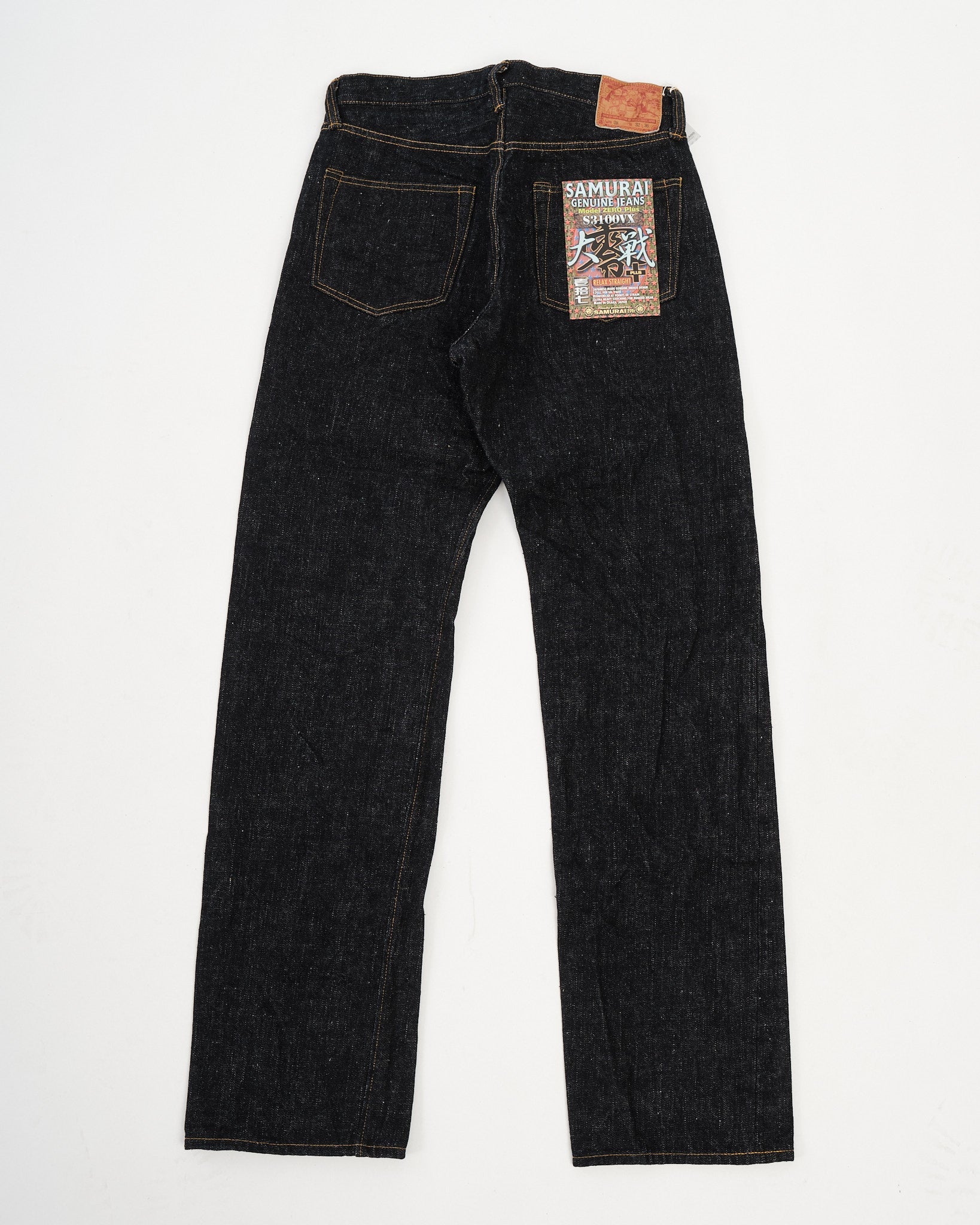Each pair includes an exclusive flasher, a commemorative leather patch, and an initial serial number, making it both a rugged garment and a collectible piece of Samurai heritage. A wide, relaxed fit that stays true to wartime denim roots — tough, practical, and timeless.