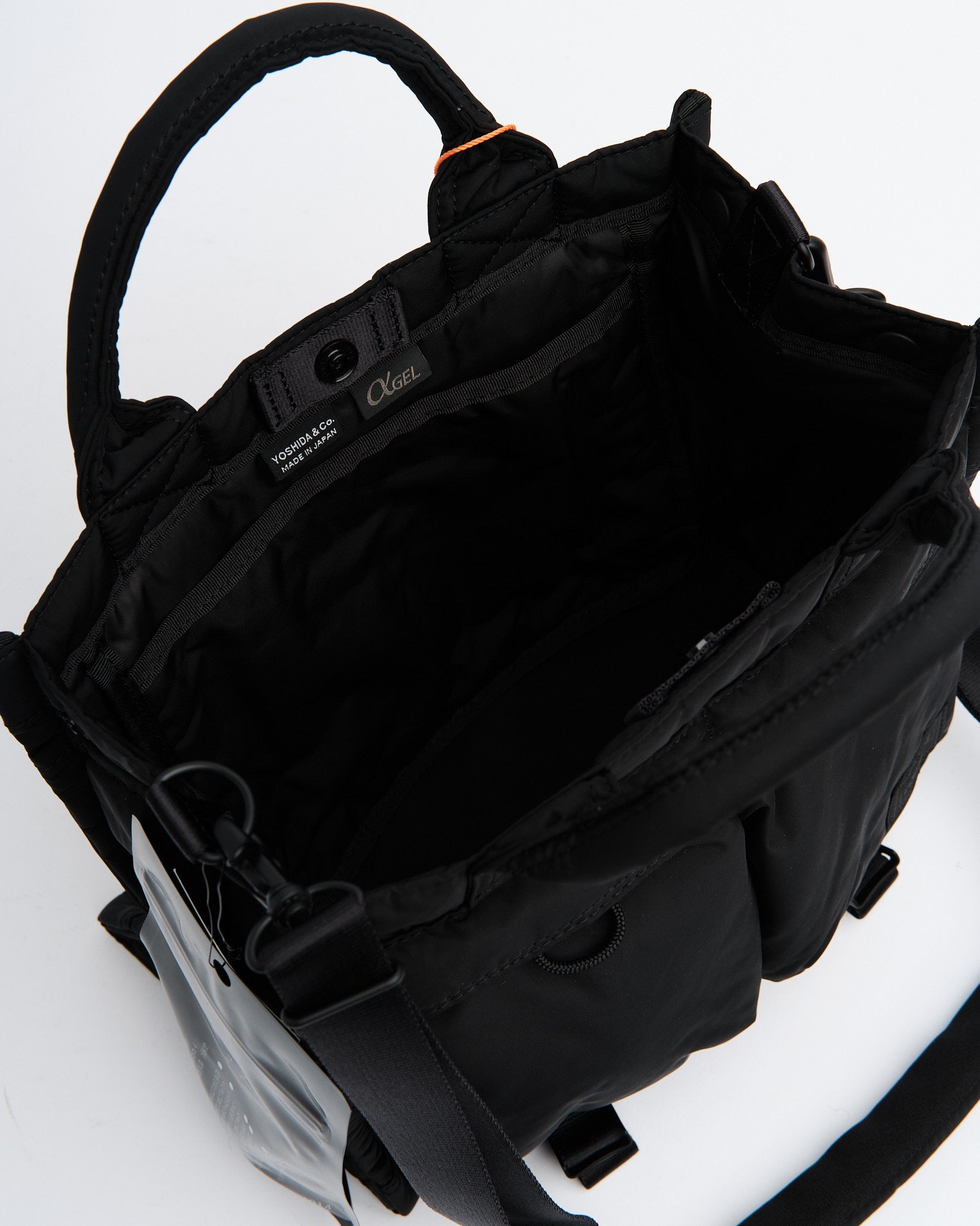 Tasken har αGEL, et multifunktionelt materiale brugt i håndtaget, selen og skulderpuderne. Dette bløde, gel-lignende materiale spreder trykket udøvet af vægten, reducerer træthed og stress, og sikrer komfort ved bæring. Desuden inkluderer tasken poser infunderet med over 10 naturligt afledte dufte, primært sandeltræ, skabt af Kyotos langvarige Koroho Shoeido, der tilbyder en beroligende og helende oplevelse ved hver rystelse.