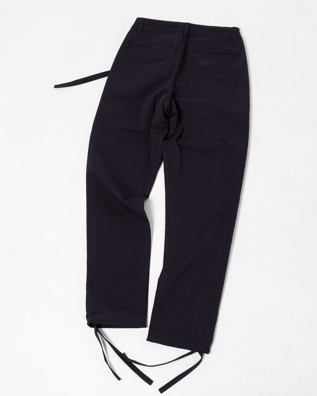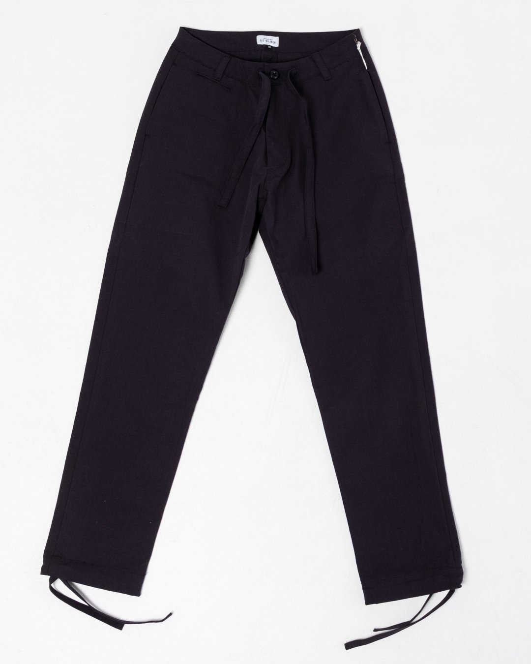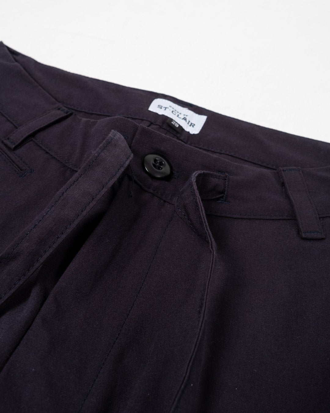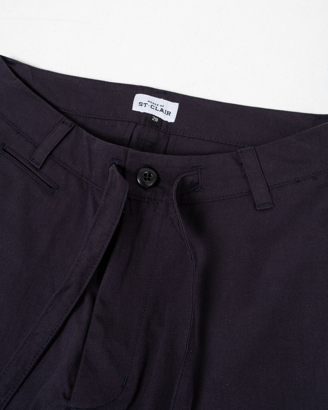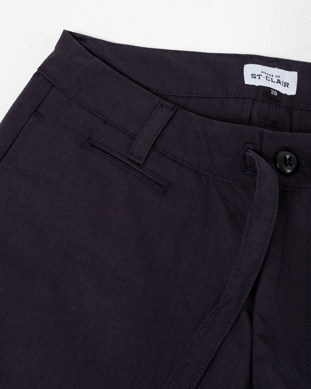 Drawstring Pant Navy Ripstop fra House of St. Clair. Afslappede bukser med snoretræk ved taljen og anklerne. Skåret fra et blødt, men holdbart japansk bomuld/nylon ripstop. Dobbelte paspolerede baglommer og møntlomme, forlommer med skråt snit og lynlås. Fremstillet i USA.