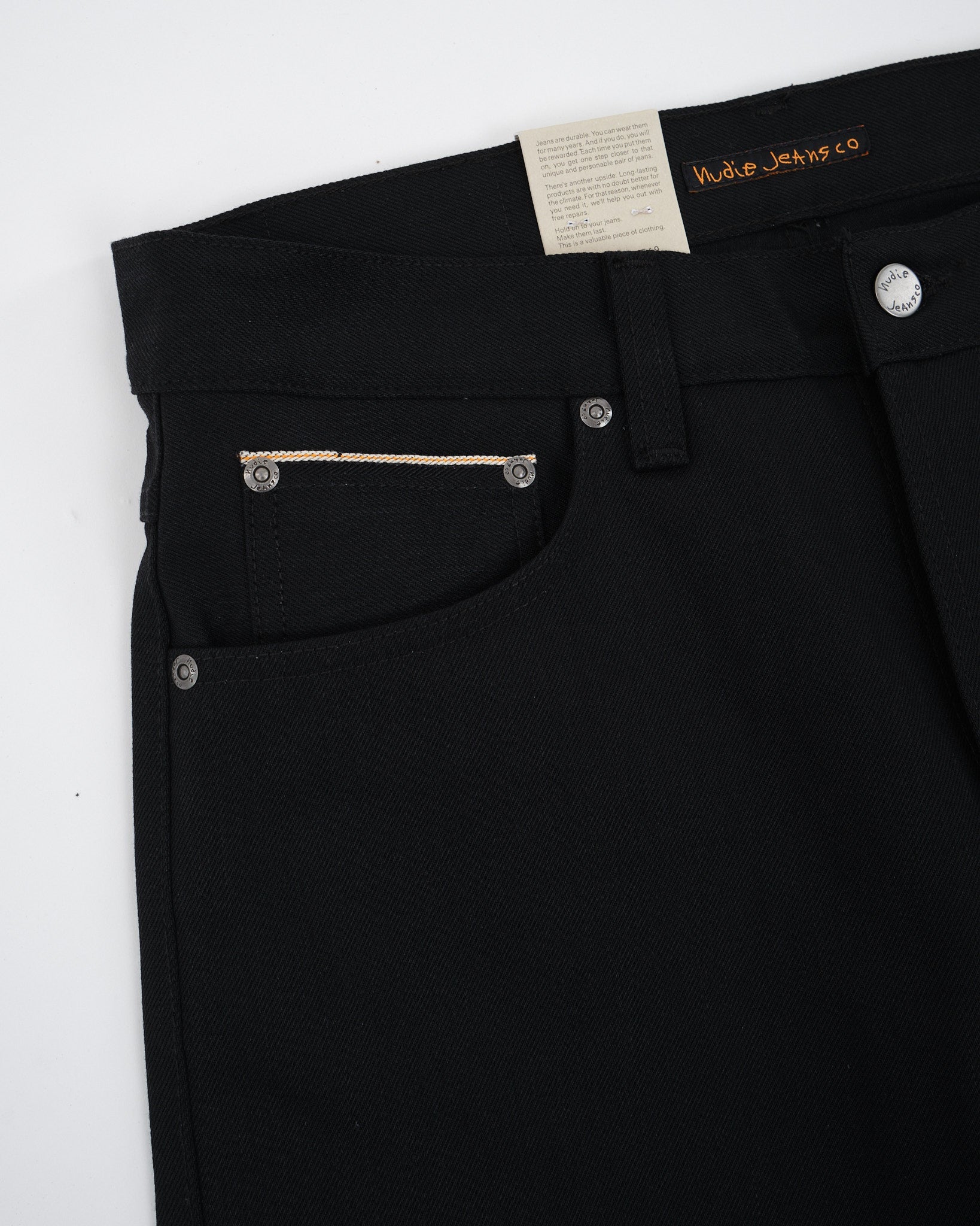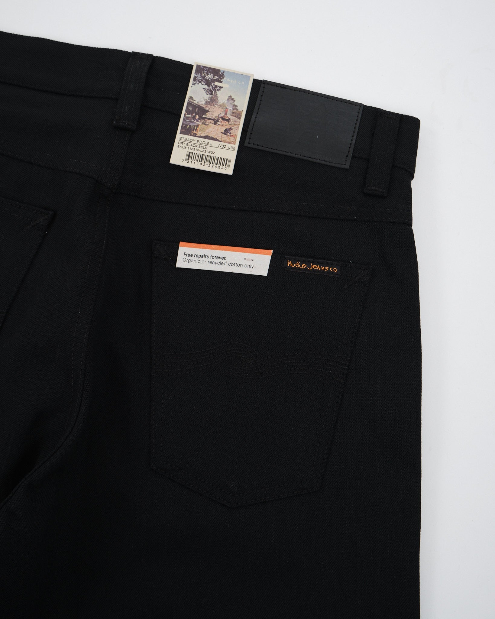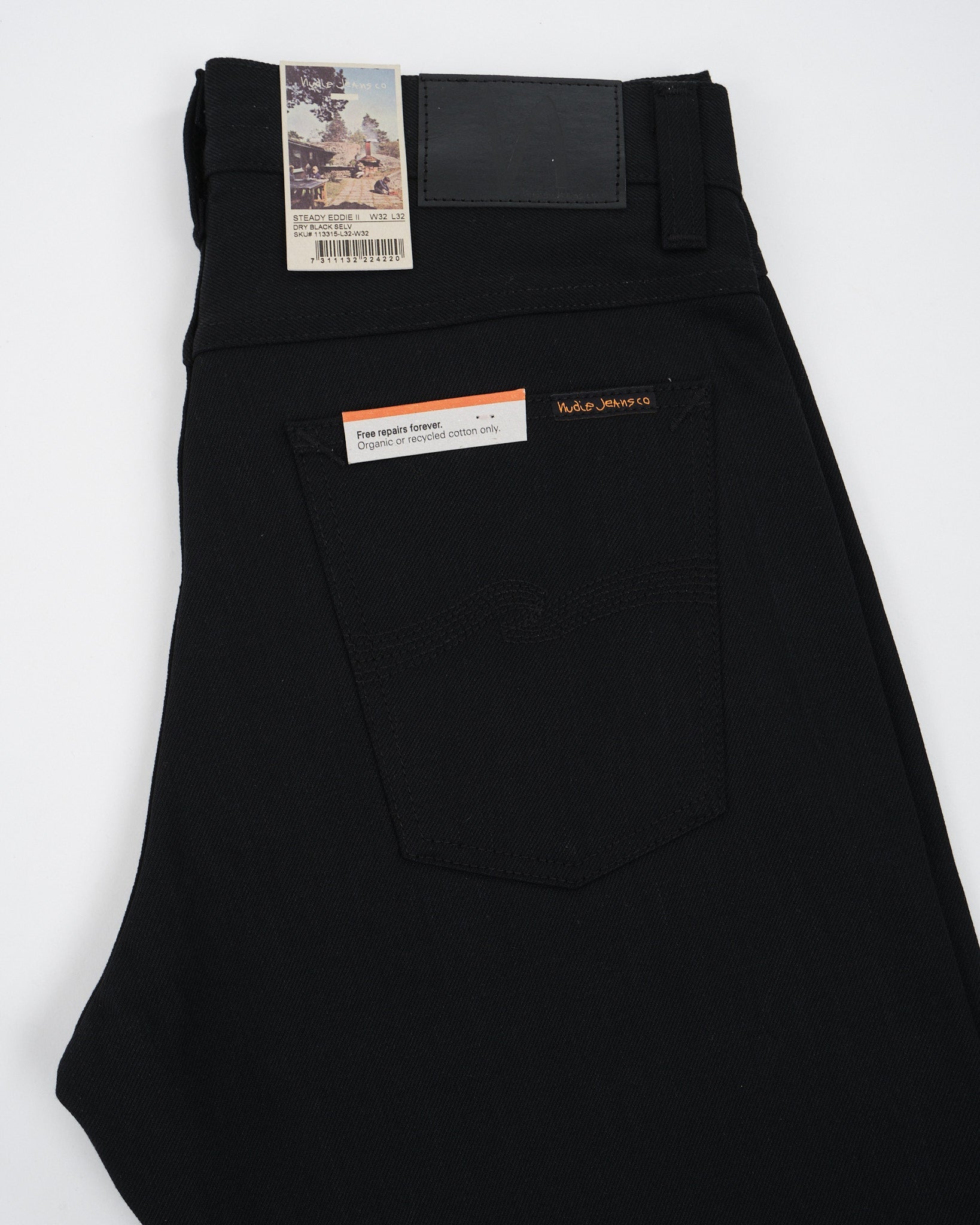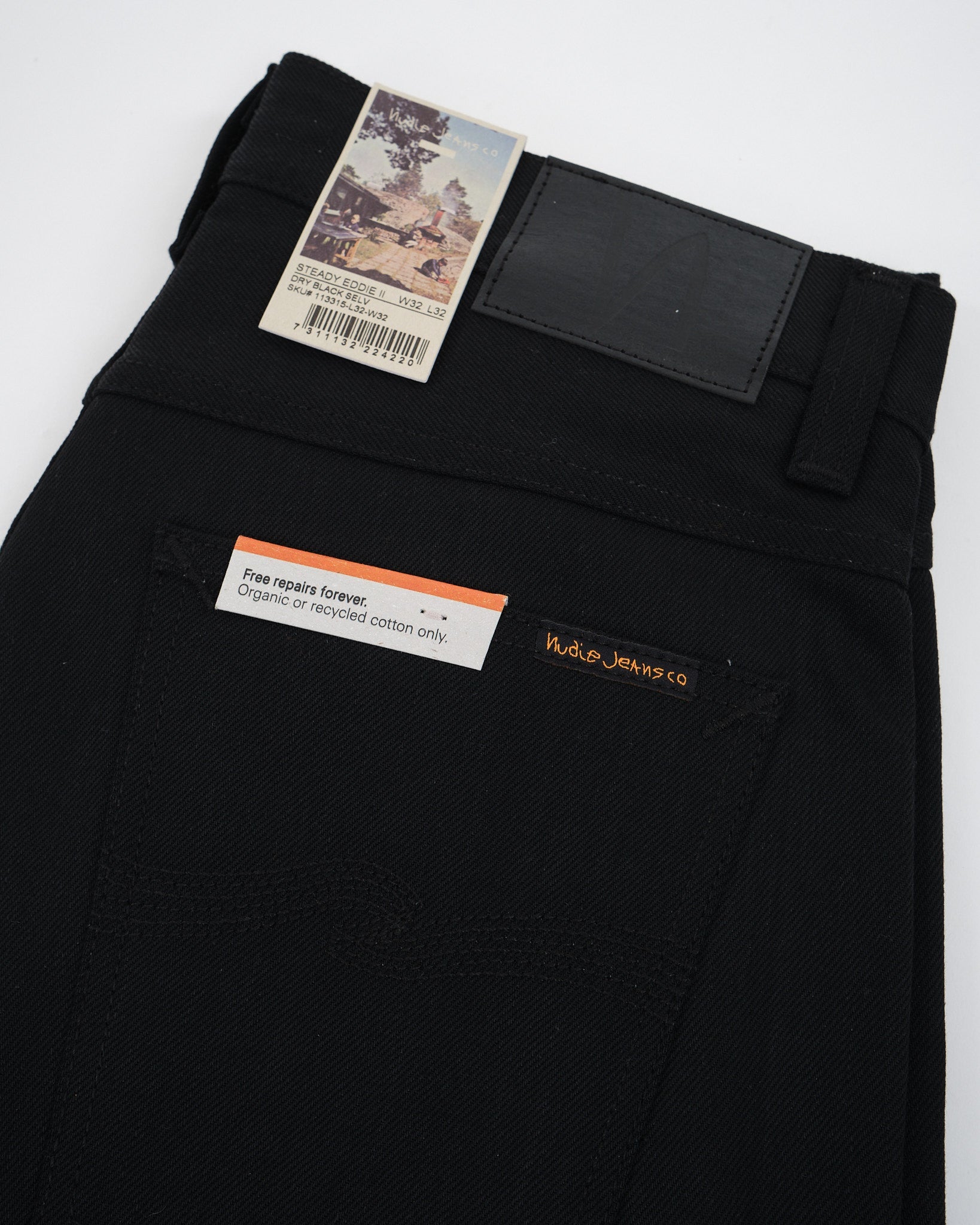 Udforsk nuancerne af ekspert håndværk med Nudie Jeans' Steady Eddie II Dry Black Selvage. Fremstillet i 14,5 oz japansk tør stiv selvage denim fra de prestigefyldte Kurabo Mills, bringer disse jeans noget ekstraordinært til din garderobe. Den garnfarvede sorte skærp er designet til naturligt at falme over tid, mens 'stay black' skudtråden bevarer sin dybe farve, hvilket lover høj-kontrast falming unik for dette stof. Dette par er perfekt for dem, der søger komfort og et stykke, der ældes med ynde, takket være dets regulære pasform, middel talje og slanke benåbning.