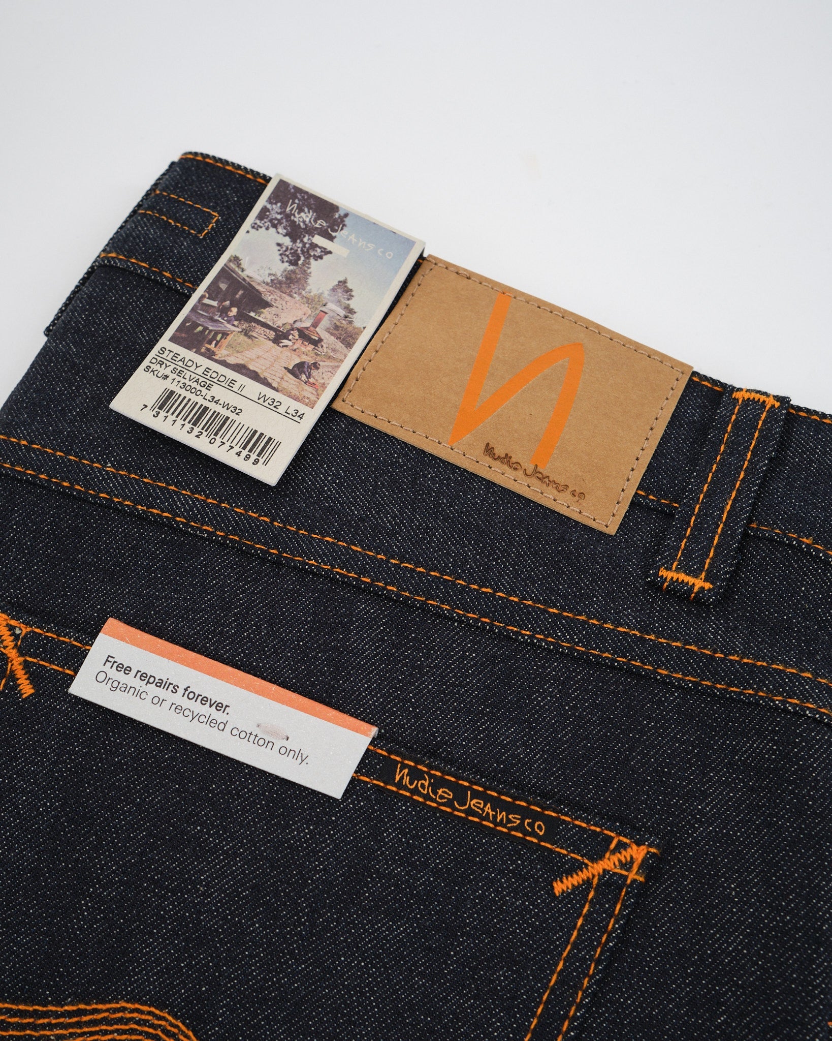Præsenterer NUDIE JEANS Steady Eddie II Dry Selvage, hvor arv møder uovertruffen kvalitet. Fremstillet af Kaihara selvage denim kendt for dets fantastiske ældningsegenskaber, er disse jeans en hyldest til Nudies oprindelse. Helt lavet af økologisk bomuld, kommer disse 13,75 oz tørre stive selvage jeans med orange syninger, antikke sølvtrimminger og et Jacron mærke. Med en regulær pasform, middel talje og konisk ben, tilbyder de en perfekt blanding af komfort og holdbarhed. Gør dem til dit næste go-to par!