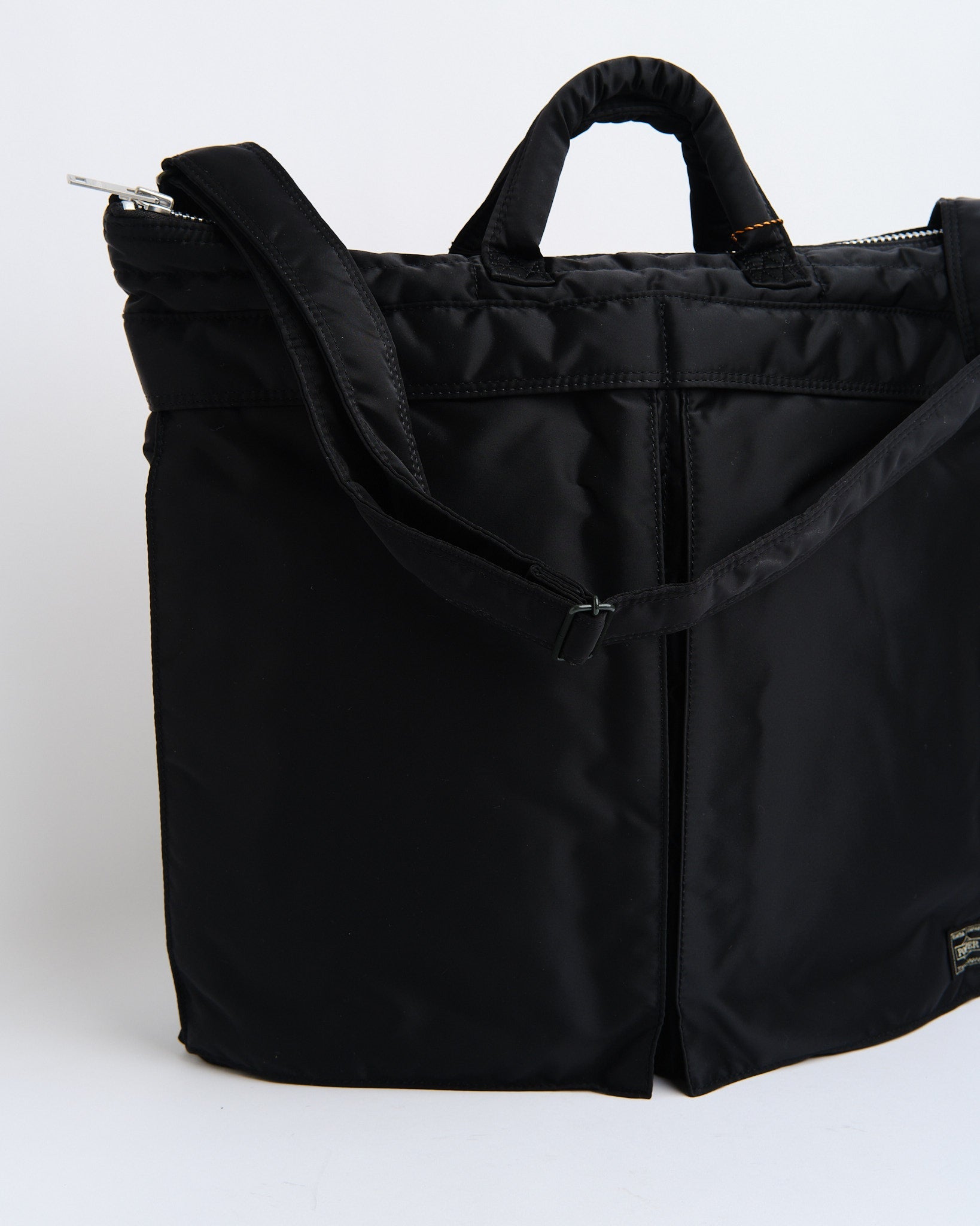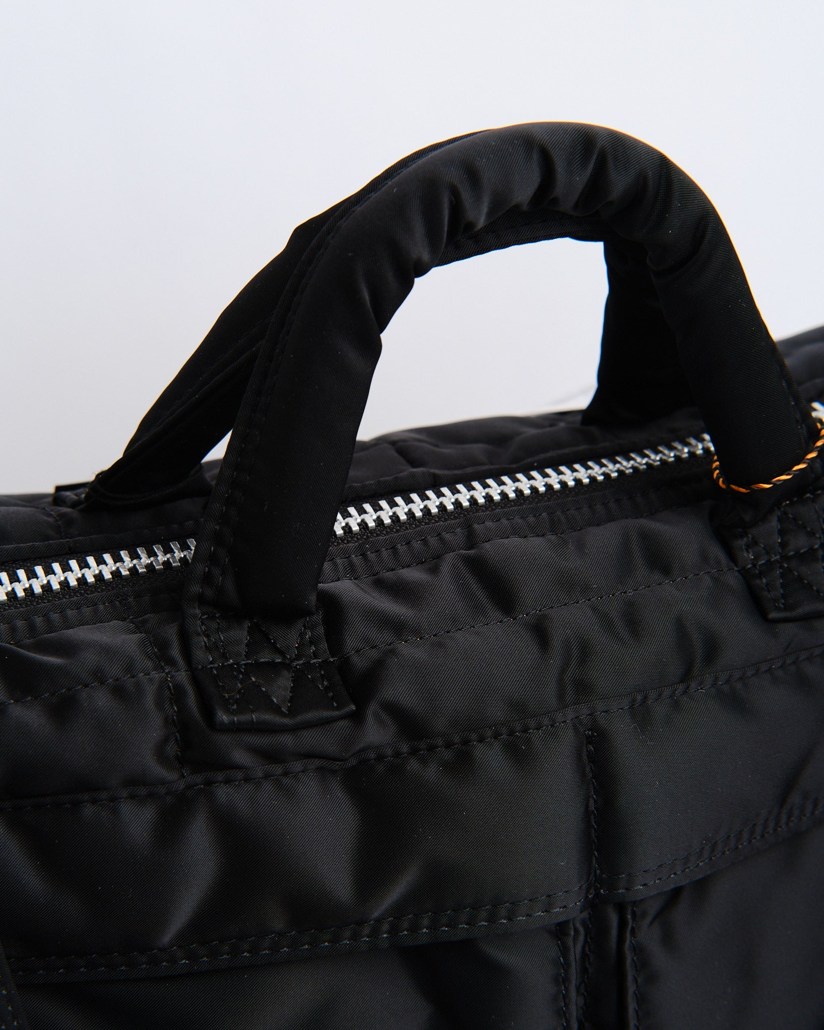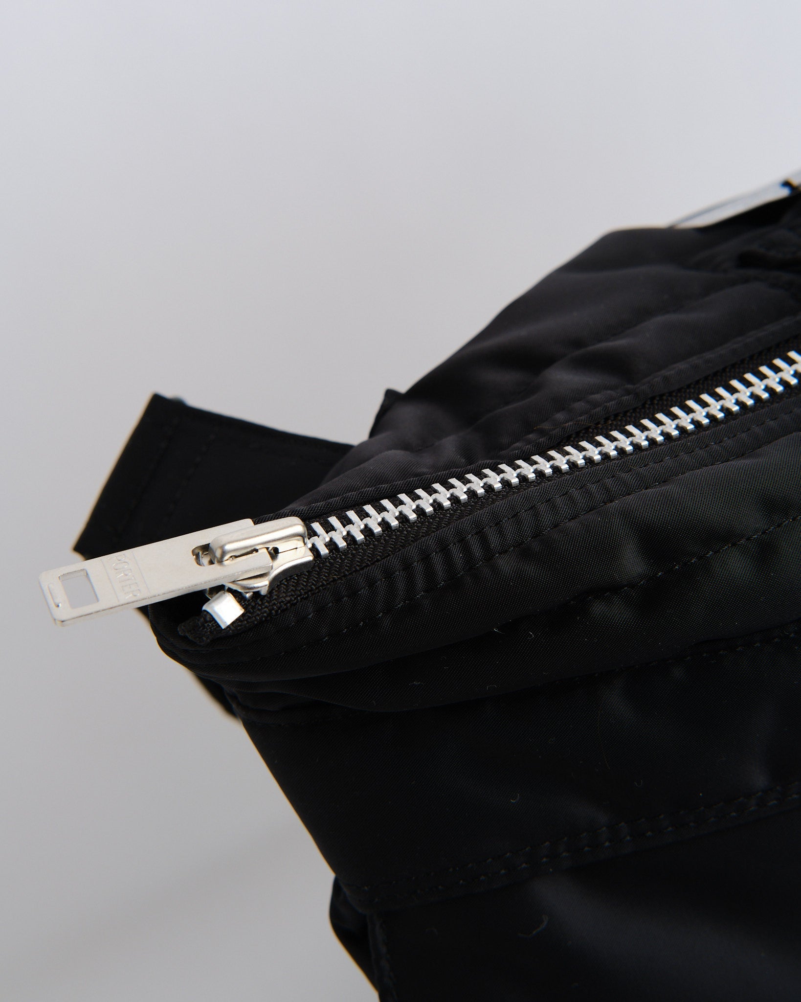 Introduktion af PORTER BY YOSHIDA TANKER 2 WAY HELMET BAG i SORT. Dette ikoniske stykke stammer fra den ansete "TANKER" serie, inspireret af US Air Force's MA-1 flyjakker. Fremstillet i Japan, har tasken en unik trelags stofblanding af nylon twill, polyester bomuld og nylon taffeta, hvilket gør den utroligt let men robust. Interiøret popper med en lys redningsorange, der ekkoer materialets bløde berøring. Oplev det detaljerede håndværk i hver syning og snit.