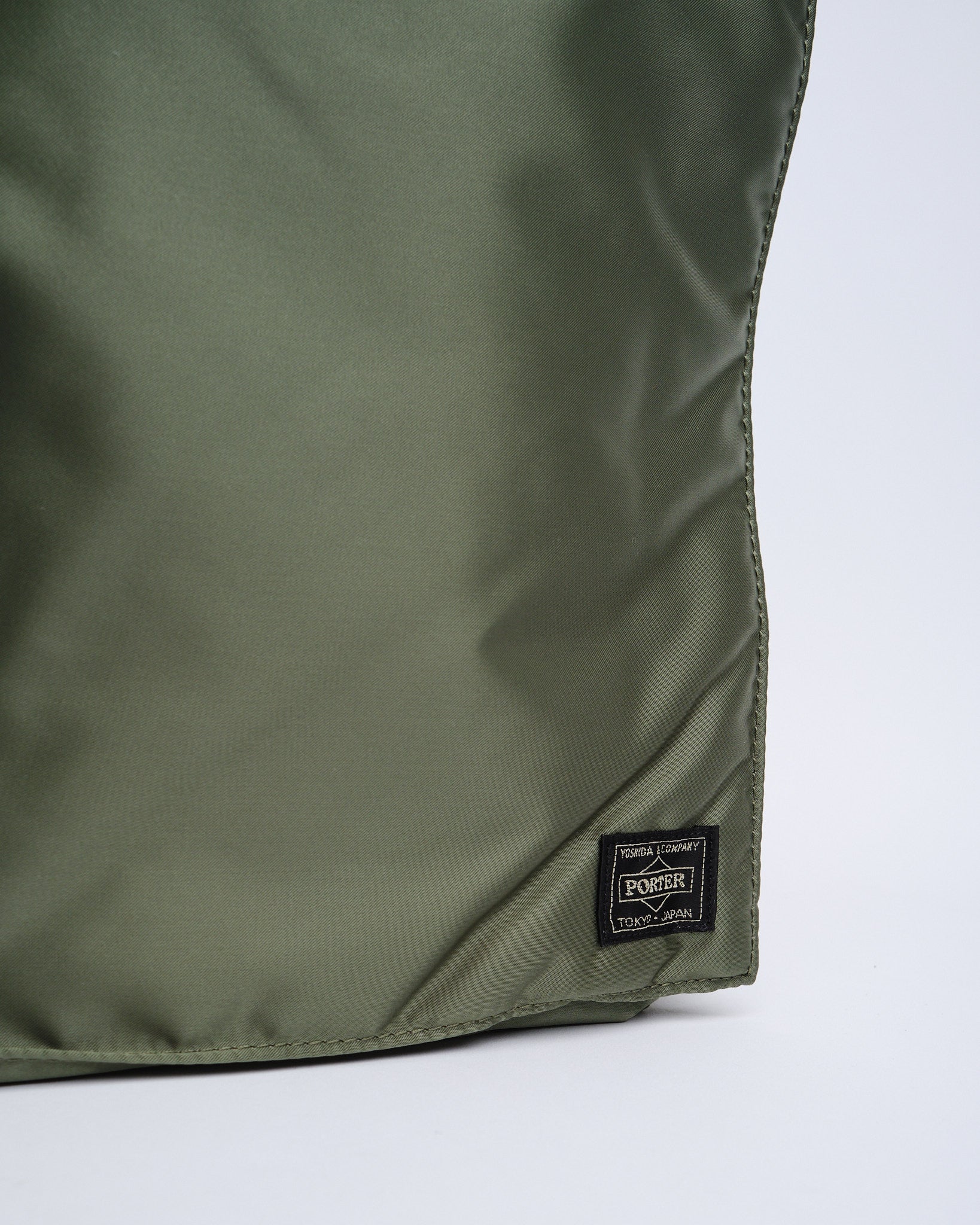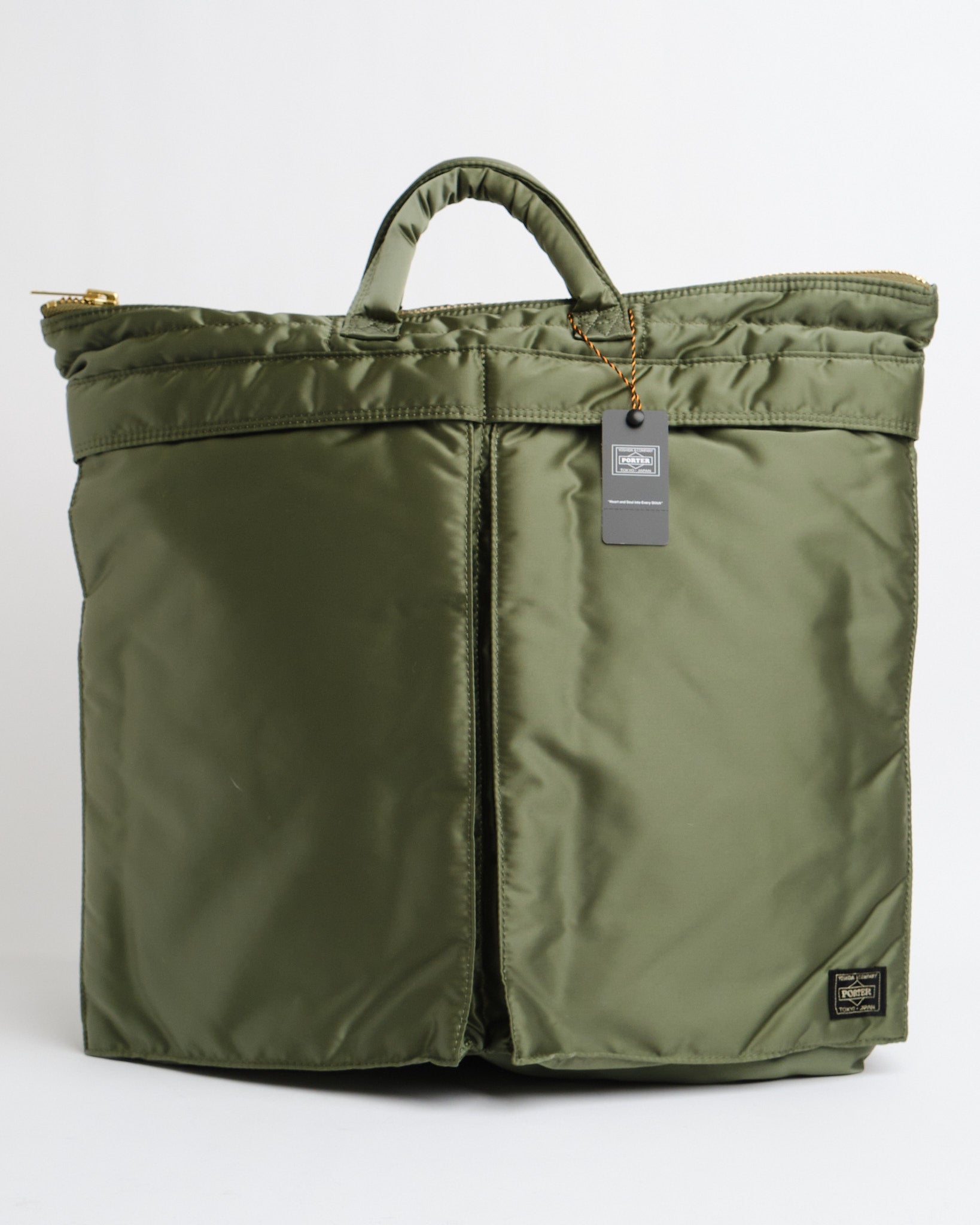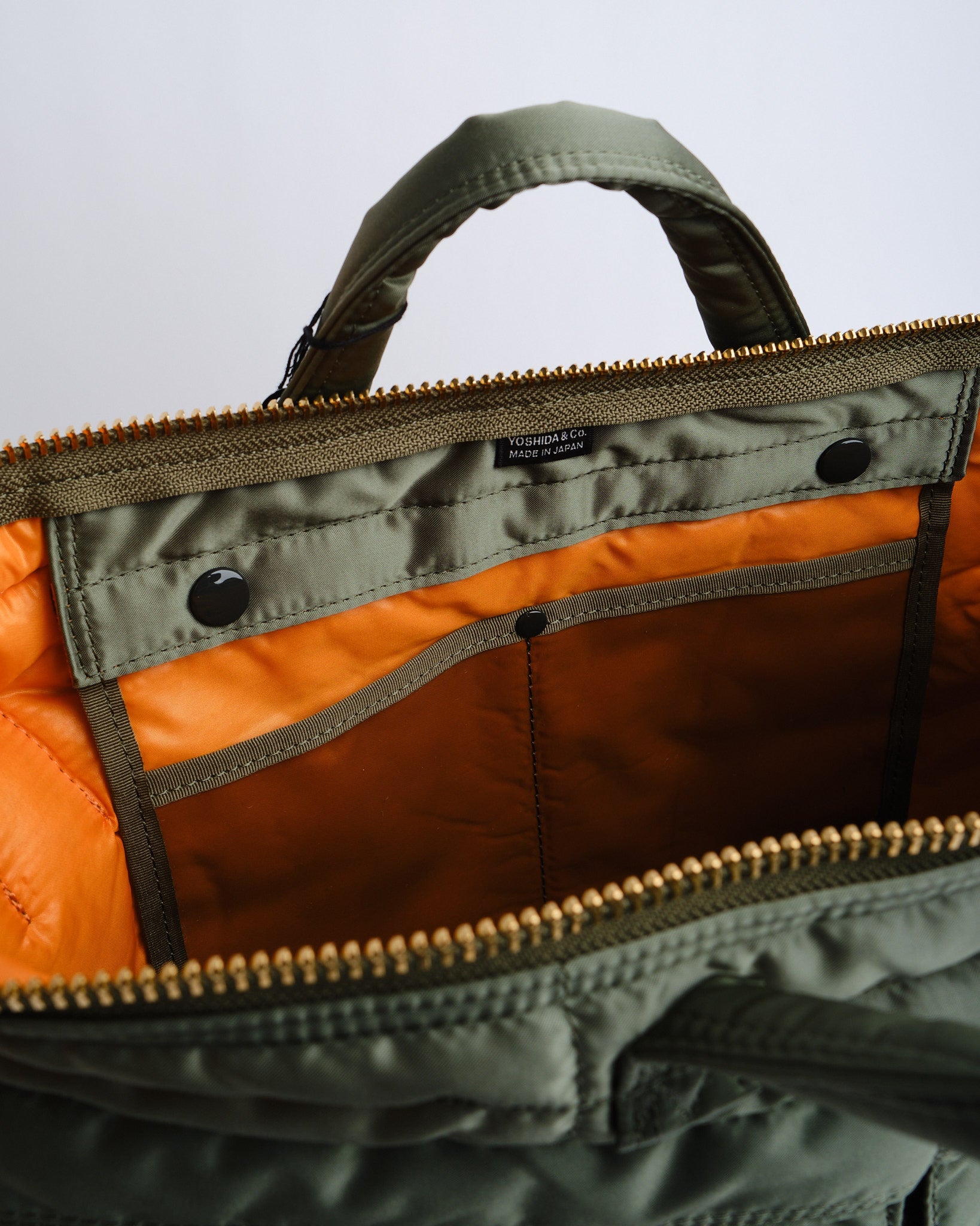 Introduktion af PORTER BY YOSHIDA TANKER 2 WAY HELMET BAG i SALVGRØN. Dette ikoniske stykke stammer fra den ansete "TANKER" serie, inspireret af US Air Force's MA-1 flyjakker. Fremstillet i Japan, tasken har en unik trelags stofblanding af nylon twill, polyester bomuld og nylon taft, hvilket gør den utroligt let, men robust. Interiøret popper med en klar redningsorange, der ekkoer materialets bløde berøring. Oplev den detaljerede håndværksmæssige kvalitet i hvert sting og snit.