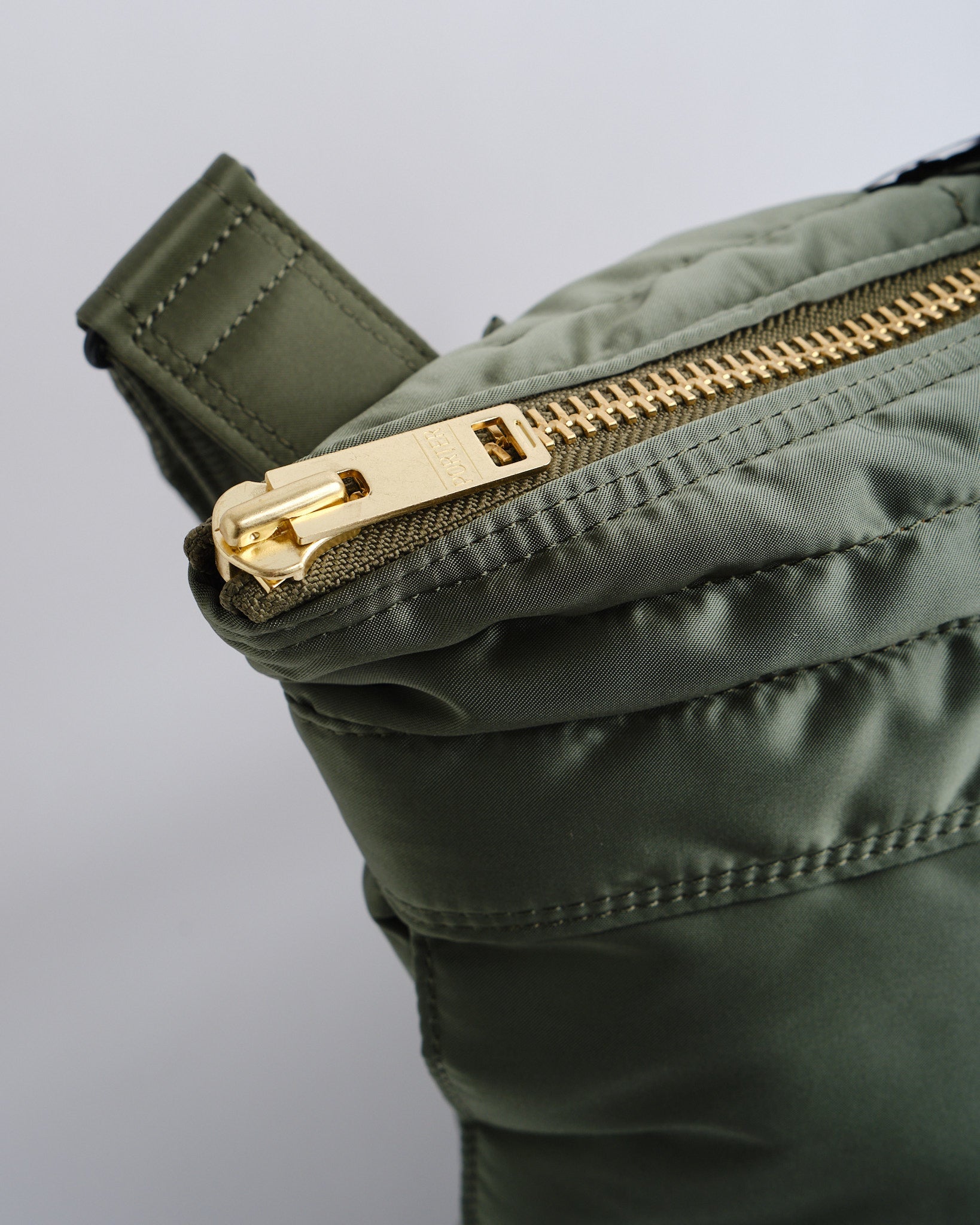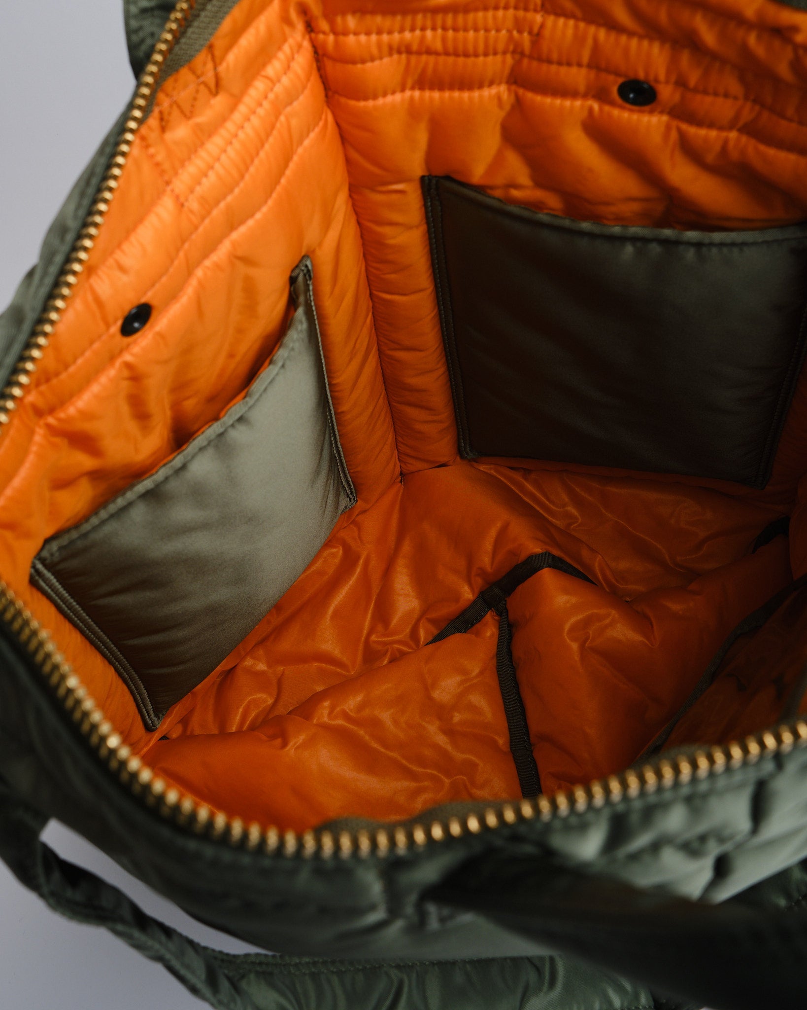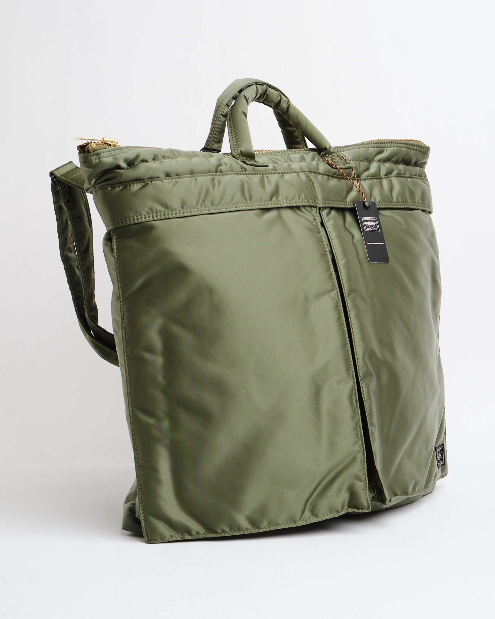 Introduktion af PORTER BY YOSHIDA TANKER 2 WAY HELMET BAG i SALVGRØN. Dette ikoniske stykke stammer fra den ansete "TANKER" serie, inspireret af US Air Force's MA-1 flyjakker. Fremstillet i Japan, tasken har en unik trelags stofblanding af nylon twill, polyester bomuld og nylon taft, hvilket gør den utroligt let, men robust. Interiøret popper med en klar redningsorange, der ekkoer materialets bløde berøring. Oplev den detaljerede håndværksmæssige kvalitet i hvert sting og snit.