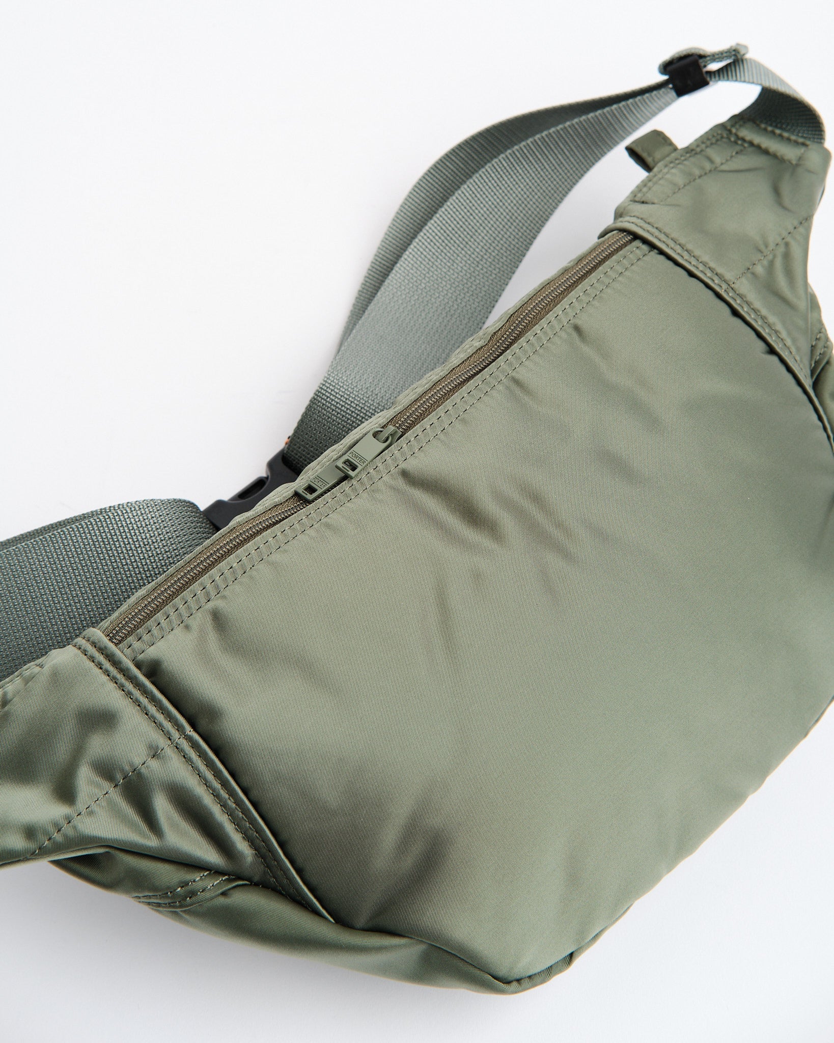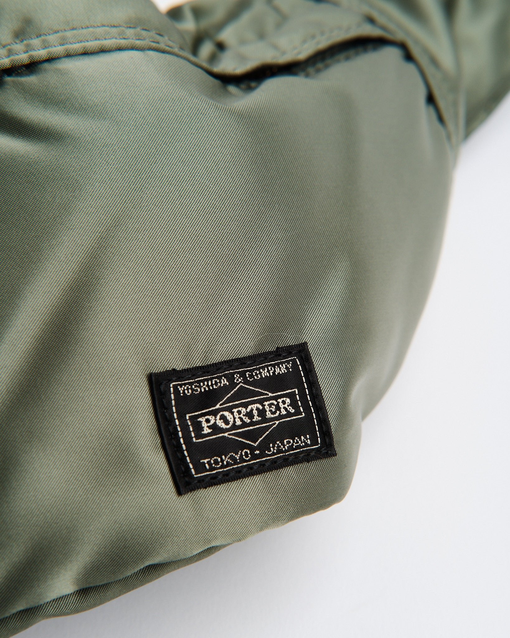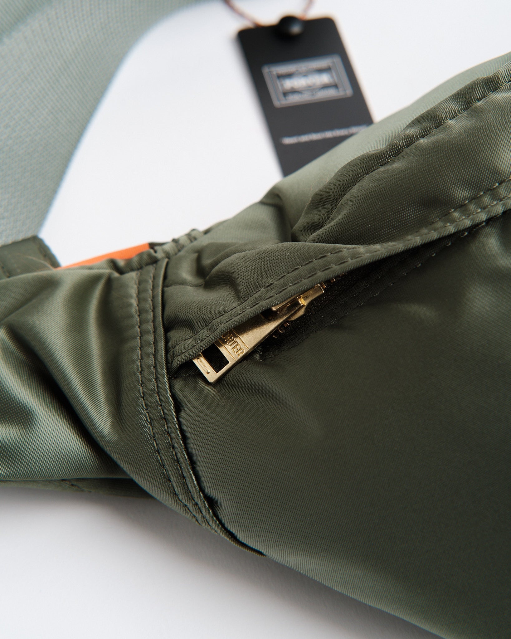 Introduktion af PORTER YOSHIDA 622-76629-30 TANKER WAIST BAG (S) i SAGE GREEN. En del af Tanker-serien, der først blev introduceret i 1983, anvender denne bæltetaske et unikt stof, der oprindeligt blev skabt til US Air Forces flyjakke MA 1, som inkluderer en livlig redningsorange indvendig foring. På trods af dens størrelse passer den bekvemt på kroppen og kan bæres som både en bæltetaske og en skuldertaske. Ideel til at bære nødvendigheder, som smartphones og tegnebøger, den kommer med tre lommer, to indvendige lommer, en bæltelomme og en baglomme med lynlås. Det lagdelte stof lavet af nylon twill polyester bomuld og nylon taffeta er letvægts, men holdbart og viser Yoshida&Co.s opmærksomhed på detaljer i håndværket ved hver vending.