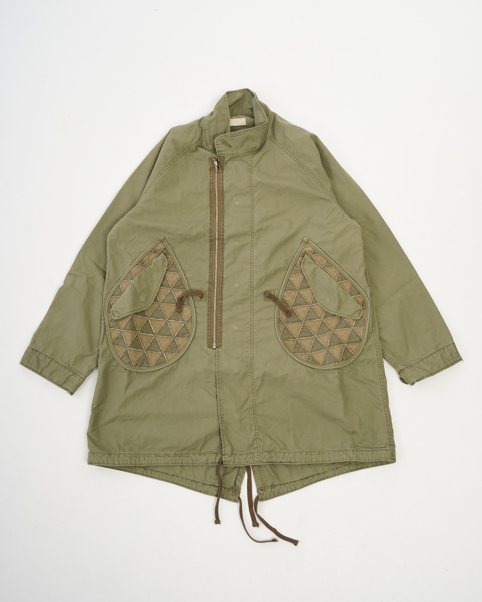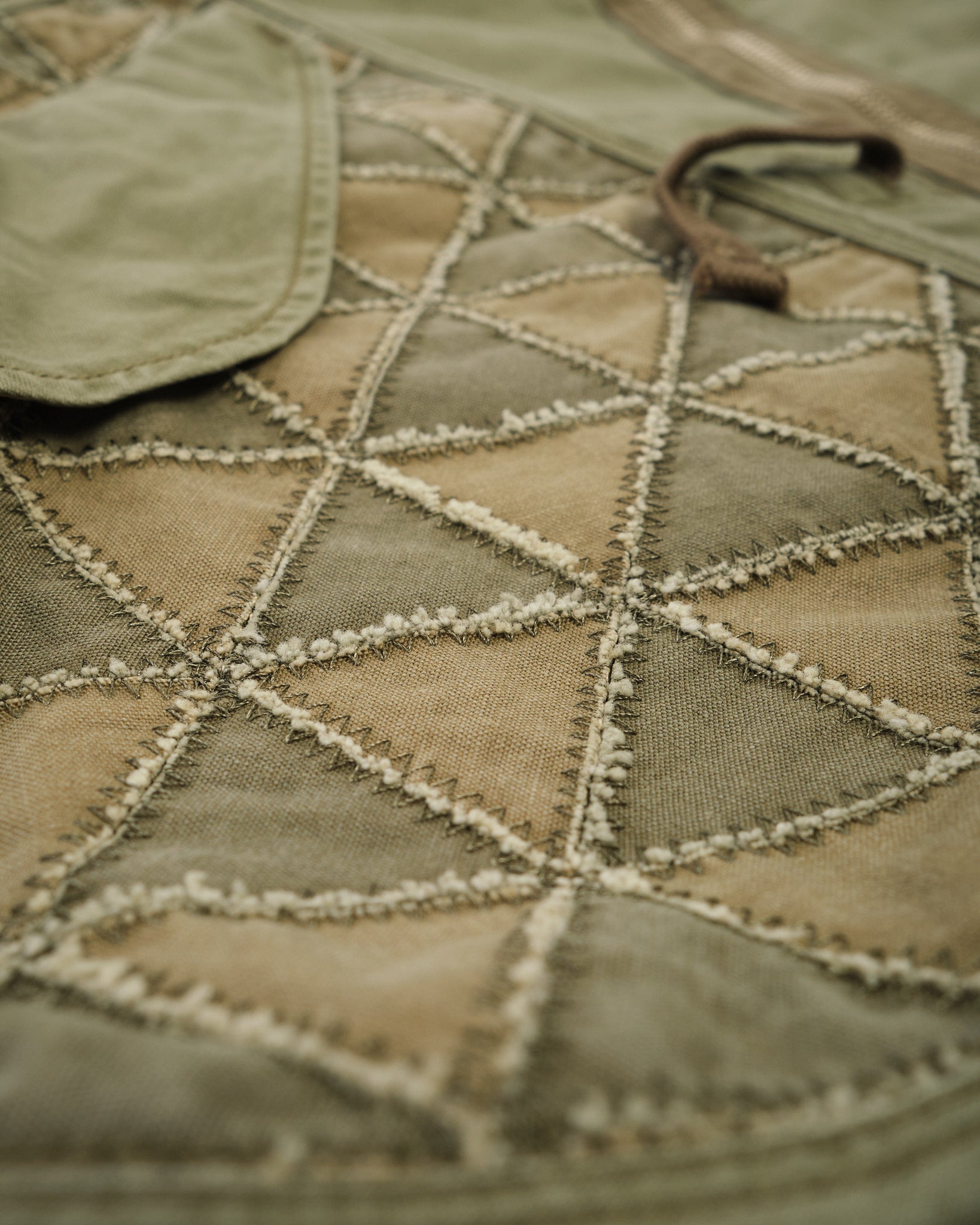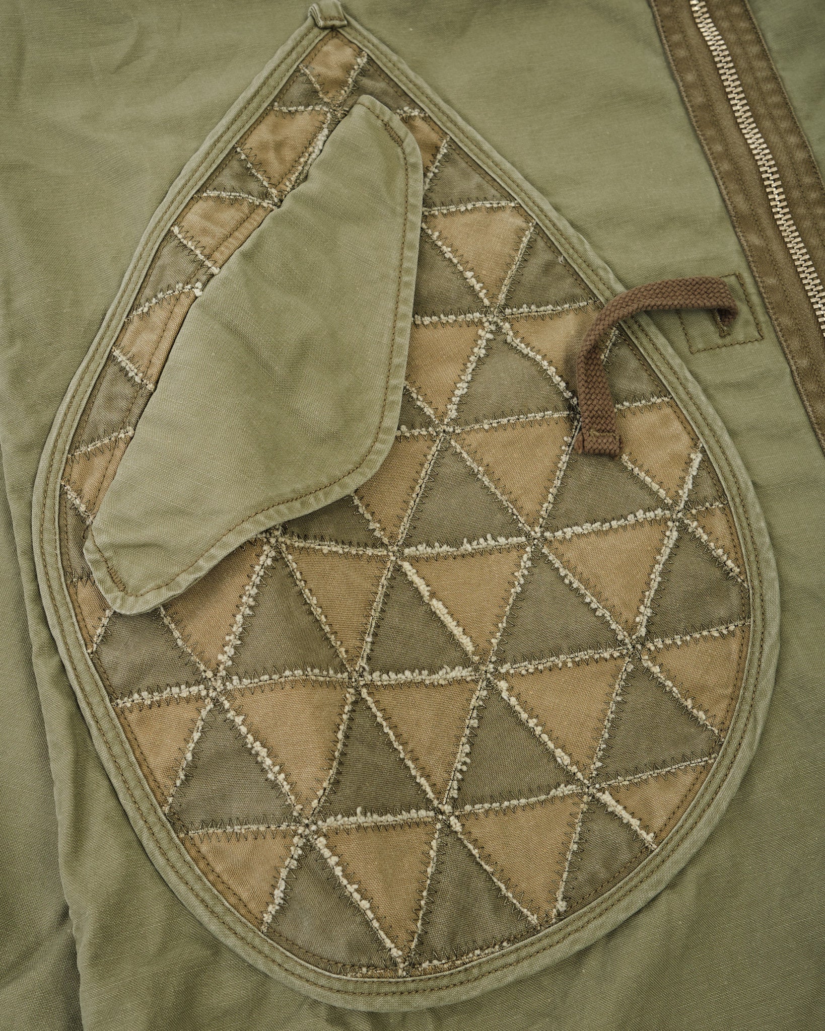 Designet med en fiskehale kant, tager dette stykke inspiration fra vintage militære parkaer, mens det inkorporerer tsugihagi (lappearbejde) detaljer, hvilket giver det en enestående tekstur og dybde. Den olivenfarve forstærker dets robuste æstetik, hvilket gør det til et perfekt lagdelingsstykke for overgangssæsoner. Lavet i Japan, beliggør det præcision håndværk med et unikt, arv-inspireret look.
