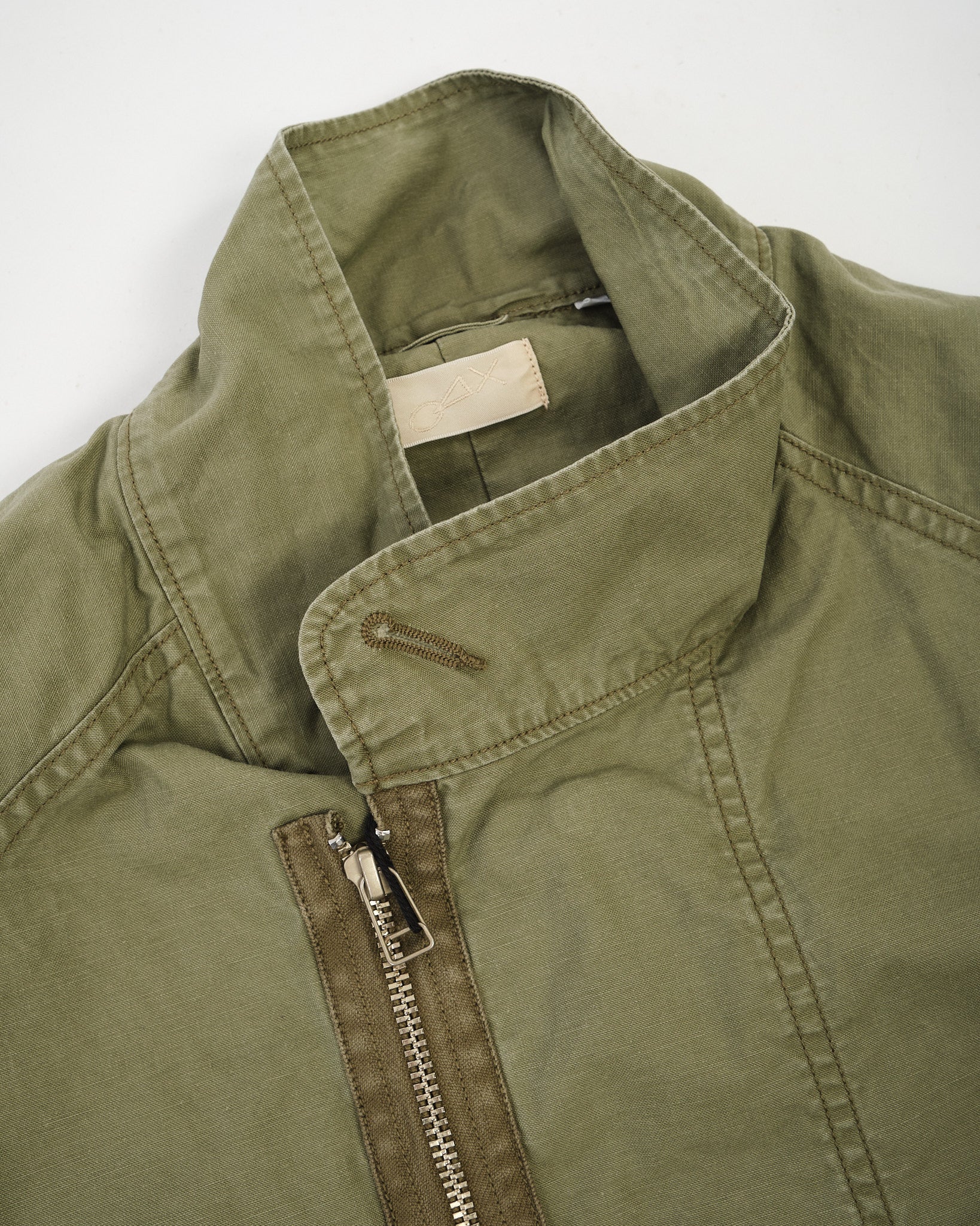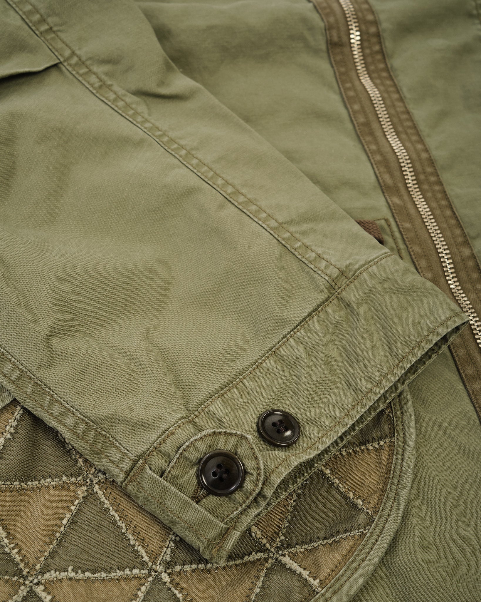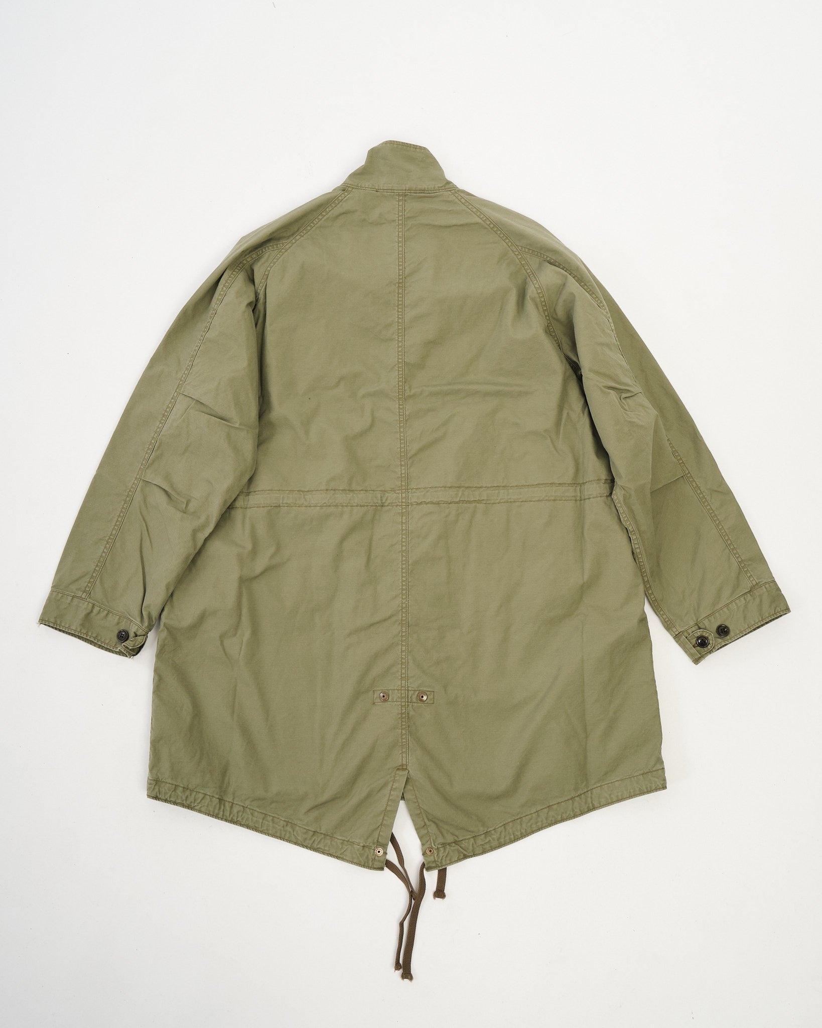 Designet med en fiskehale kant, tager dette stykke inspiration fra vintage militære parkaer, mens det inkorporerer tsugihagi (lappearbejde) detaljer, hvilket giver det en enestående tekstur og dybde. Den olivenfarve forstærker dets robuste æstetik, hvilket gør det til et perfekt lagdelingsstykke for overgangssæsoner. Lavet i Japan, beliggør det præcision håndværk med et unikt, arv-inspireret look.
