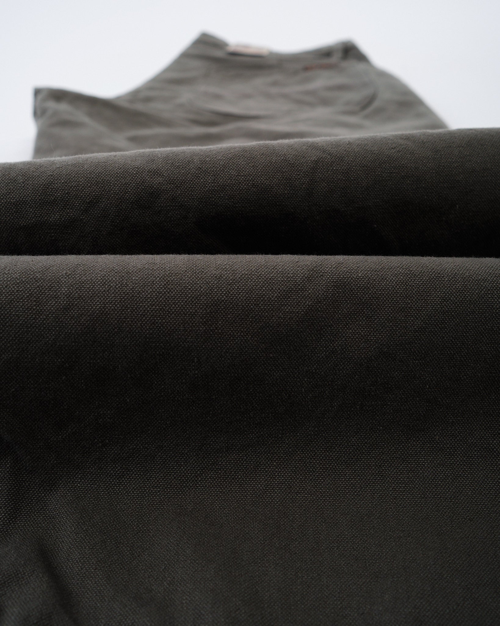 Fremstillet af Duck Canvas, et blegt granngrønt 2-lags canvasvæv, er dette stof en hyldest til arvshåndværk. Ved brug af uregelmæssige ring-spundne garner, der er tvundet til holdbare 2-lags tråde, er lærredet garnfarvet gennem en patenteret proces, hvilket sikrer en rig, udviklende patina. Den tæt vævede struktur skaber en fast, højt tekstureret overflade, der fejrer naturlige uregelmæssigheder samtidig med at tilbyde overlegen holdbarhed.