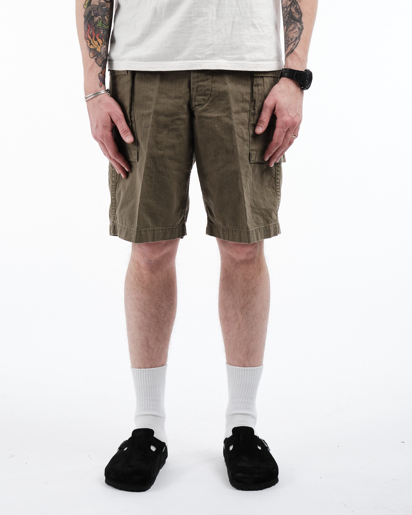De orSlow U.S. Army 2 Pocket Cargo Shorts i Army Green er en moderne genfortolkning af klassiske militærshorts, der kombinerer holdbarhed og tidløst design. Fremstillet i Japan af 100% bomuld i fiskebens-twill, er disse shorts designet til at modstå daglig brug samtidig med at de tilbyder komfort. Den afslappede pasform giver mulighed for nem bevægelse, hvilket gør dem velegnede til afslappede udflugter eller udendørs aktiviteter. To store cargolommer på siderne giver praktisk opbevaring til nødvendigheder. Som et spejl af orSlows dedikation til håndværk, leverer disse shorts kvalitet og alsidighed.