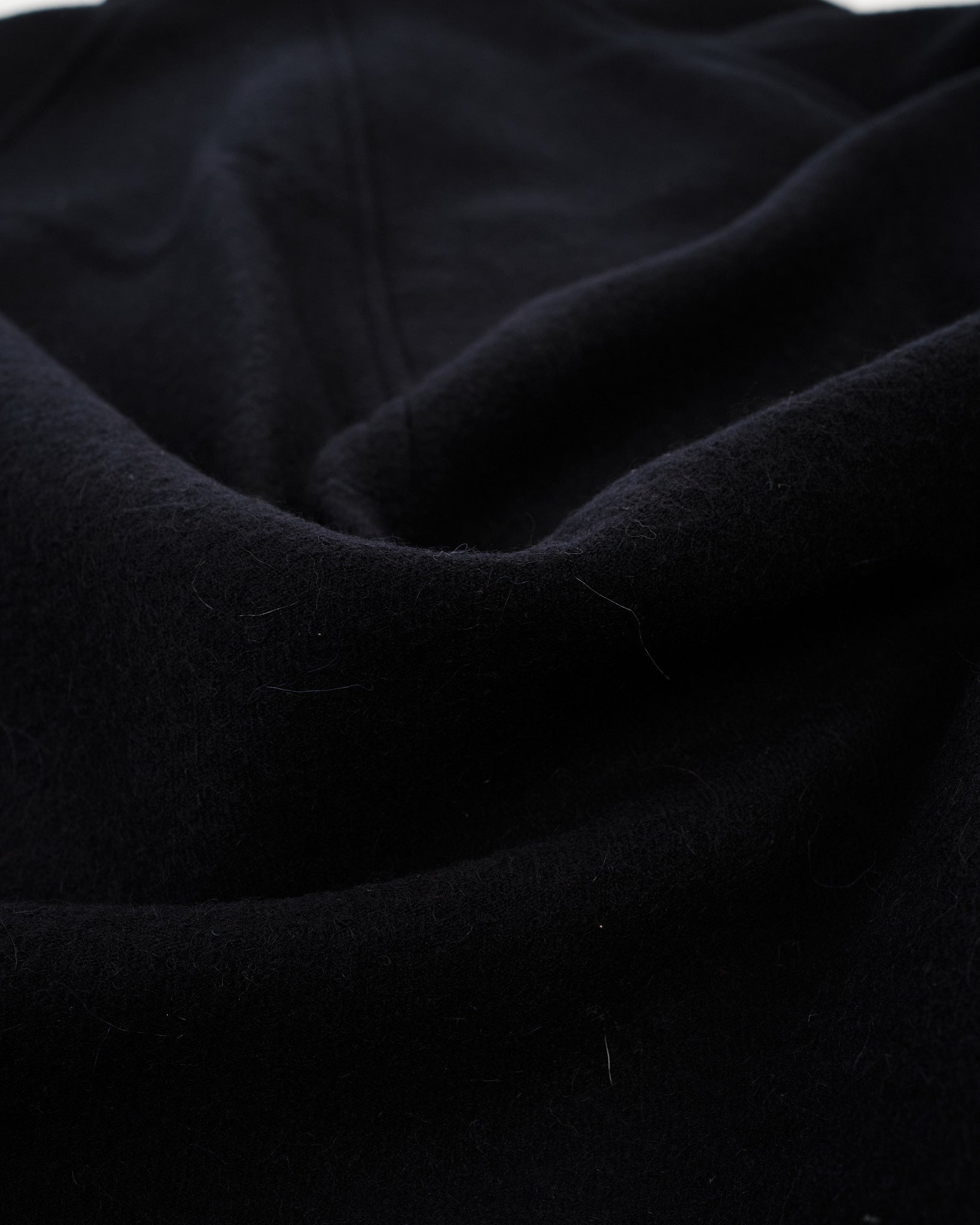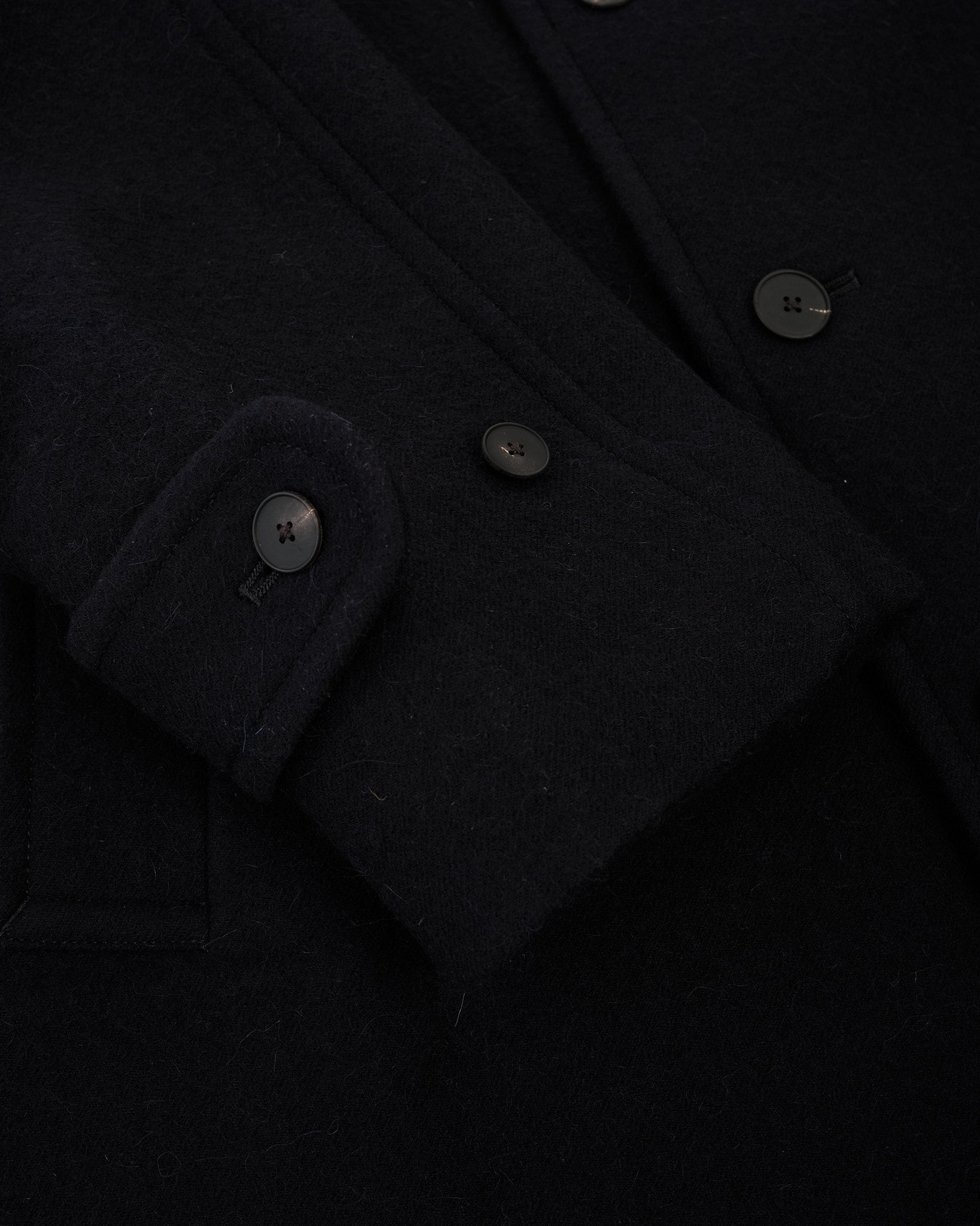 The KAPTAIN SUNSHINE Umbrella Coat (KS25FCO04) i Navy kombinerer luksus og varme sømløst. Fremstillet af et dobbelt klæde vævet langsomt med høj densitet, blander stoffet varm lama alpaka og Merino uld, hvilket giver en exceptionelt hyggelig og sofistikeret fornemmelse. Stoffet er omhyggeligt filtet for at skabe den perfekte balance mellem volumen og tekstur, hvilket resulterer i en frakke, der er både isolerende og elegant.