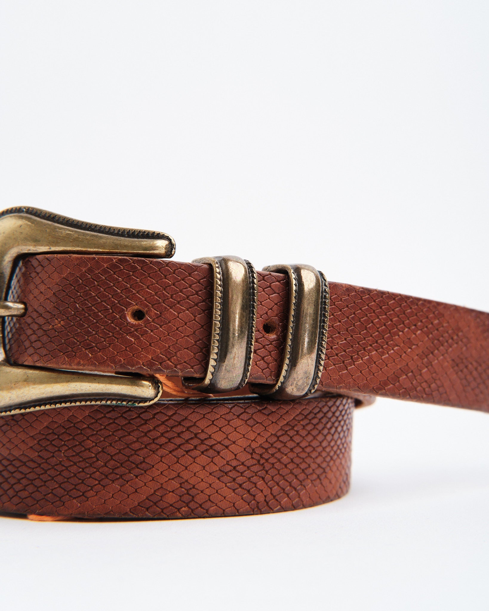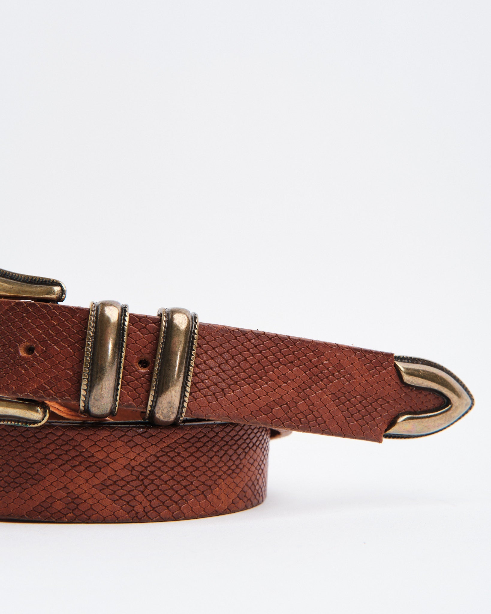 Western Faux Reptile Bælte Cognac fra Nudie Jeans Co. Bælte lavet af det fineste vegetabilsk garvede fuldkorns læder præget med et reptilskindsmønster. Metalspændet, spidsen og løkkerne er alle dekoreret rundt om deres kanter. 100% læder med en bredde på 24 mm. Størrelserne er i cm. Fremstillet i Polen.