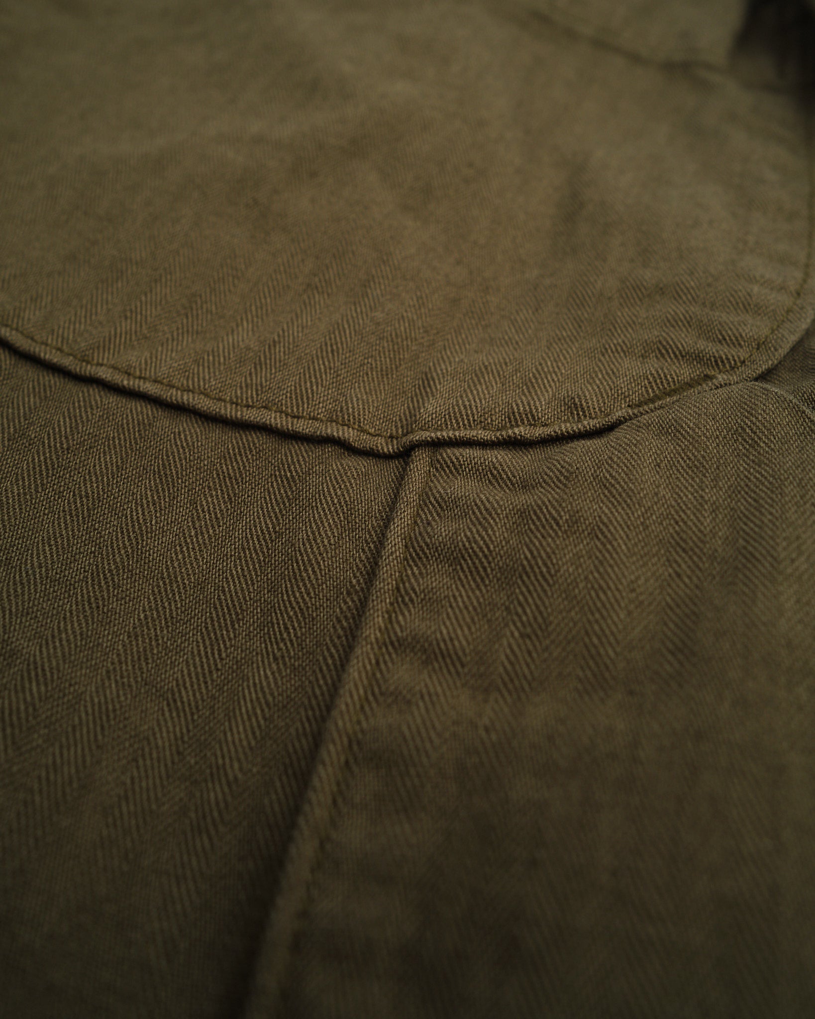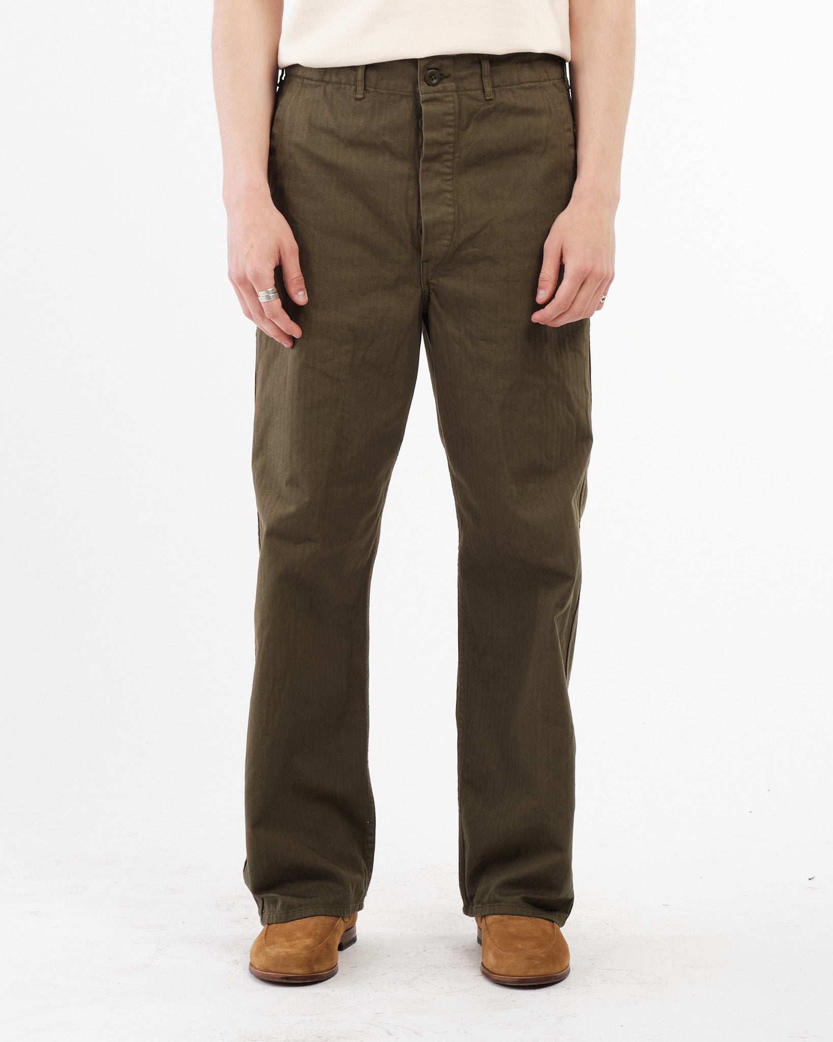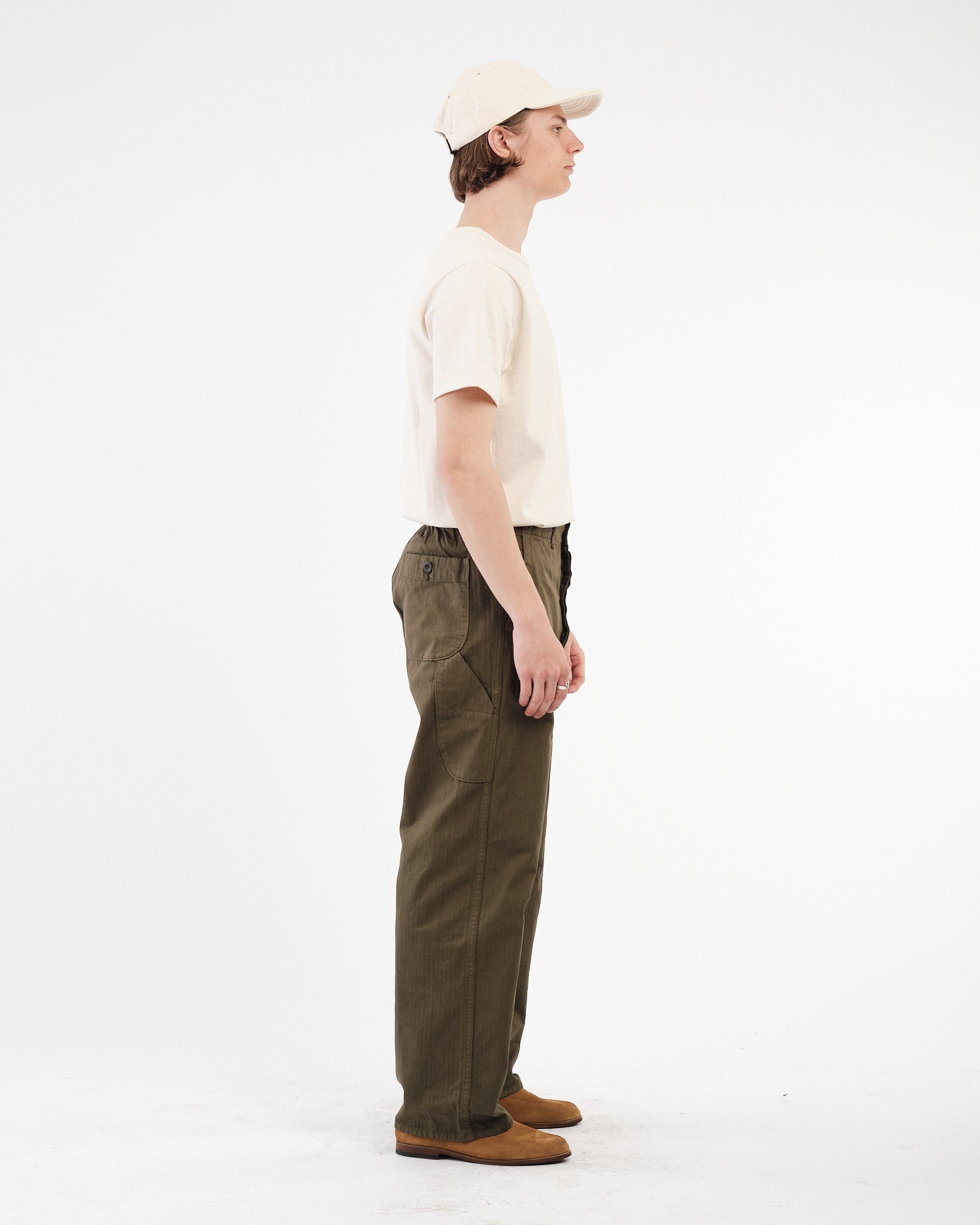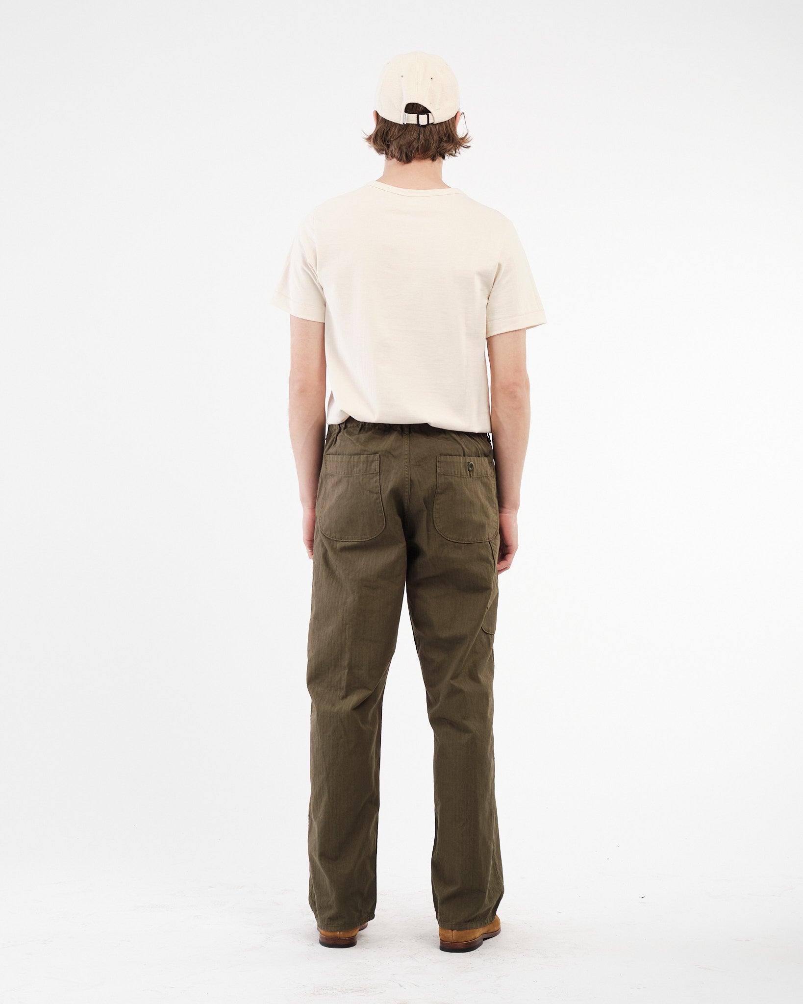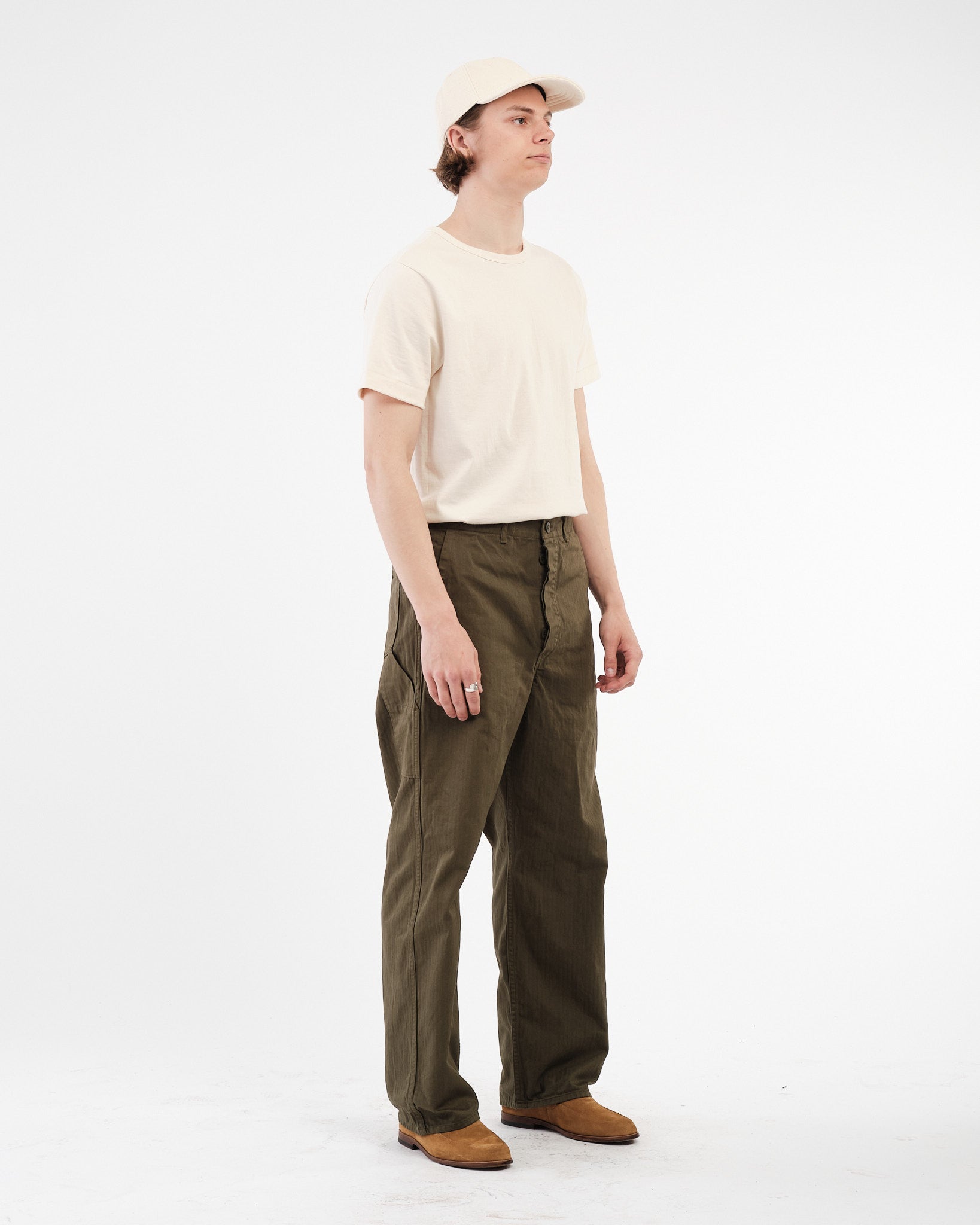 OrSlow Wide Fit French Work Pants i Army Green hylder fransk arbejdstøj med et afslappet vidt ben design, der kombinerer komfort og praktisk anvendelighed på en afbalanceret måde. Fremstillet i Japan af bomuldsmateriale med høj talje og en rummelig ben silhuet for forbedret mobilitet. Den alsidige armygrønne nuance tilføjer et strejf inspireret af militær stil, hvilket gør dem perfekte til både afslappet og let formelle indstillinger. Disse bukser er fremstillet med baglommer, der ikke kun er stilfulde, men også praktiske. Et vidnesbyrd om orSlows engagement i kvalitetshåndværk.