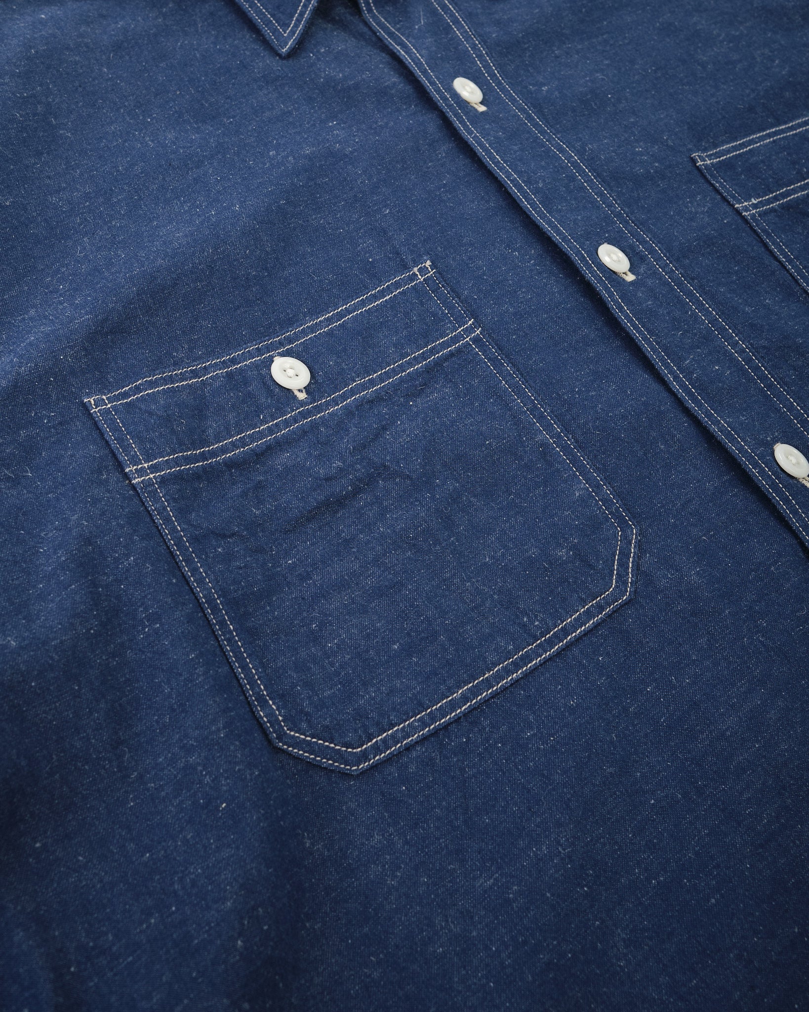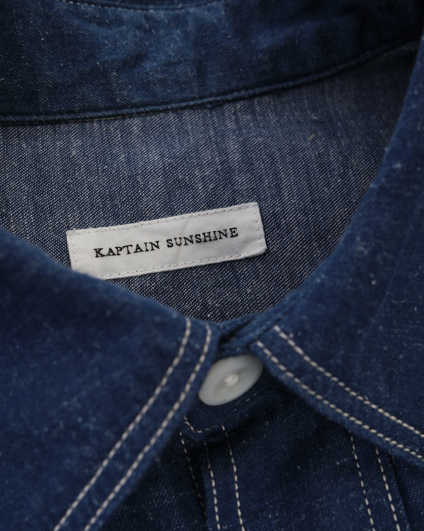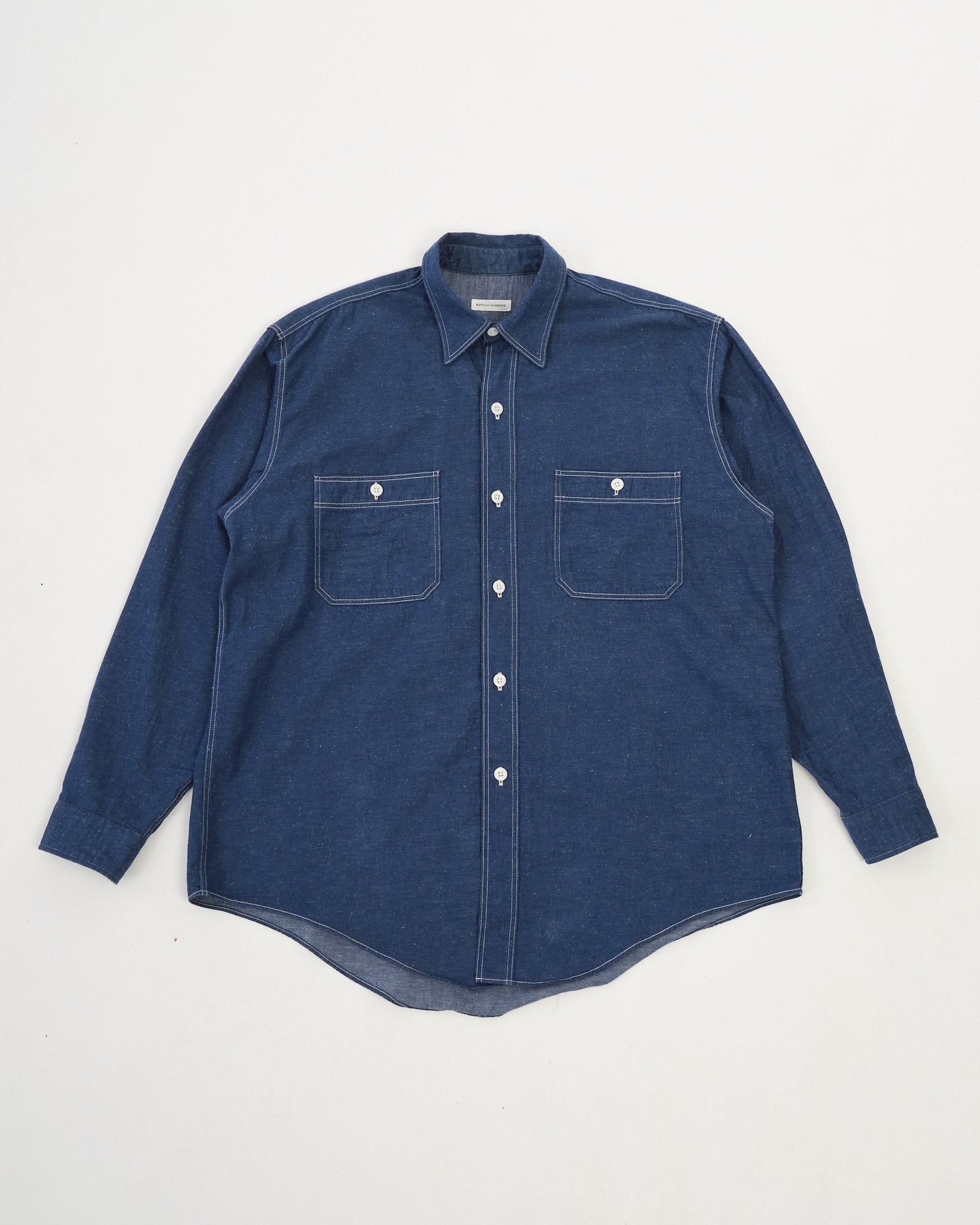 The KAPTAIN SUNSHINE Work Shirt (KSBSSH03) i Indigo Blå er et imponerende eksempel på arbejdstøj af høj kvalitet. Fremstillet med en blanding af ekstra-lang Suvin staple bomuld og hamp, er det originale garn farvet med indigo, hvilket giver en rig, dyb farve, der bliver smukkere over tid. Dette stof er vævet med høj densitet på en gammel skyttelvæv, langsomt inkorporerer luft i vævningen for tilføjet tekstur og holdbarhed. Resultatet er et materiale, der ikke kun ser godt ud, men udvikler sig med brug, bliver endnu mere unikt som tiden går.